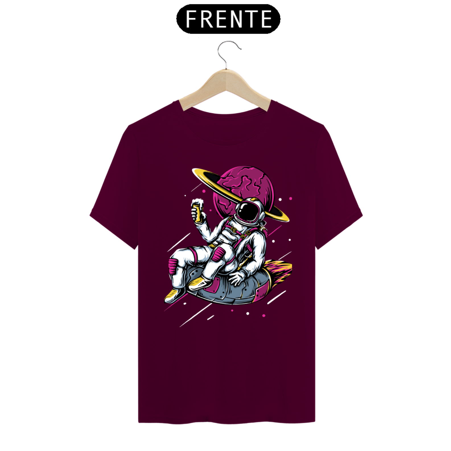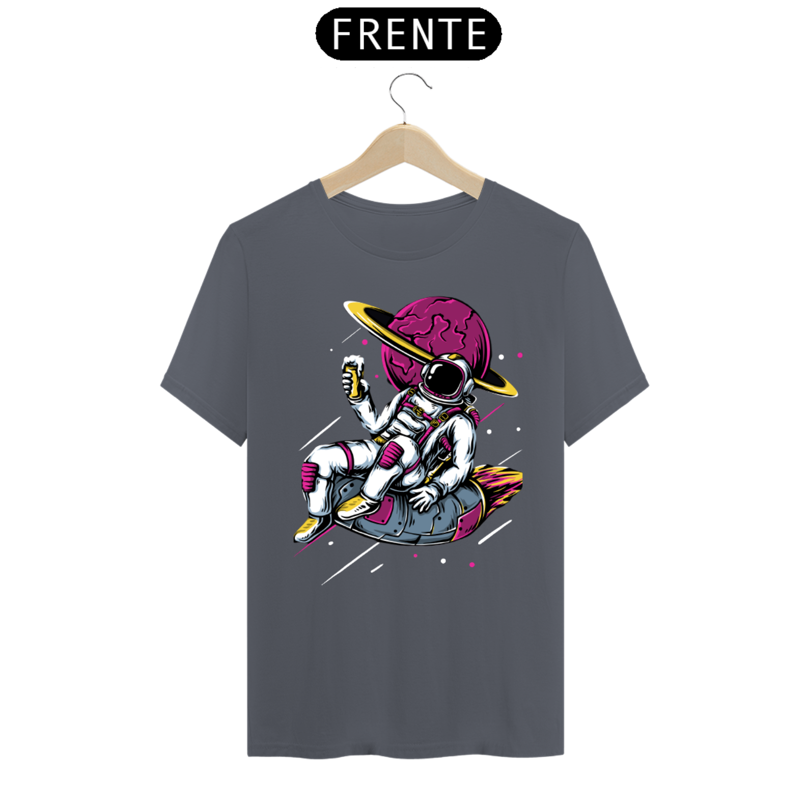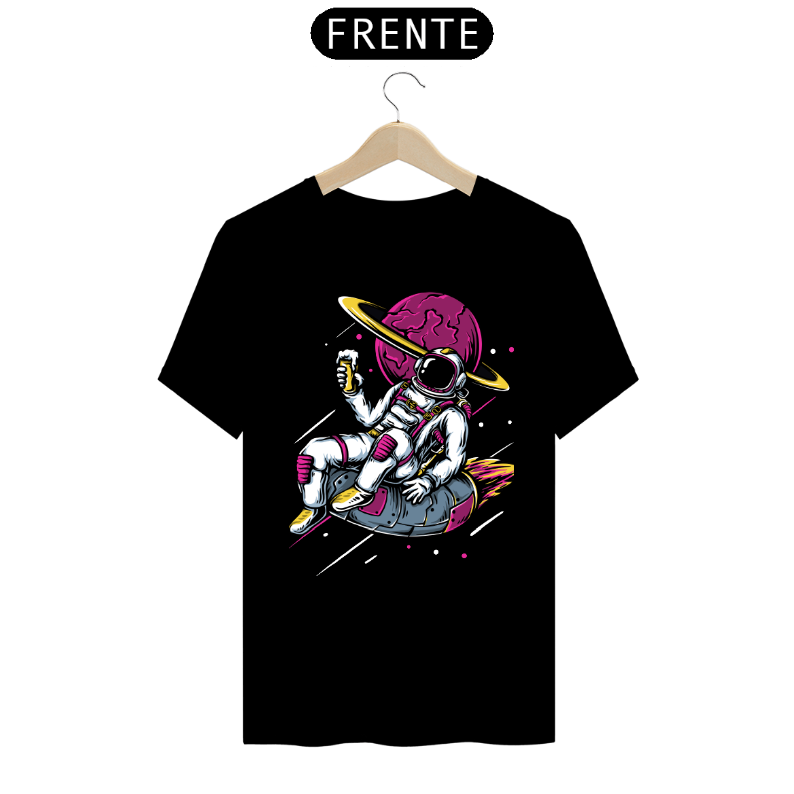 No centro da camiseta, um astronauta em traje espacial completo é retratado flutuando em um cenário celestial. A pose calma e determinada do astronauta transmite a sensação de exploração e coragem que caracteriza aqueles que se aventuram no desconhecido.