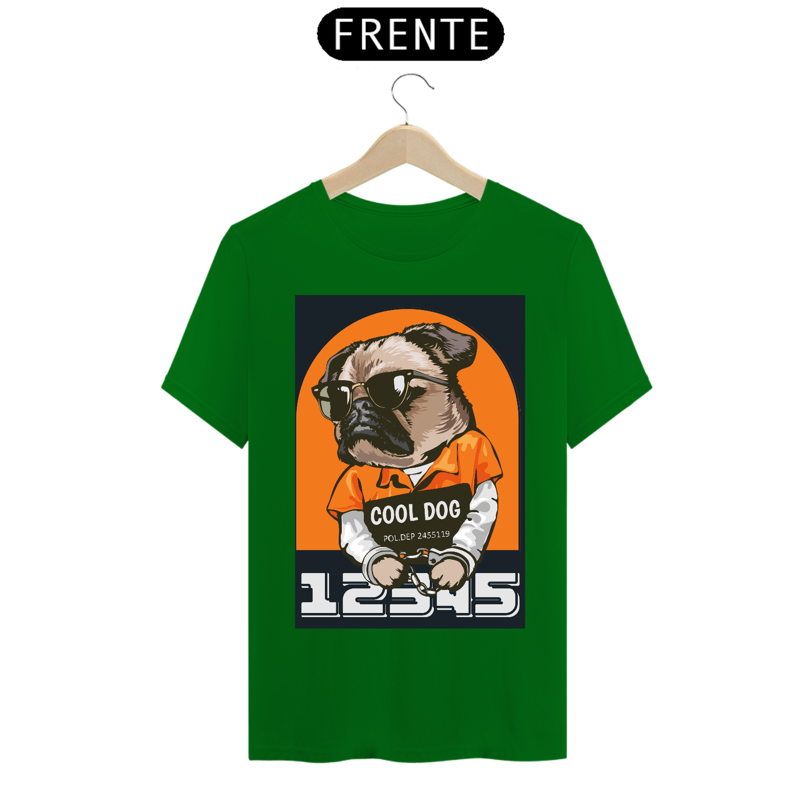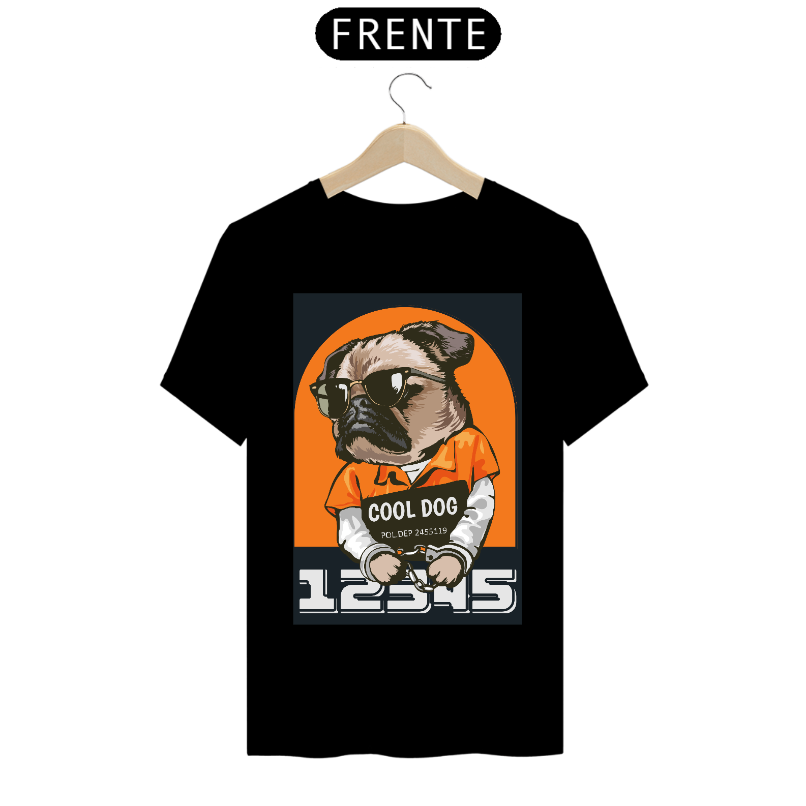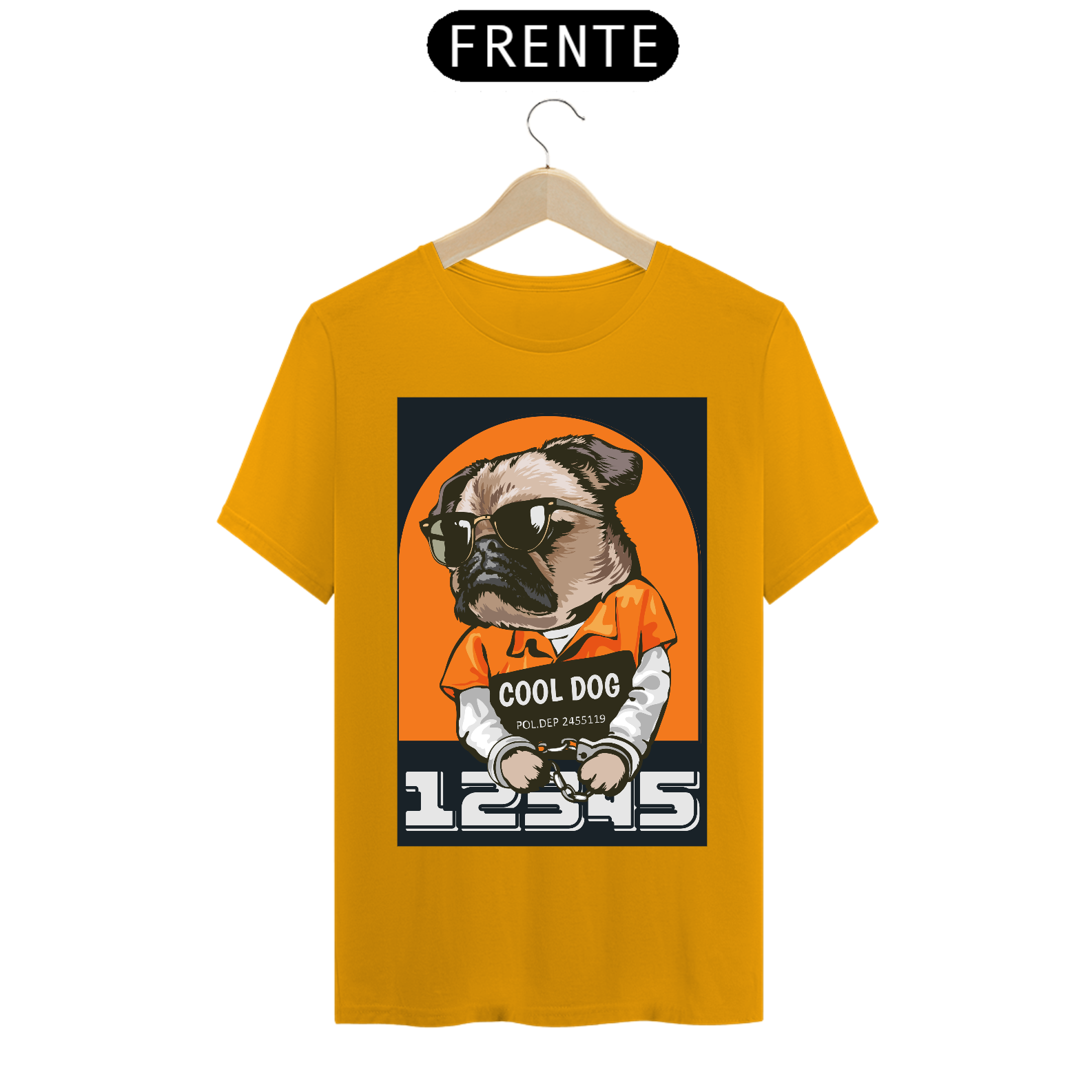 No centro da camiseta, você encontrará um cão simpático retratado em uma pose descontraída e confiante. Ele usa óculos de sol elegantes e uma camisa descolada, transmitindo uma atitude relaxada e cheia de estilo. Sua expressão é cheia de carisma, como se ele estivesse pronto para qualquer aventura