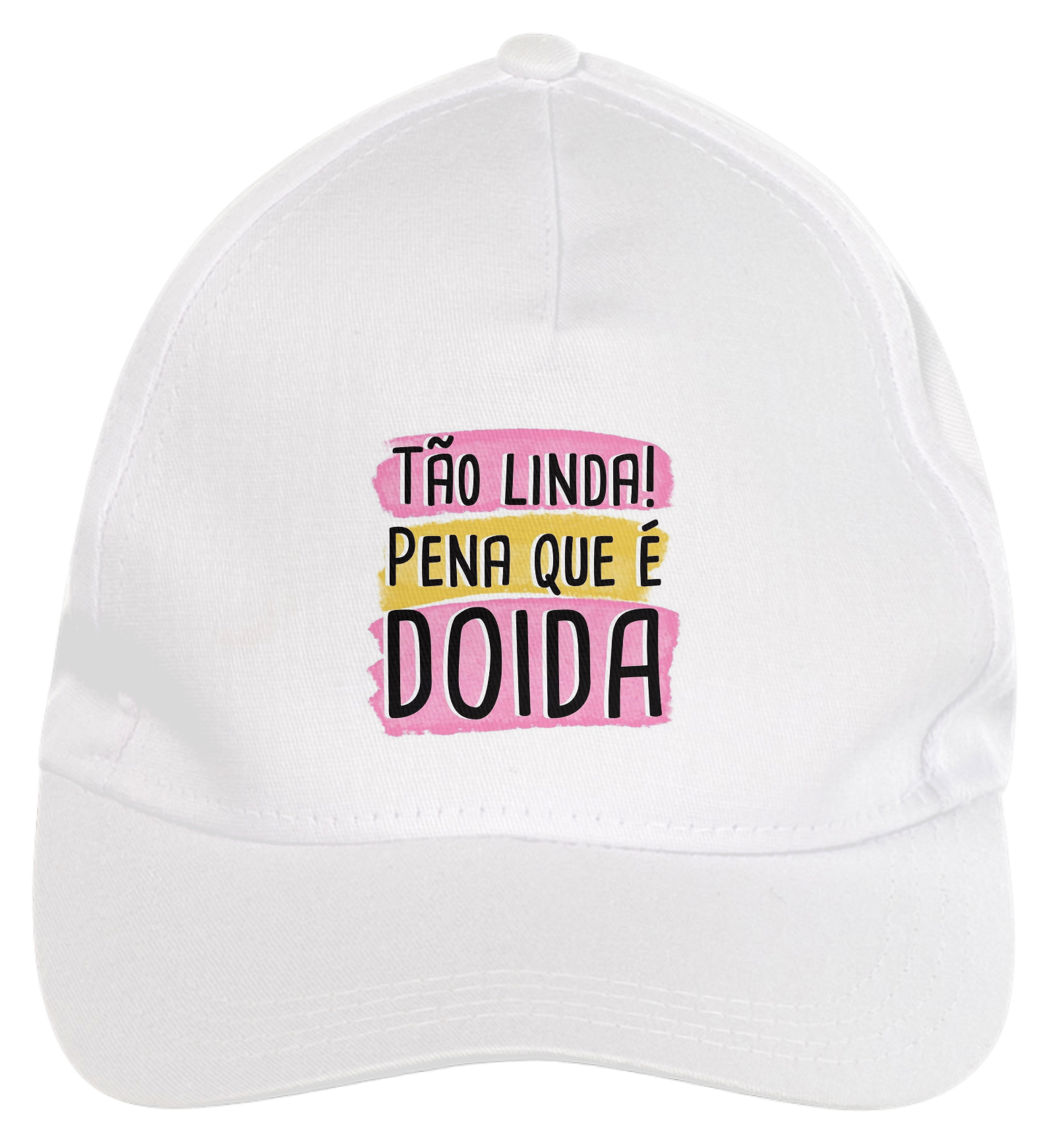 Boné americano com transfer frontal em alta qualidade, aba curva e fecho em tira totalmente regulável com pinos. O modelo veste tamanho "único".