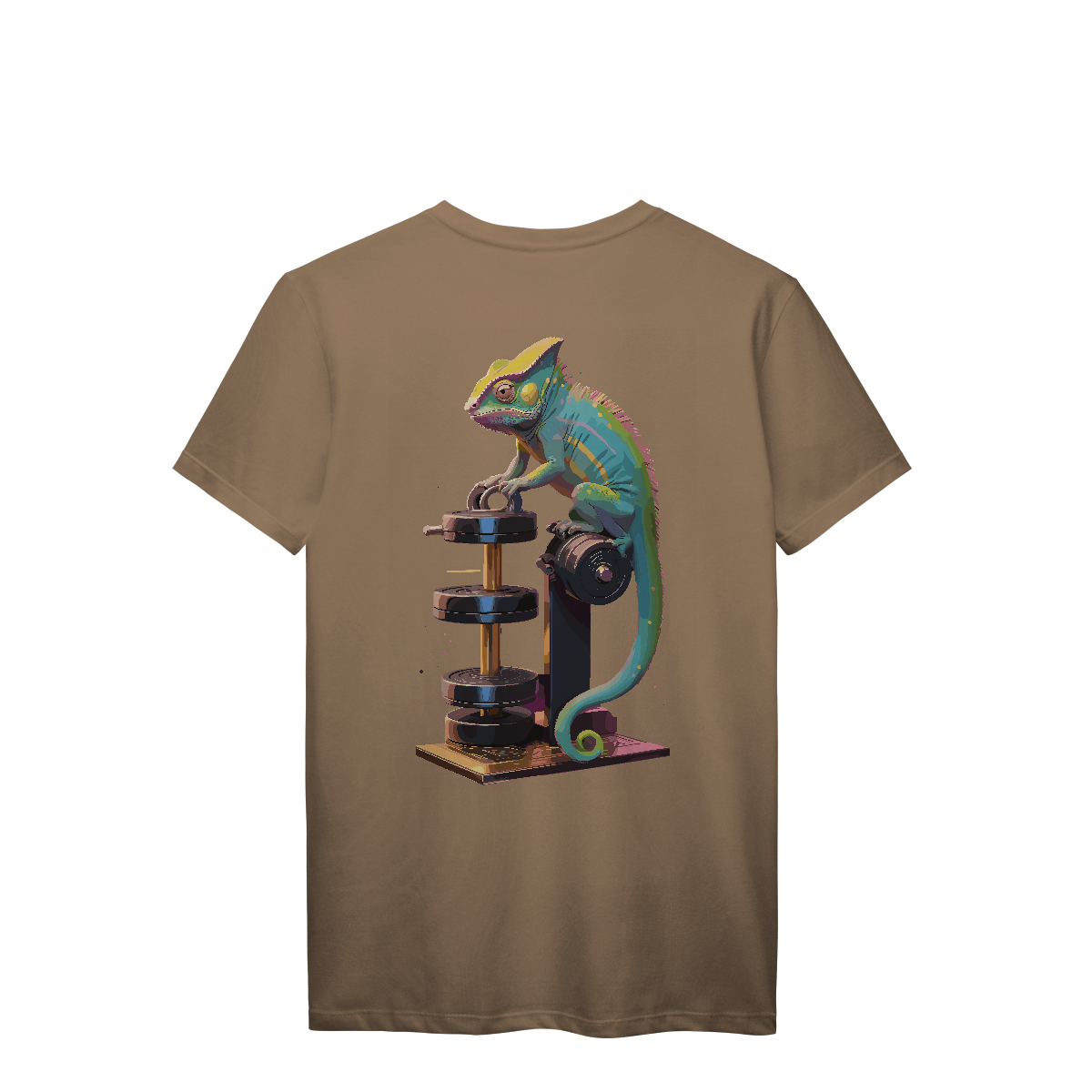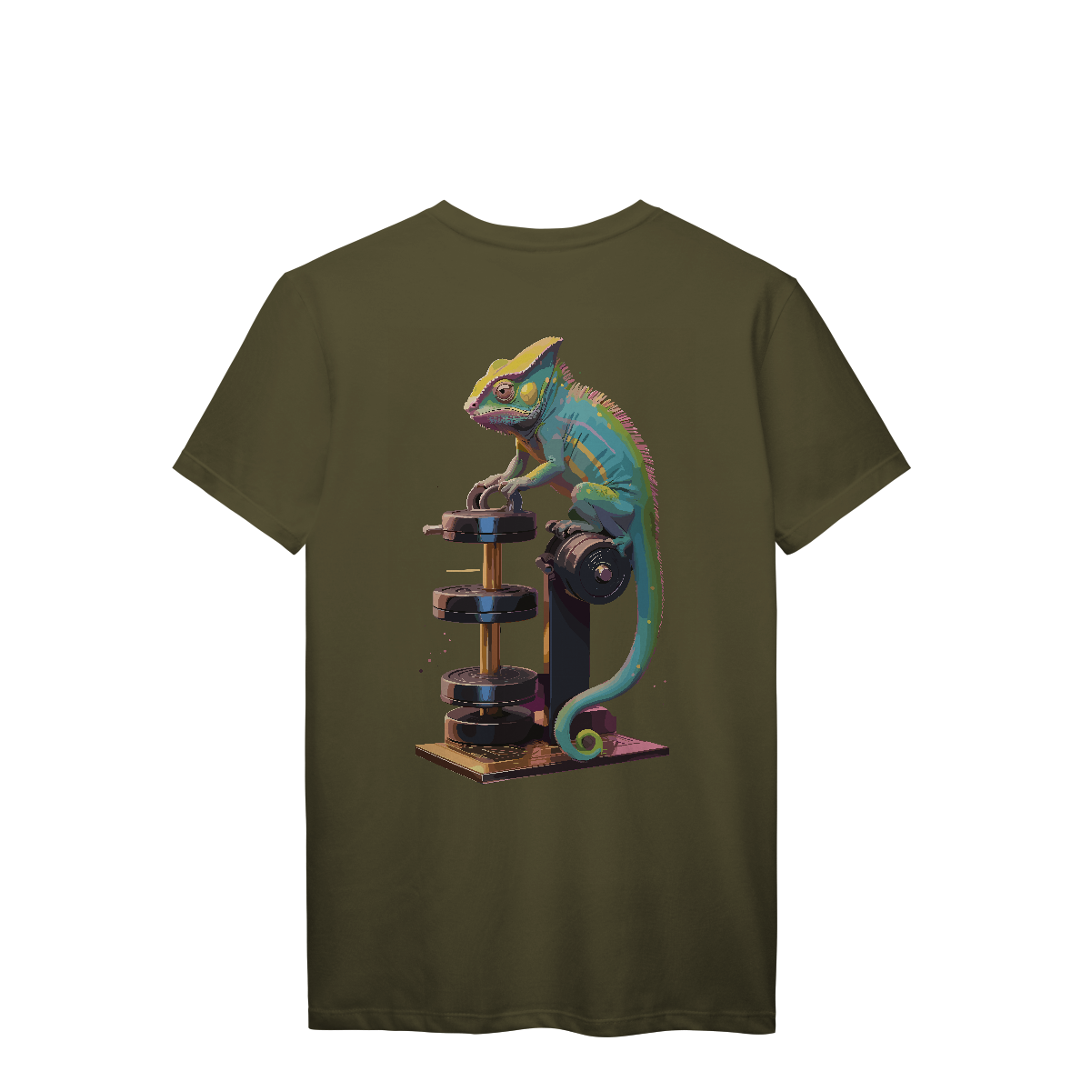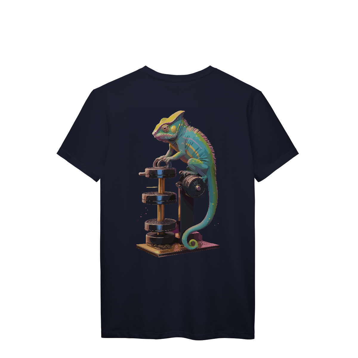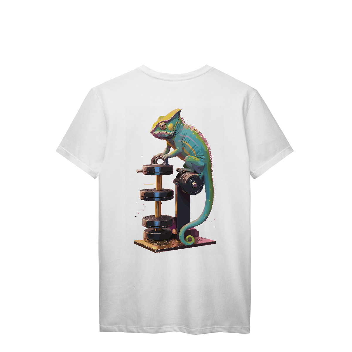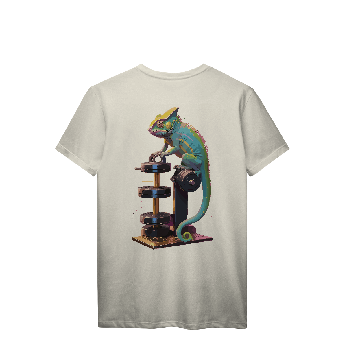 Disfarçado no ambiente, mas sempre pronto pra surpreender. Esse camaleão encara os pesos com foco total e muda de cor conforme a intensidade do treino! Uma estampa vibrante e irônica, perfeita pra quem se adapta a qualquer rotina — menos a de ficar parado.