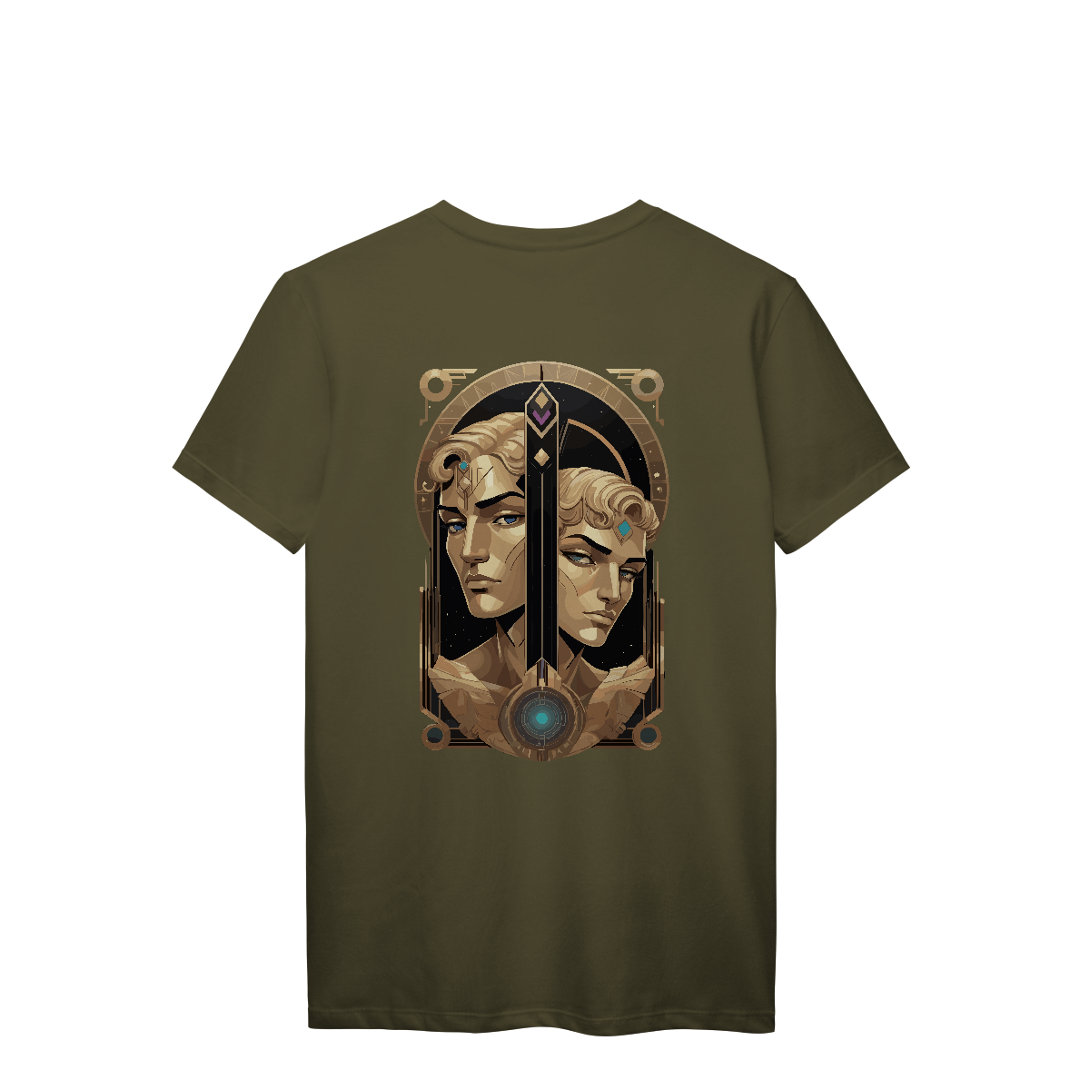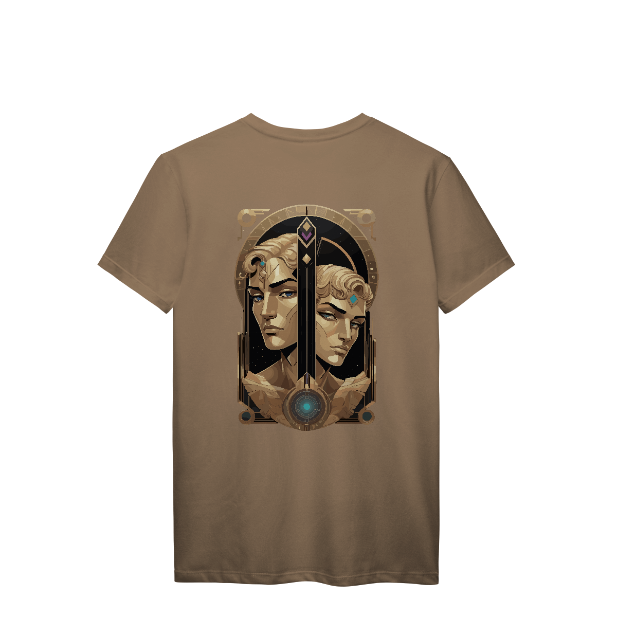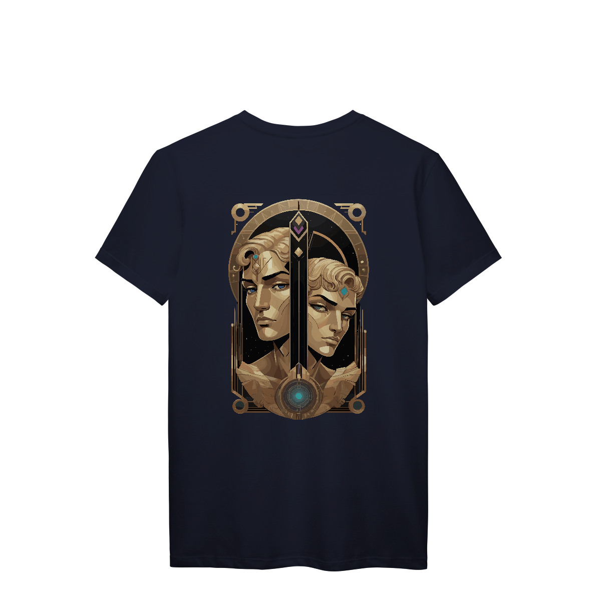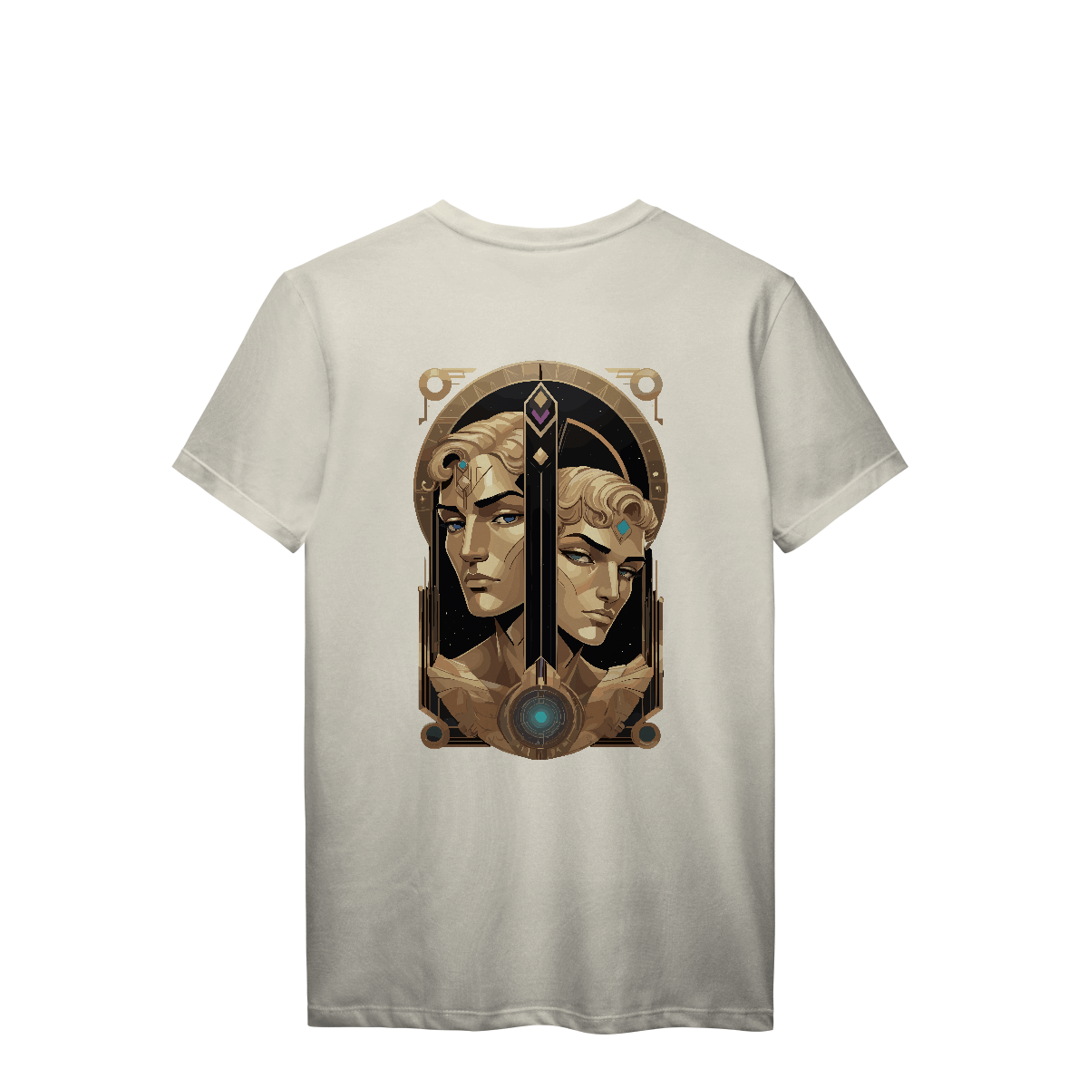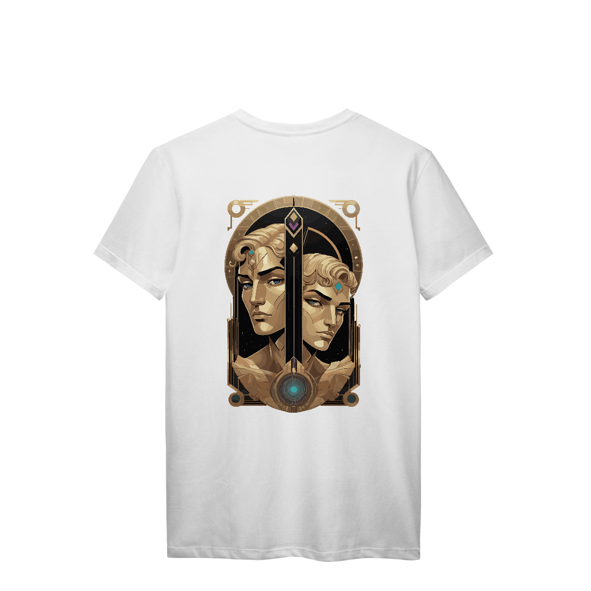 Há vozes que se cruzam no vento, pensamentos que se movem em espelhos infinitos. Eco dos Dois Mundos traz o símbolo de Gêmeos entre espirais e símbolos ocultos, com tons dourados que capturam a luz da curiosidade eterna. Uma estampa para os que vivem entre realidades, carregando no peito a sabedoria do caos.