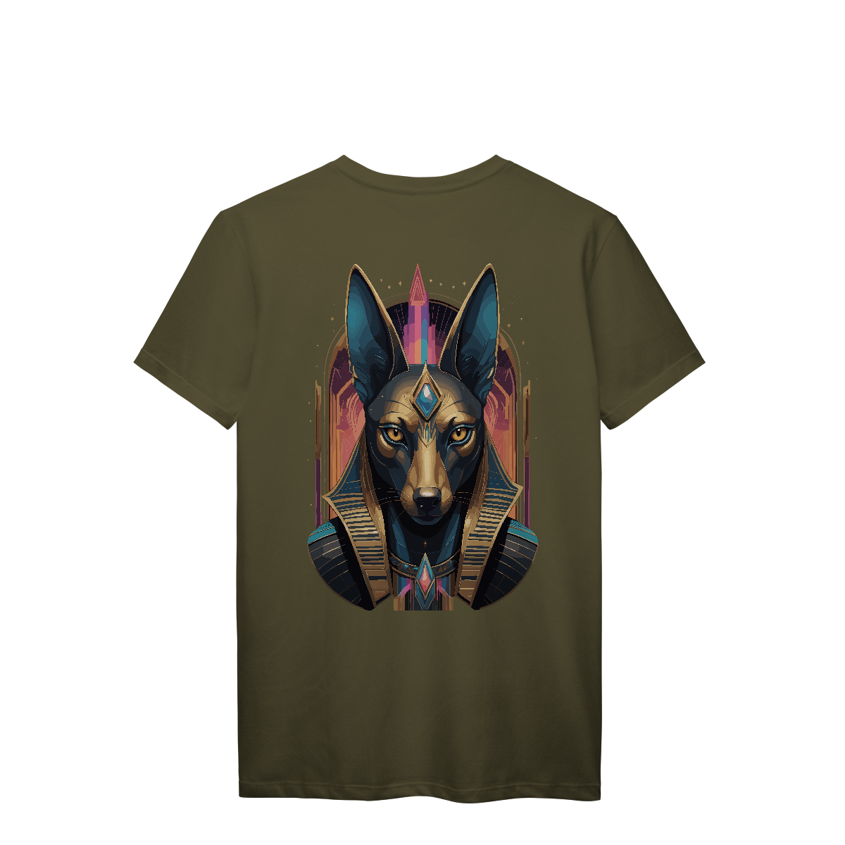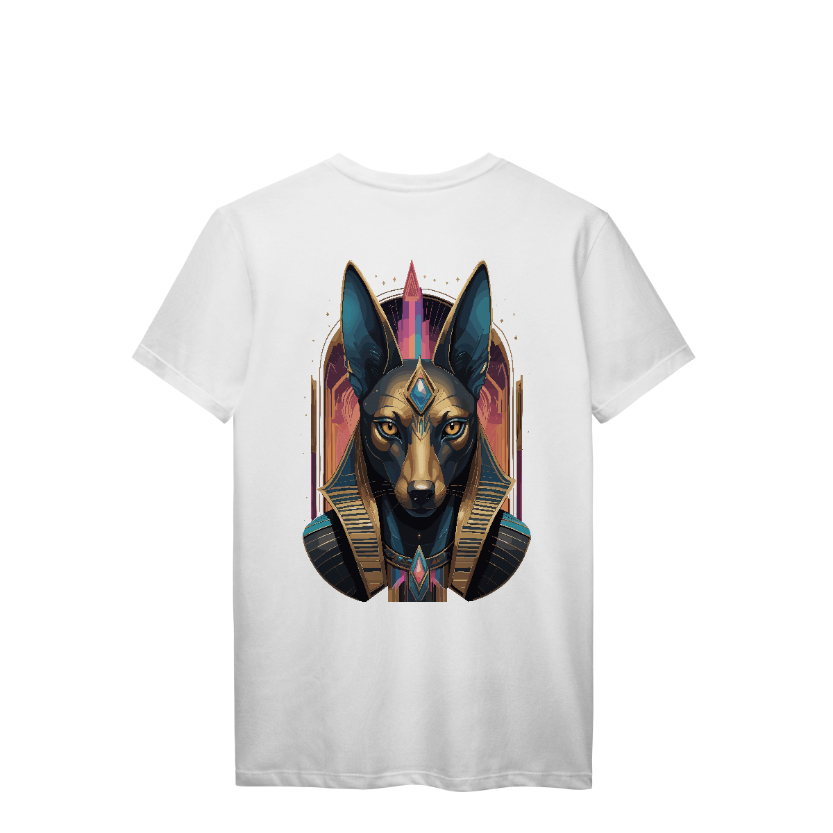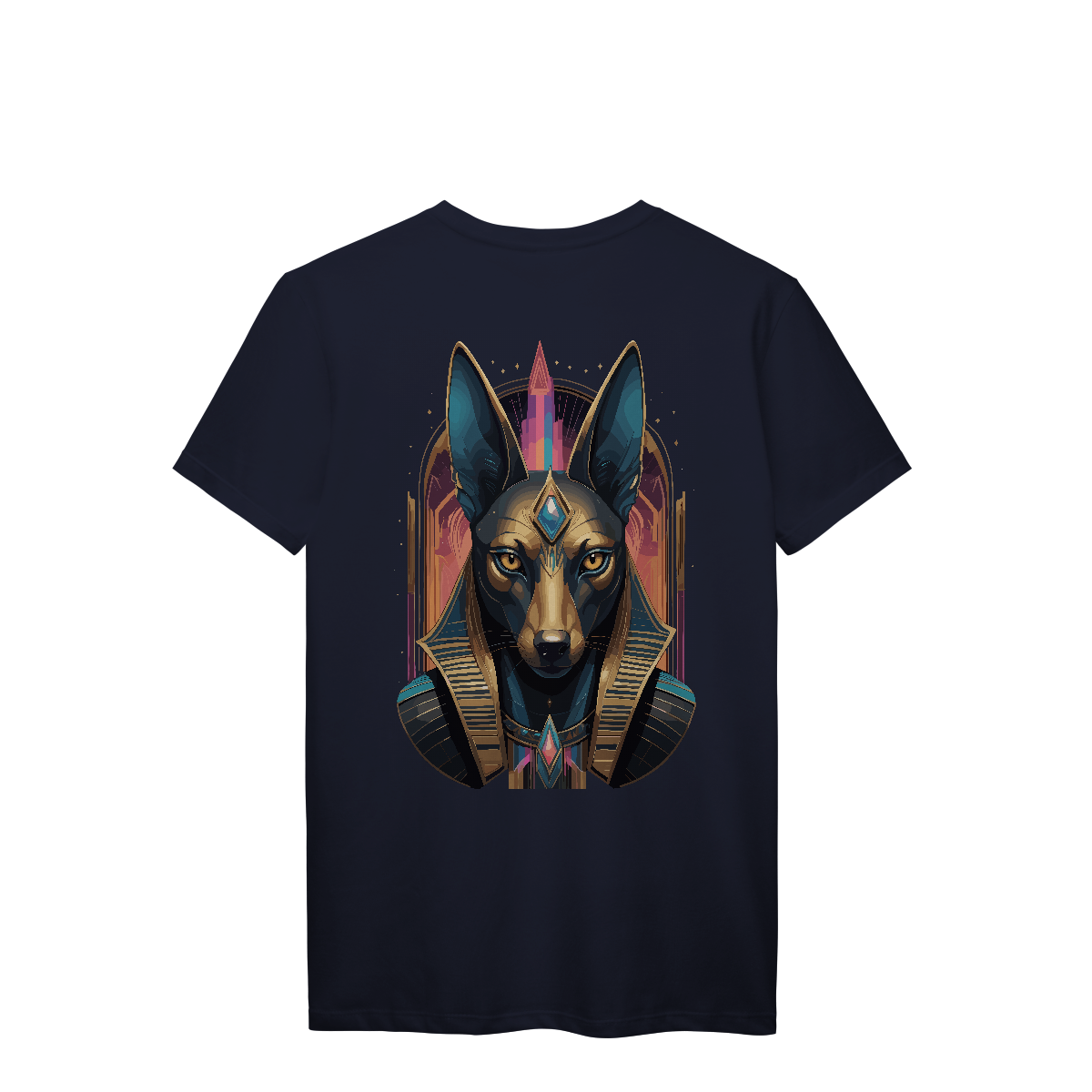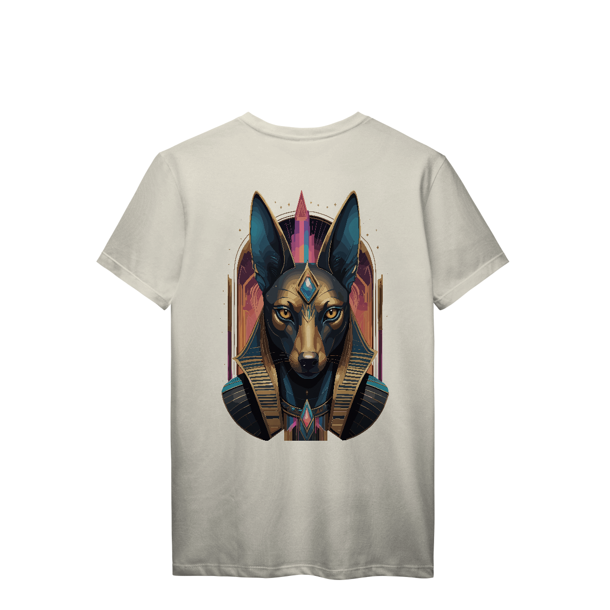 Com cabeça de chacal e postura imponente, Anúbis vigia a travessia entre mundos. A estampa em tons dourados e acabamento retrô transmite respeito e mistério, como um antigo ritual impresso no tecido. Uma peça feita para os que abraçam o oculto e caminham com firmeza entre luz e escuridão.