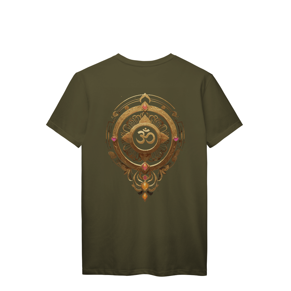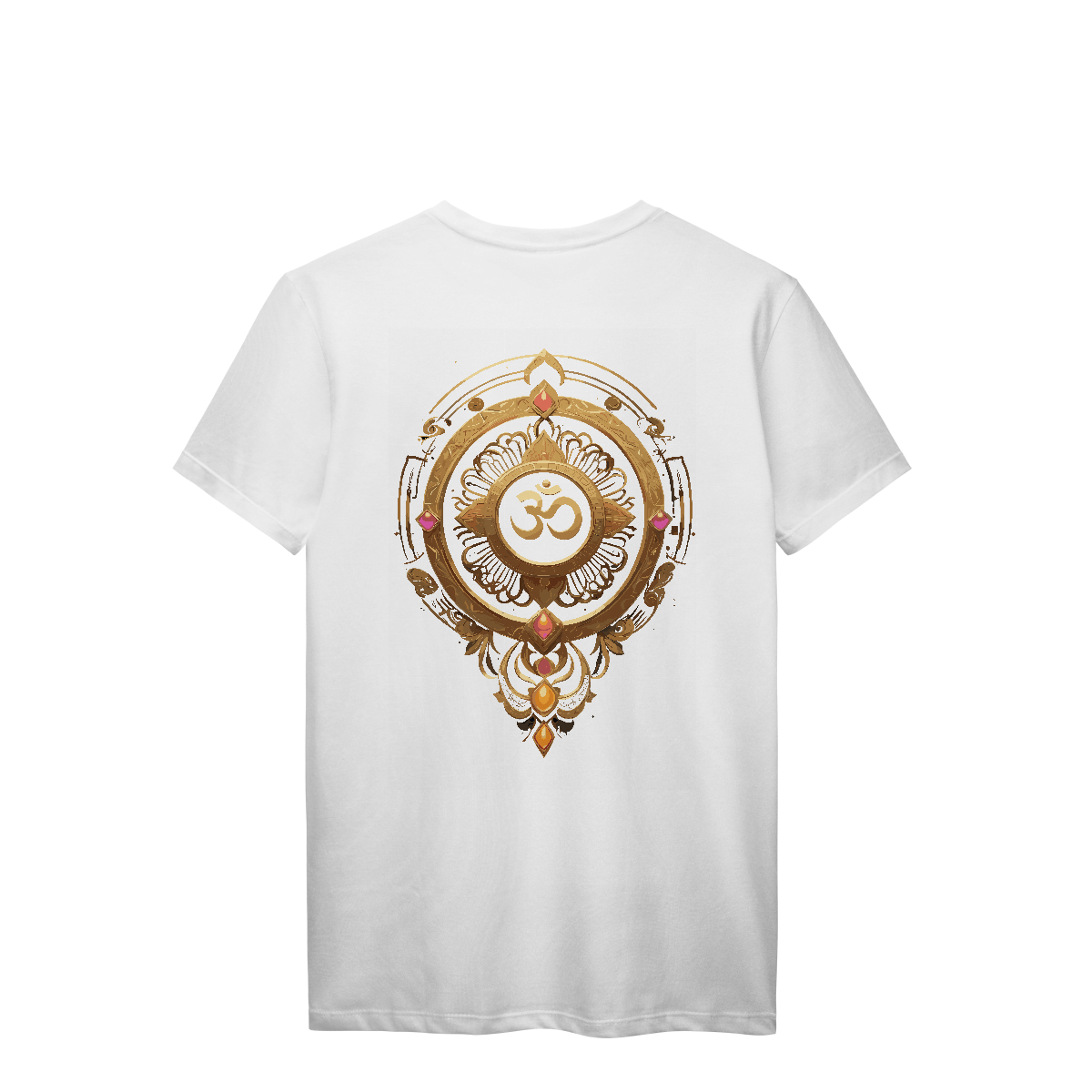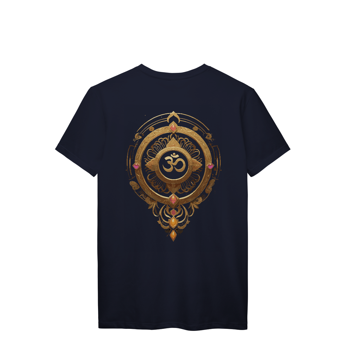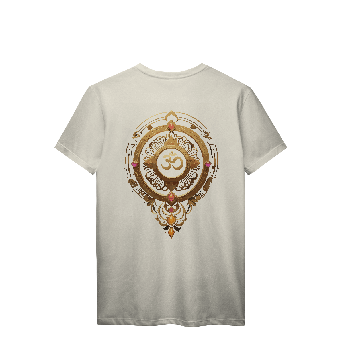 Mais que um som, um estado de consciência. O Om aparece aqui em traços sutis, envolto por mandalas e detalhes dourados que ecoam sua vibração ancestral. Uma estampa para quem sente a vida além do físico — e veste o silêncio entre um universo e outro.