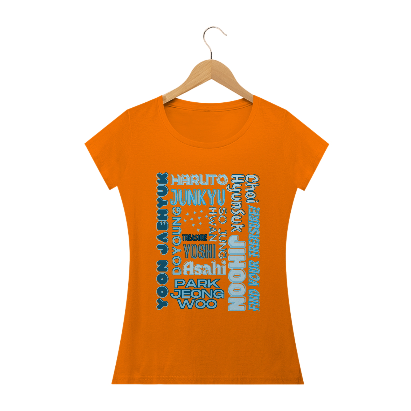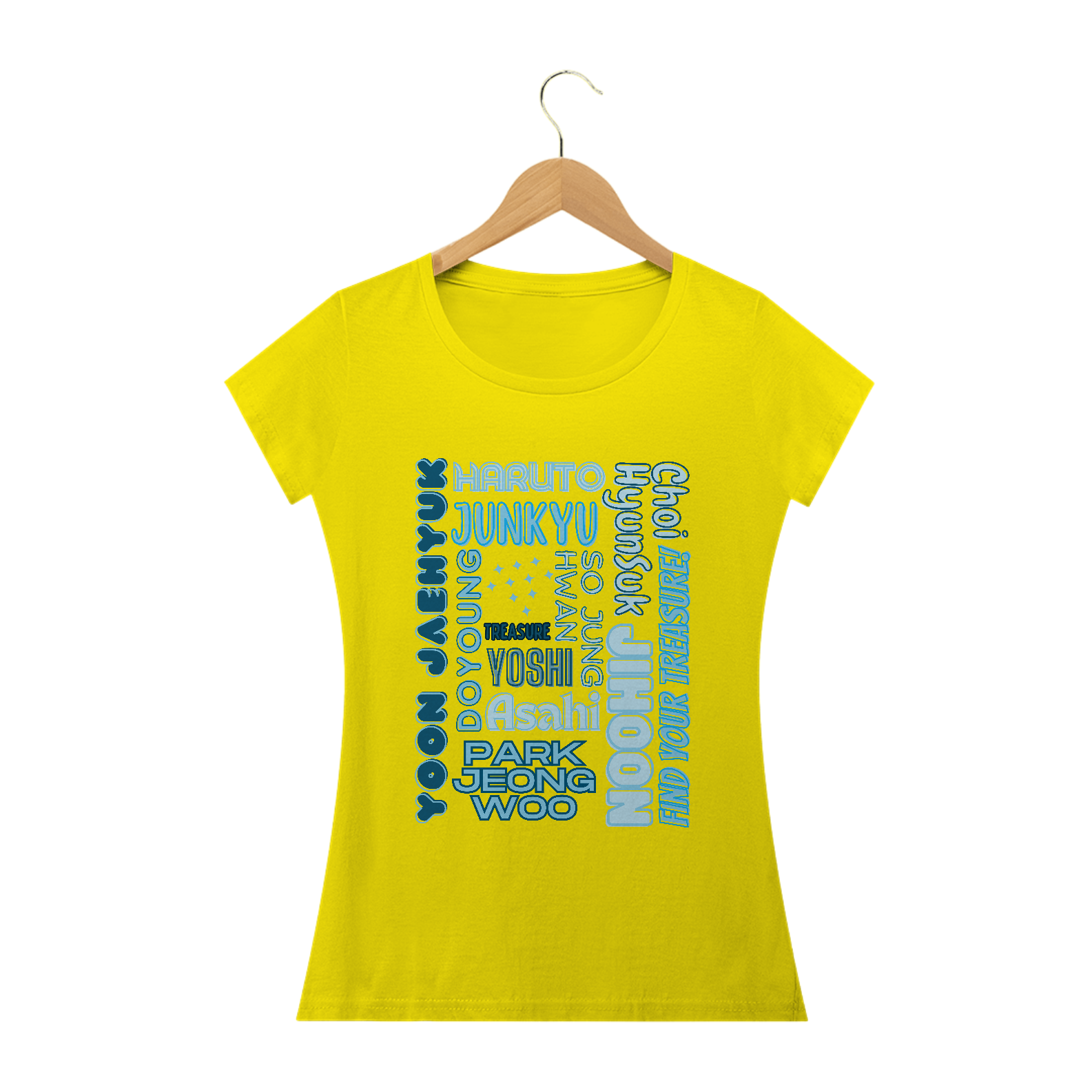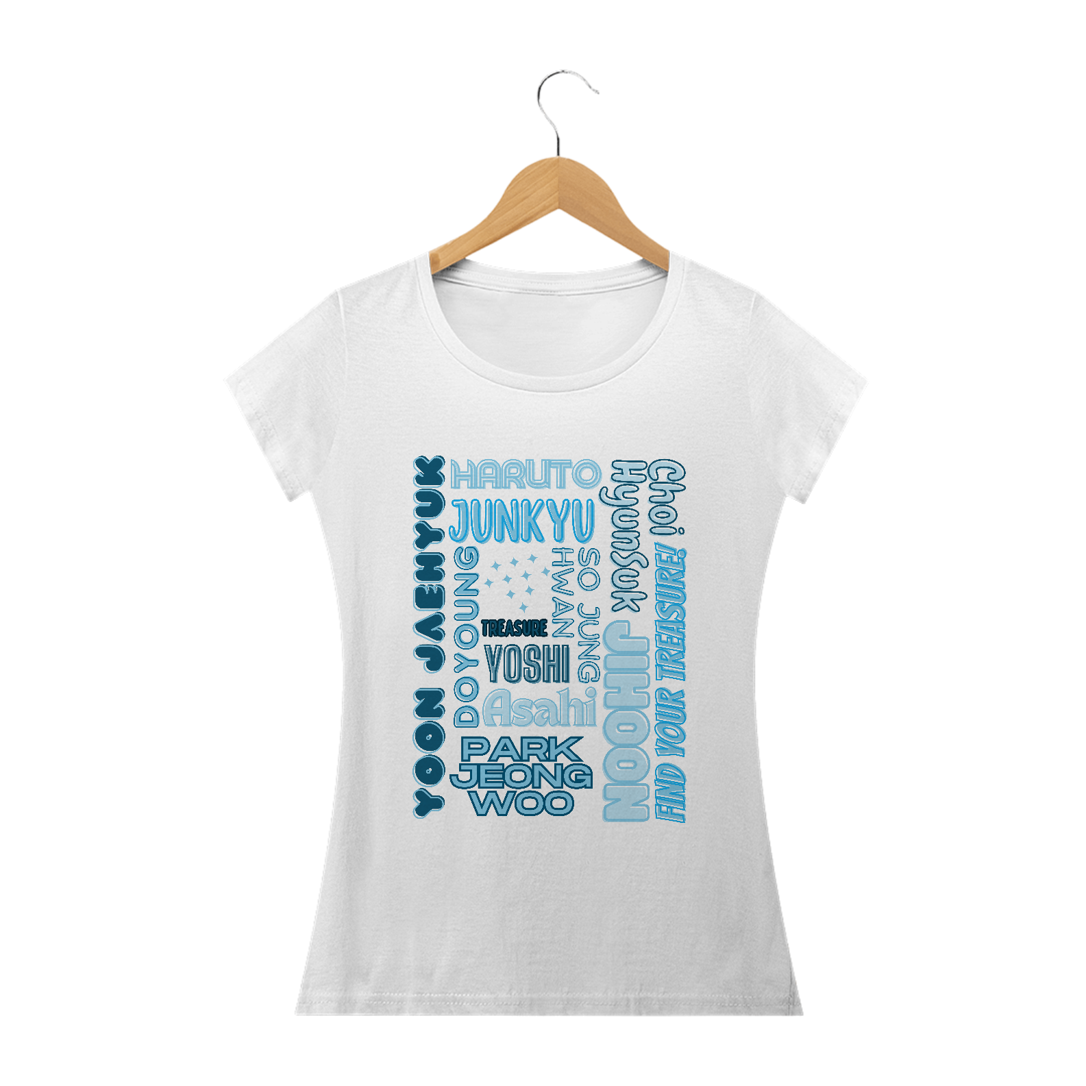 Para as fãs que adoram um toque mais feminino, esta camiseta babylook é perfeita. Com os nomes dos membros do TREASURE em destaque, esta camiseta é a escolha ideal para expressar seu amor pelo grupo de maneira elegante e única. Mostre seu apoio com estilo!