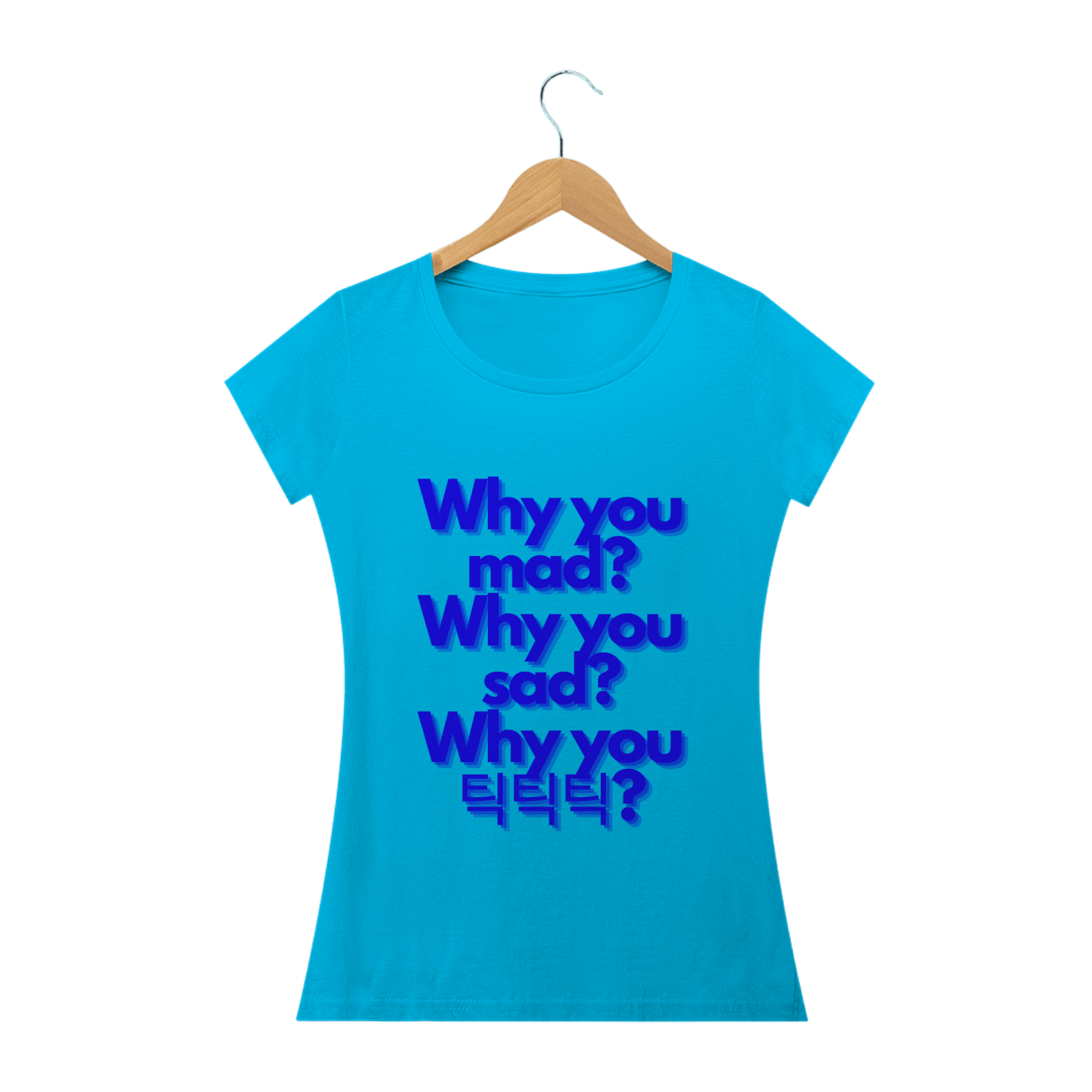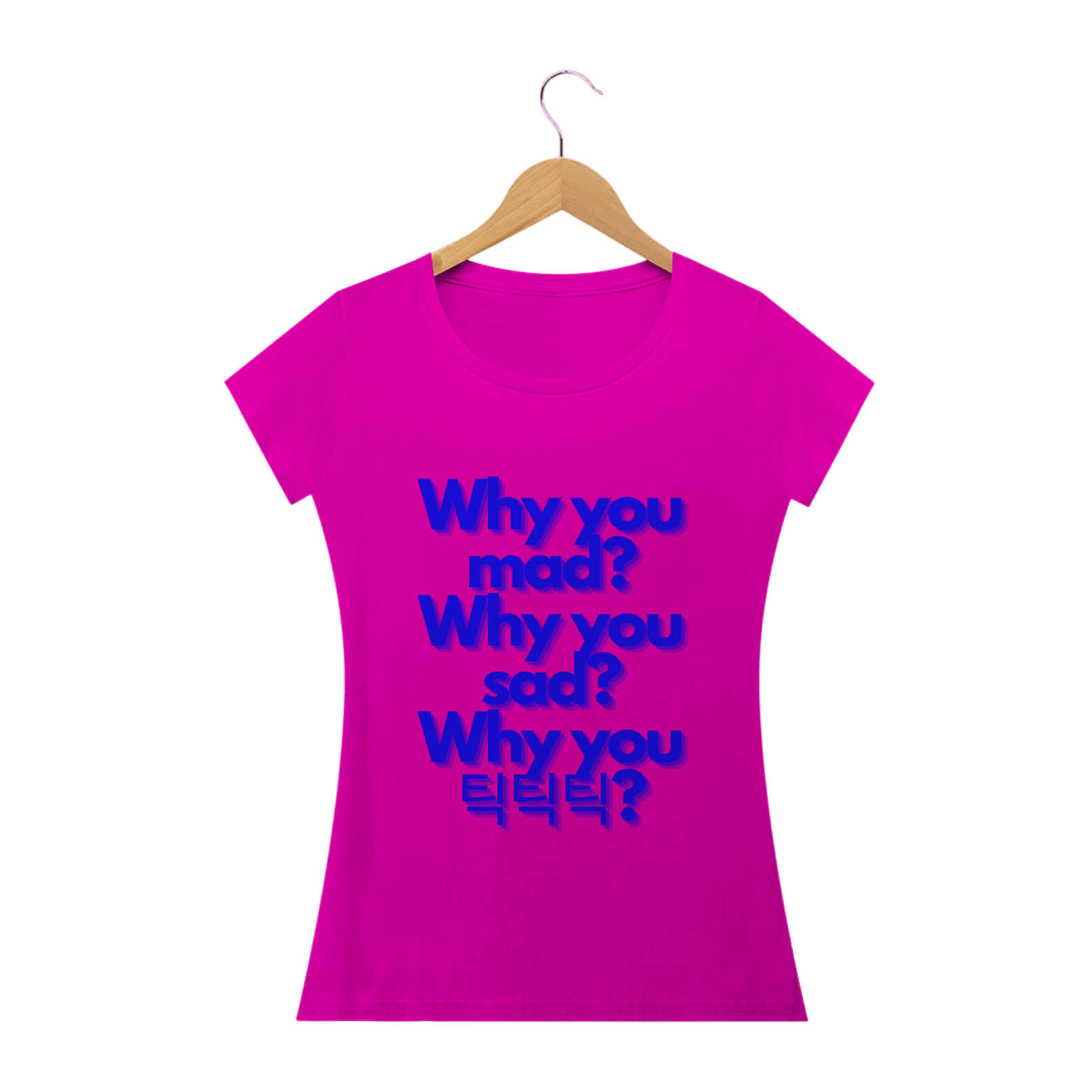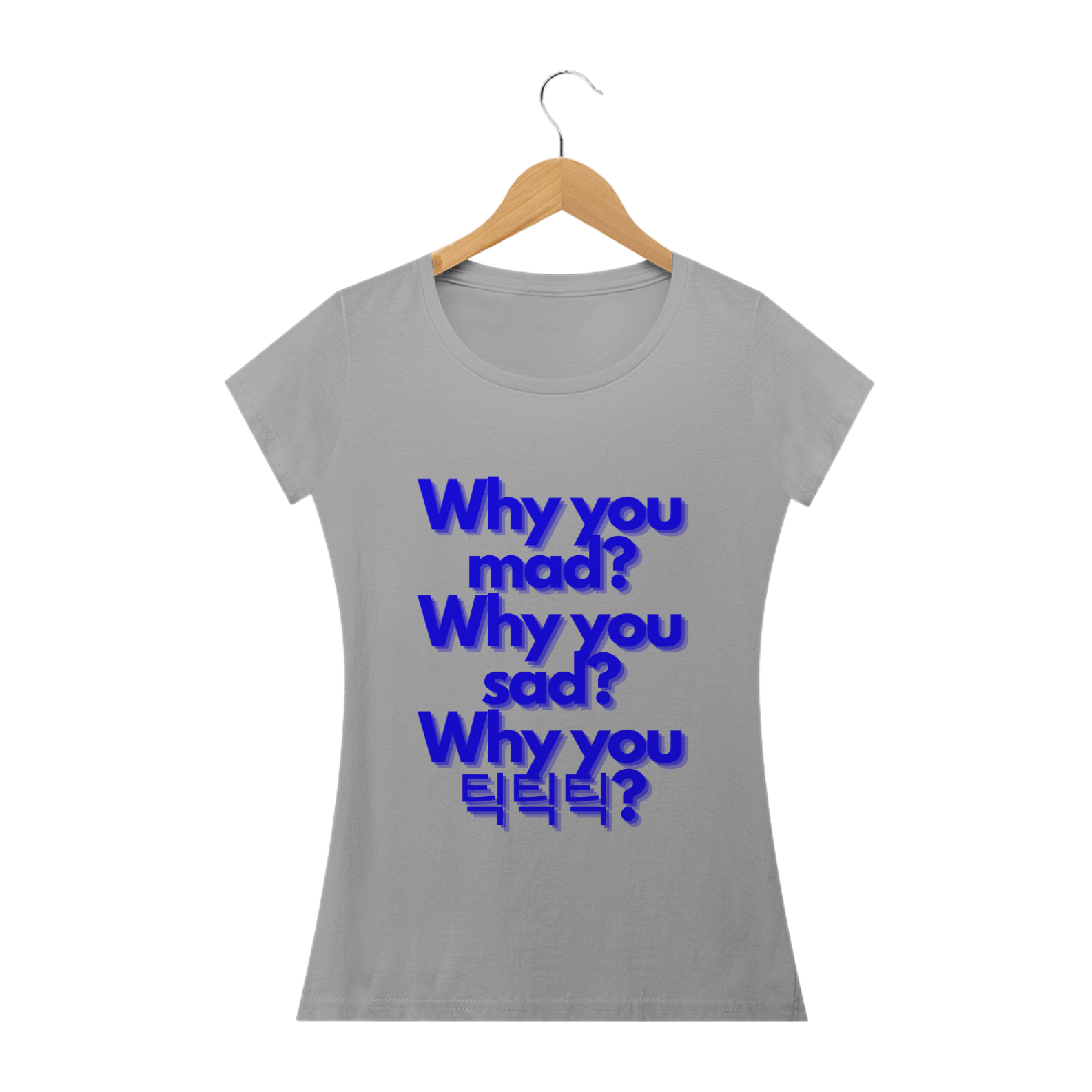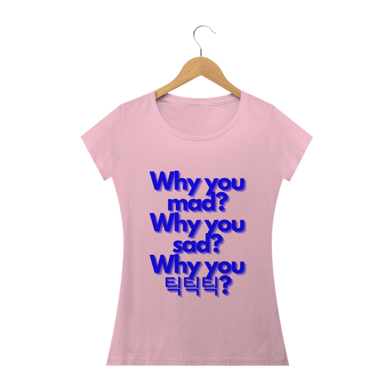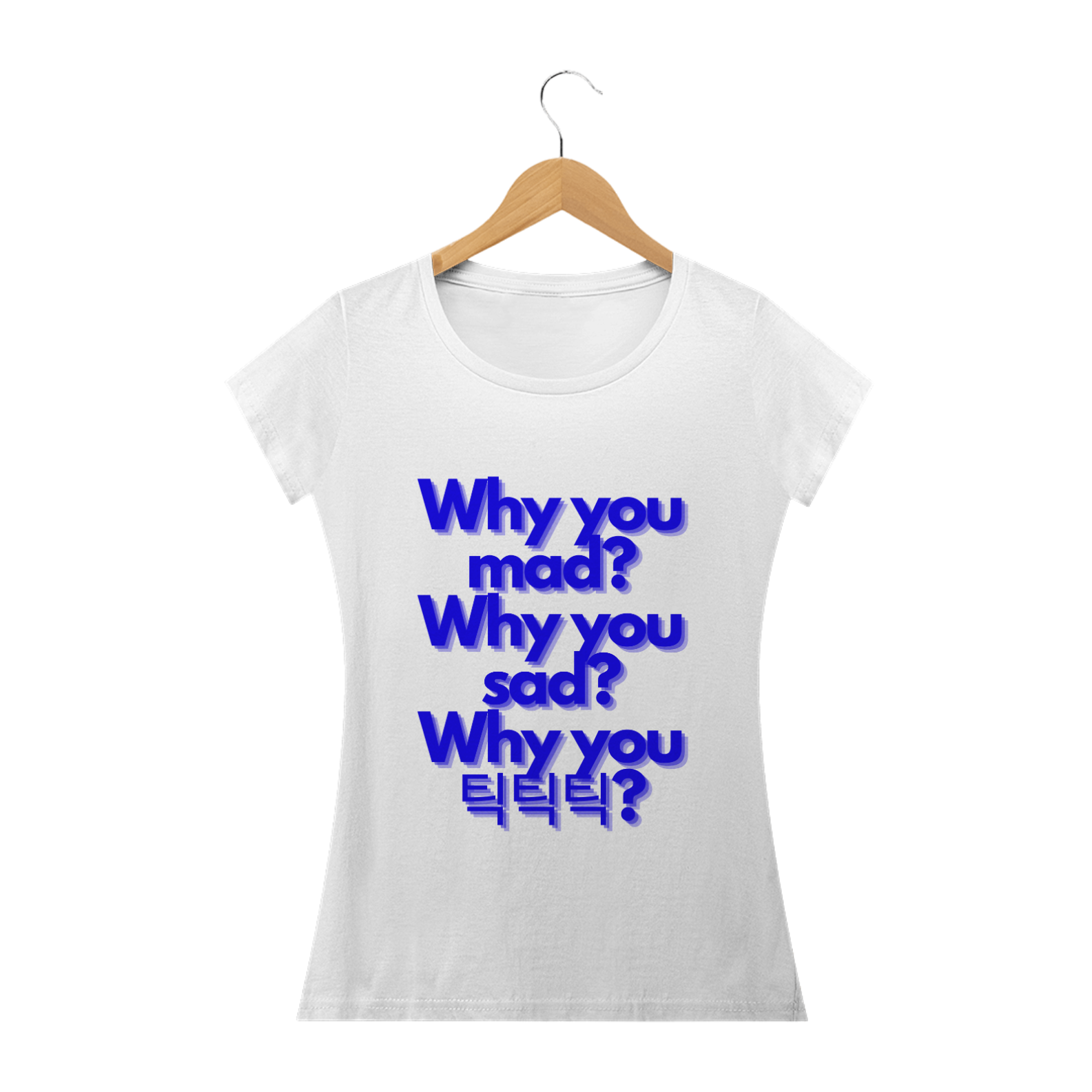 Para as fãs que preferem um visual mais ajustado e feminino, esta camiseta babylook é ideal. Ela exibe a frase "Why you mad? Why you sad? Why you 틱틱틱?" de forma delicada e elegante, oferecendo um toque de estilo feminino à sua paixão pela música. Confortável e cheia de personalidade, esta camiseta é perfeita para qualquer ocasião.