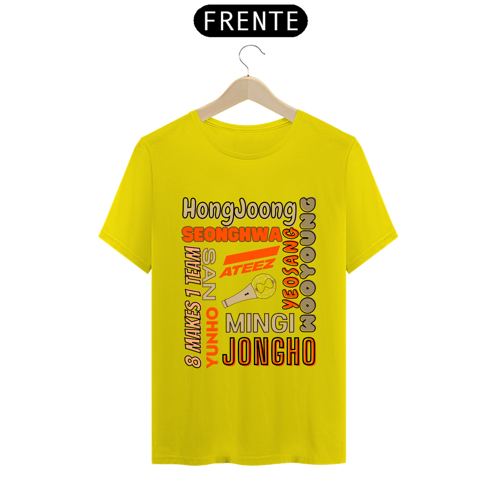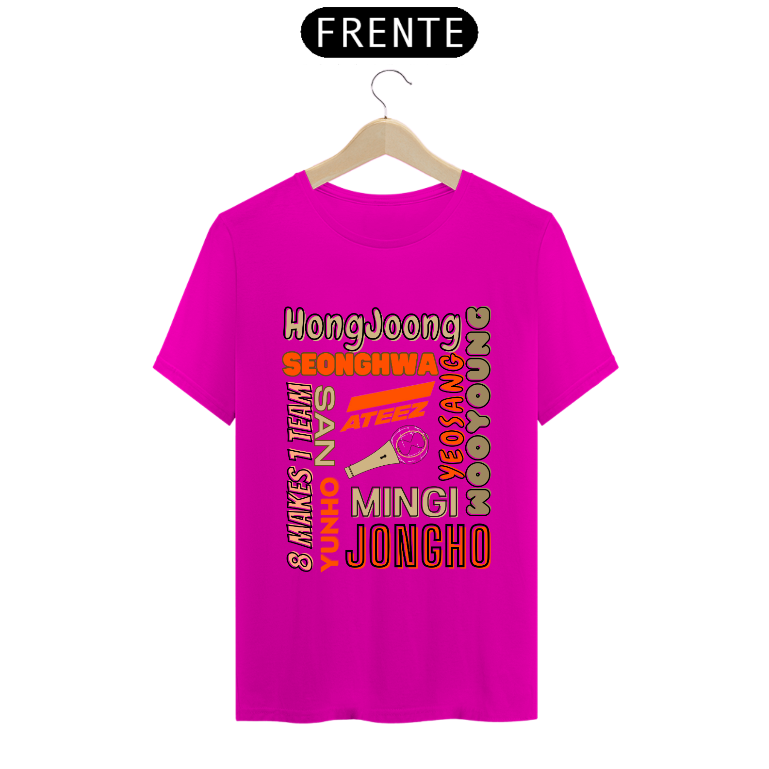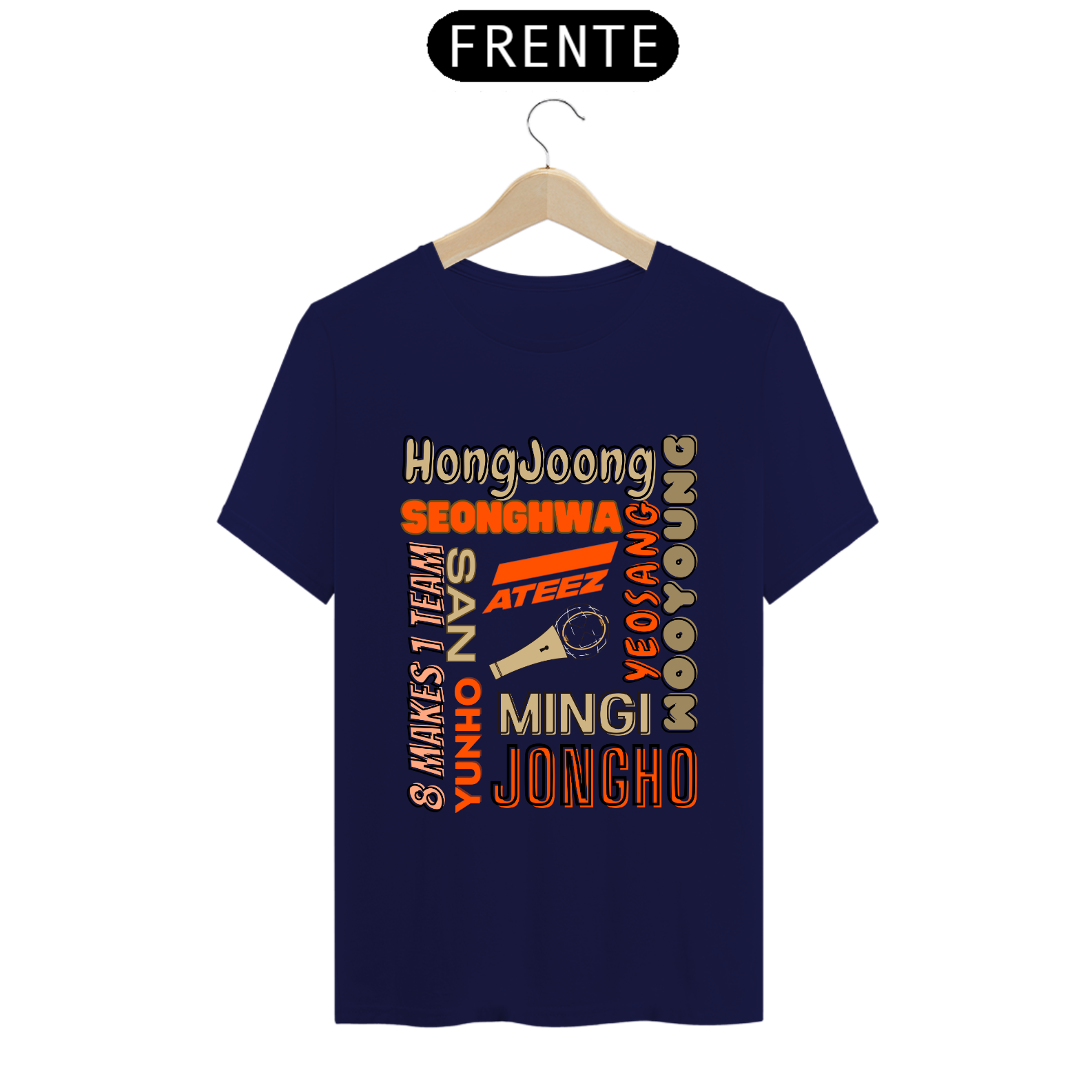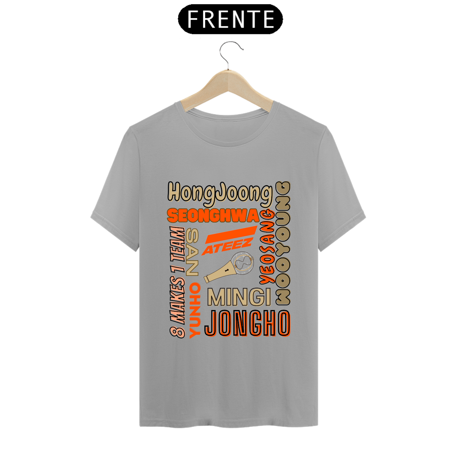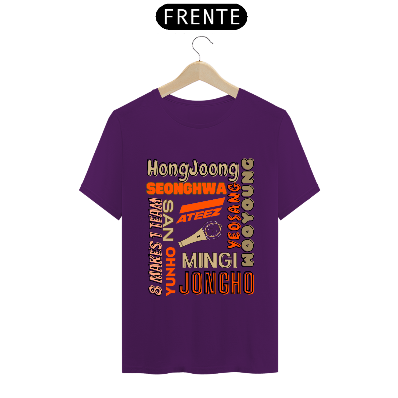 Esta camiseta é perfeita para os fãs do ATEEZ! Apresentando os nomes dos talentosos membros do grupo K-pop em uma estampa elegante e moderna. Mostre seu amor pela música e pelo ATEEZ com estilo usando esta camiseta única.