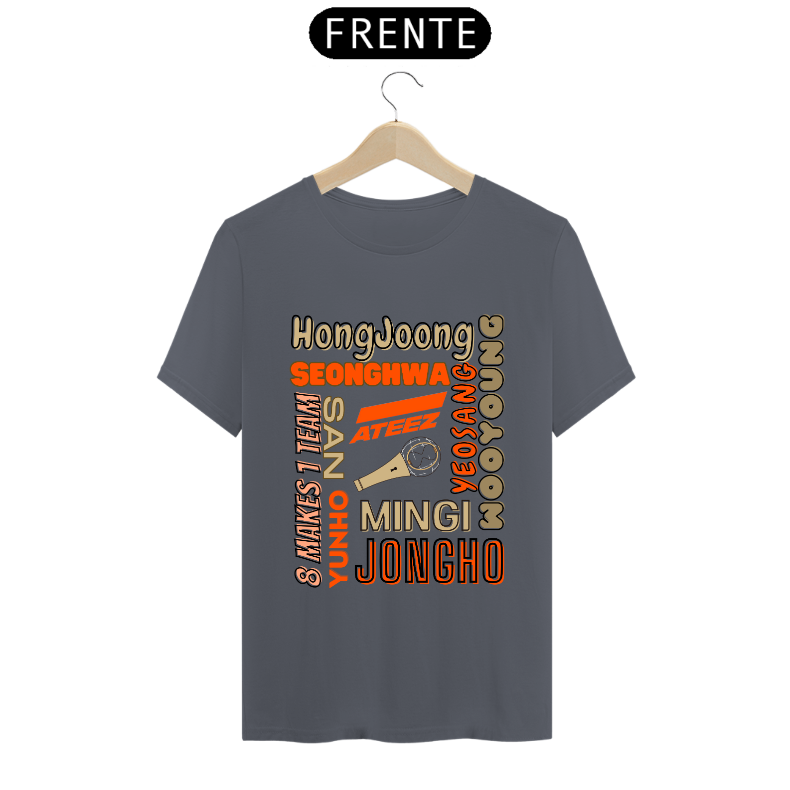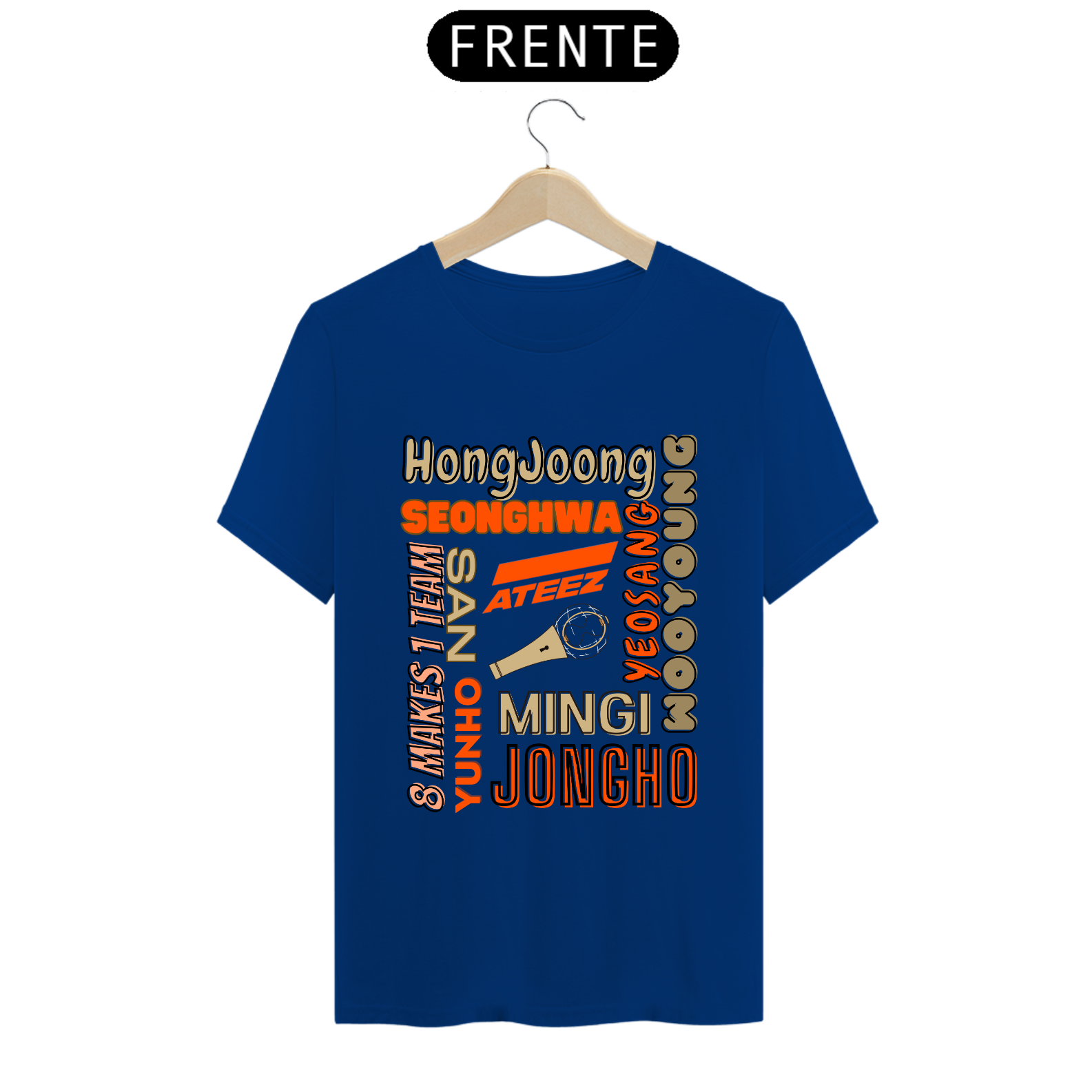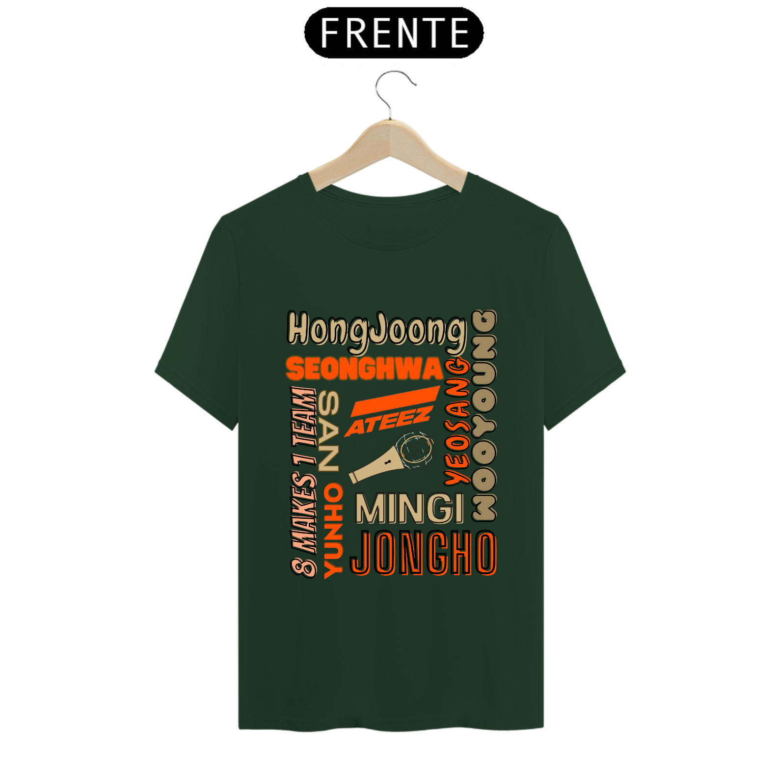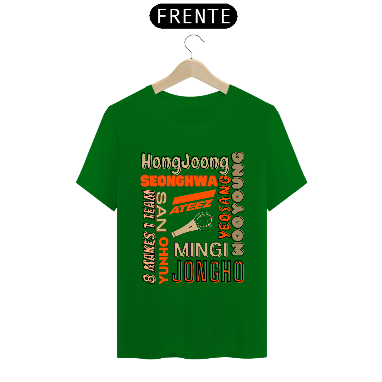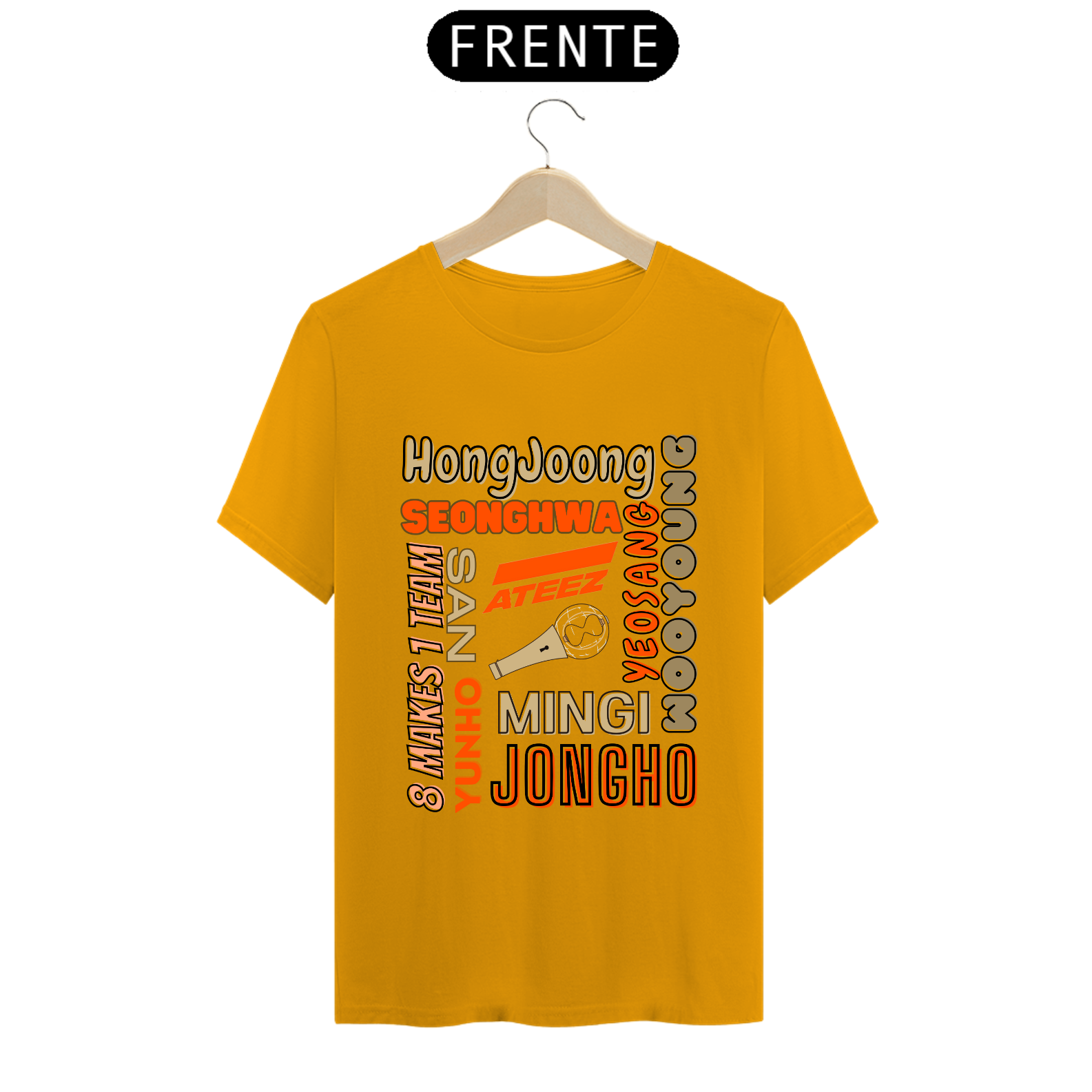 Esta camiseta é perfeita para os fãs do ATEEZ! Apresentando os nomes dos talentosos membros do grupo K-pop em uma estampa elegante e moderna. Mostre seu amor pela música e pelo ATEEZ com estilo usando esta camiseta única.