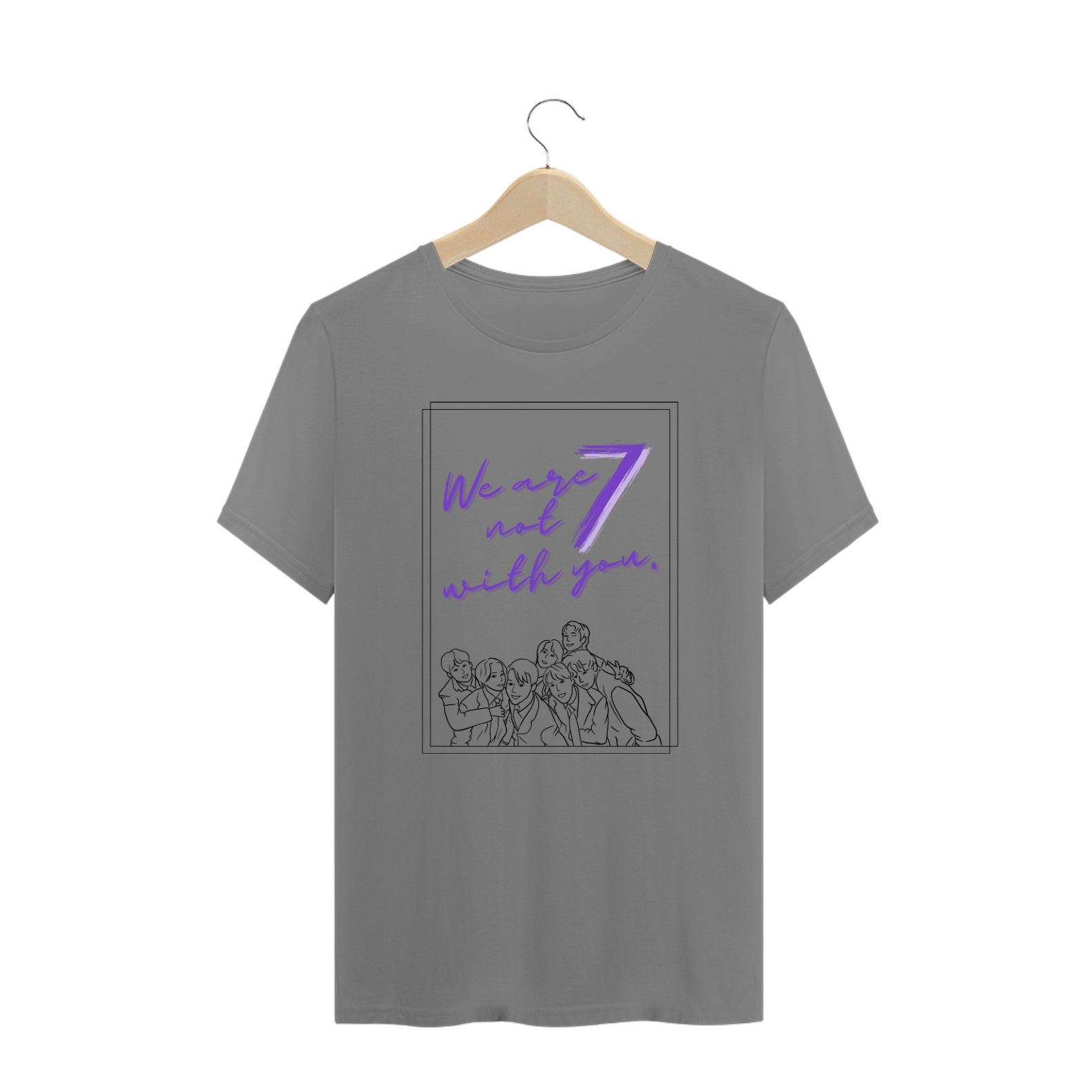 Esta camiseta plus size é perfeita para os ARMYs que desejam mostrar seu apoio ao BTS de forma inclusiva e elegante. Com a frase inspiradora "We are not 7 with you" ao lado das silhuetas dos membros do grupo, esta camiseta celebra a diversidade e a paixão dos fãs de todas as formas e tamanhos.