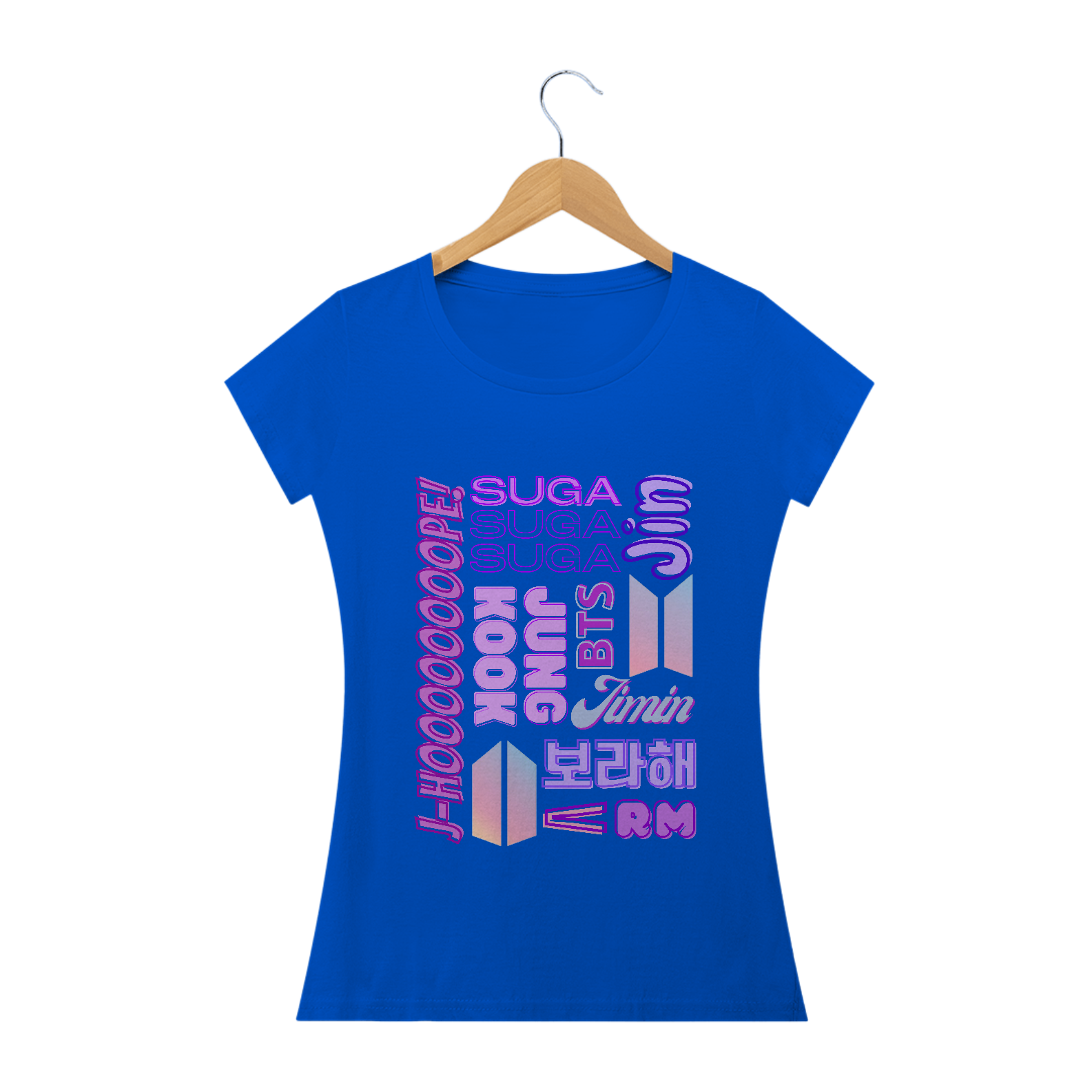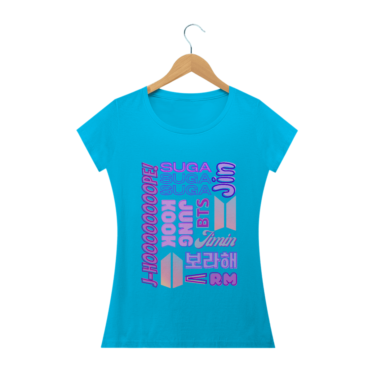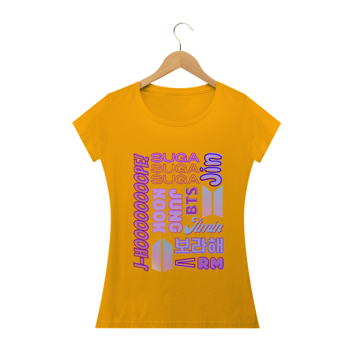 Se você é ARMY que adora um visual mais feminino, esta camiseta babylook é para você! Com os nomes dos sete membros do BTS em um design delicado, esta camiseta foi feita para se ajustar perfeitamente ao seu corpo. Mostre seu amor pelo BTS de uma forma charmosa e elegante.