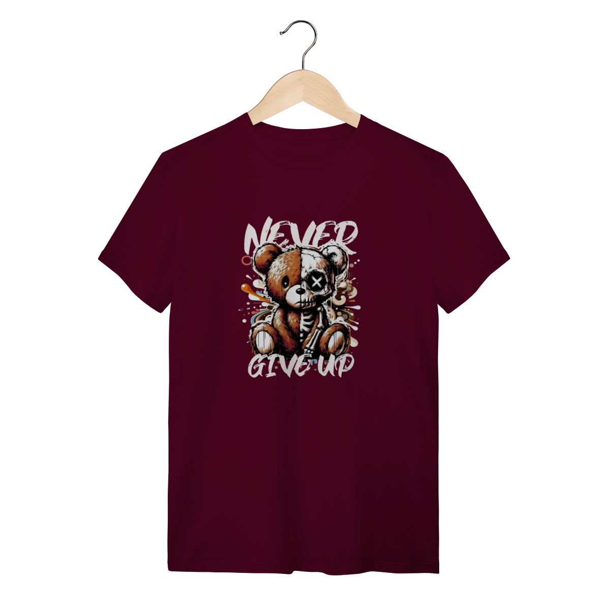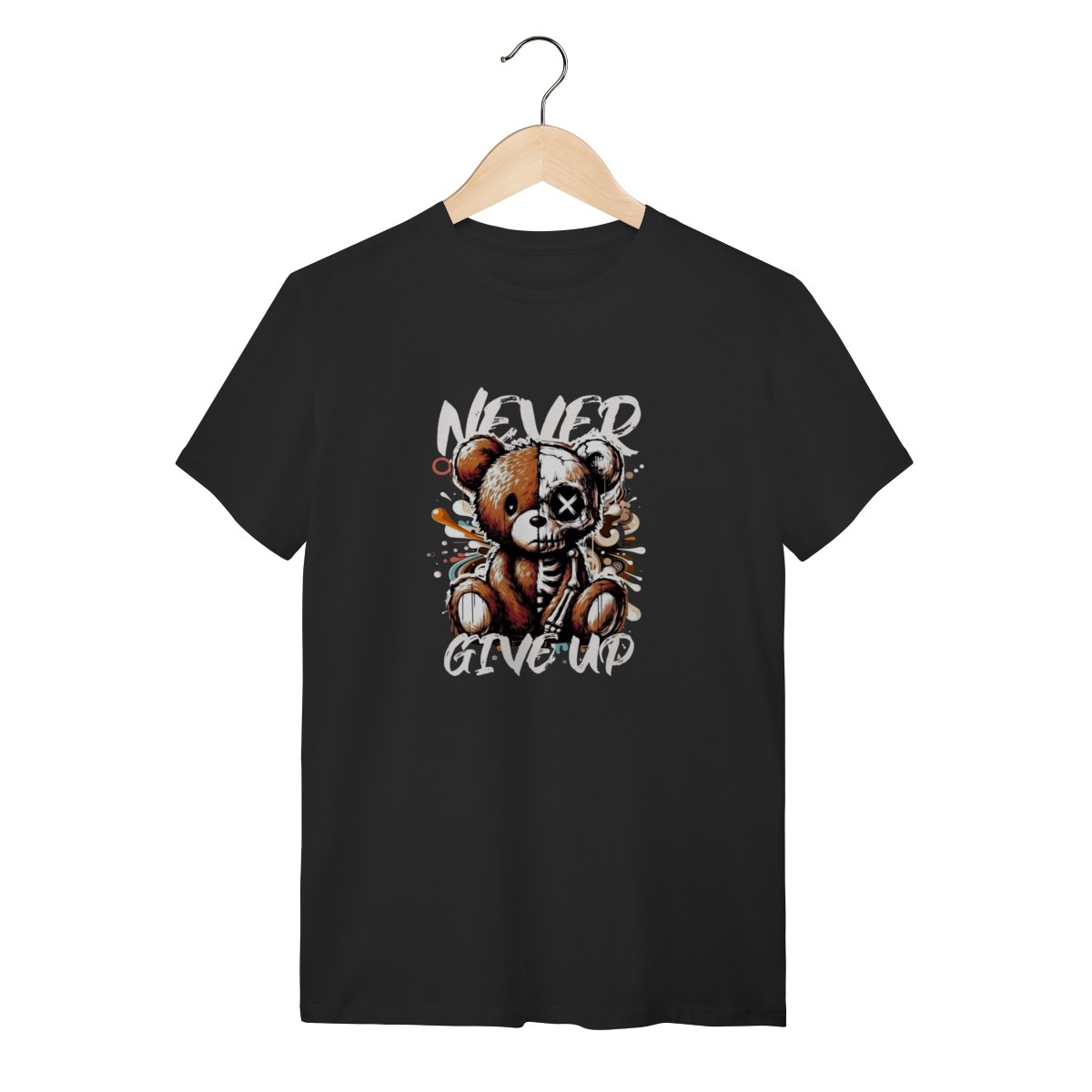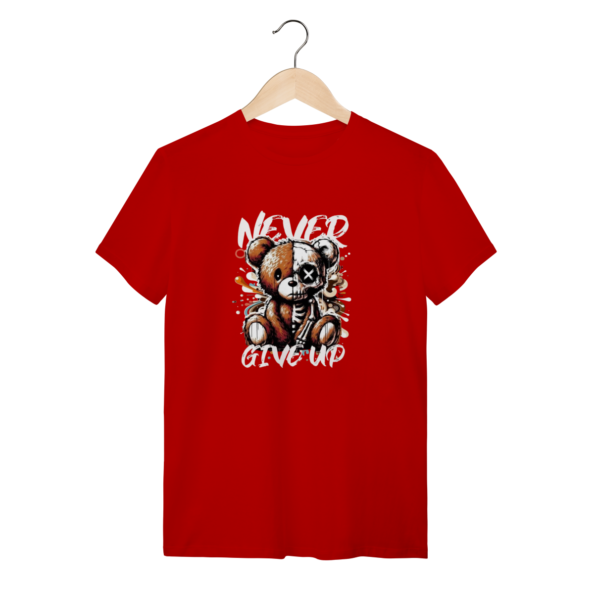 Este urso pode estar meio esquelético, mas o conforto desta camiseta nunca desiste! A mensagem é "Never Give Up" e a qualidade também não. Esta T-Shirt Quality é feita com o heroico Algodão 100% Quality – um tecido tão robusto e macio que aguenta qualquer batalha, desde a maratona de séries até uma noite de headbanging. A fibra premium oferece uma suavidade que desmente a estampa radical, garantindo que a sua pele sinta apenas o toque aveludado, nunca a dor! O tecido é leve e respirável, permitindo que você demonstre sua resiliência e estilo sem nunca desistir do conforto. Vista essa peça e prove que você é durão o suficiente para encarar o mundo, mas também merece o melhor algodão do mercado.