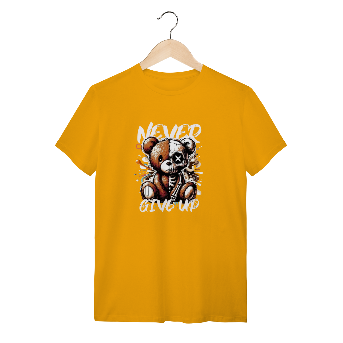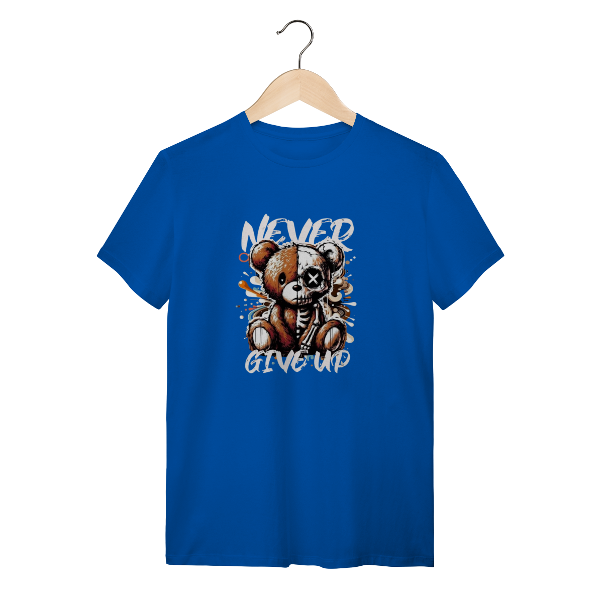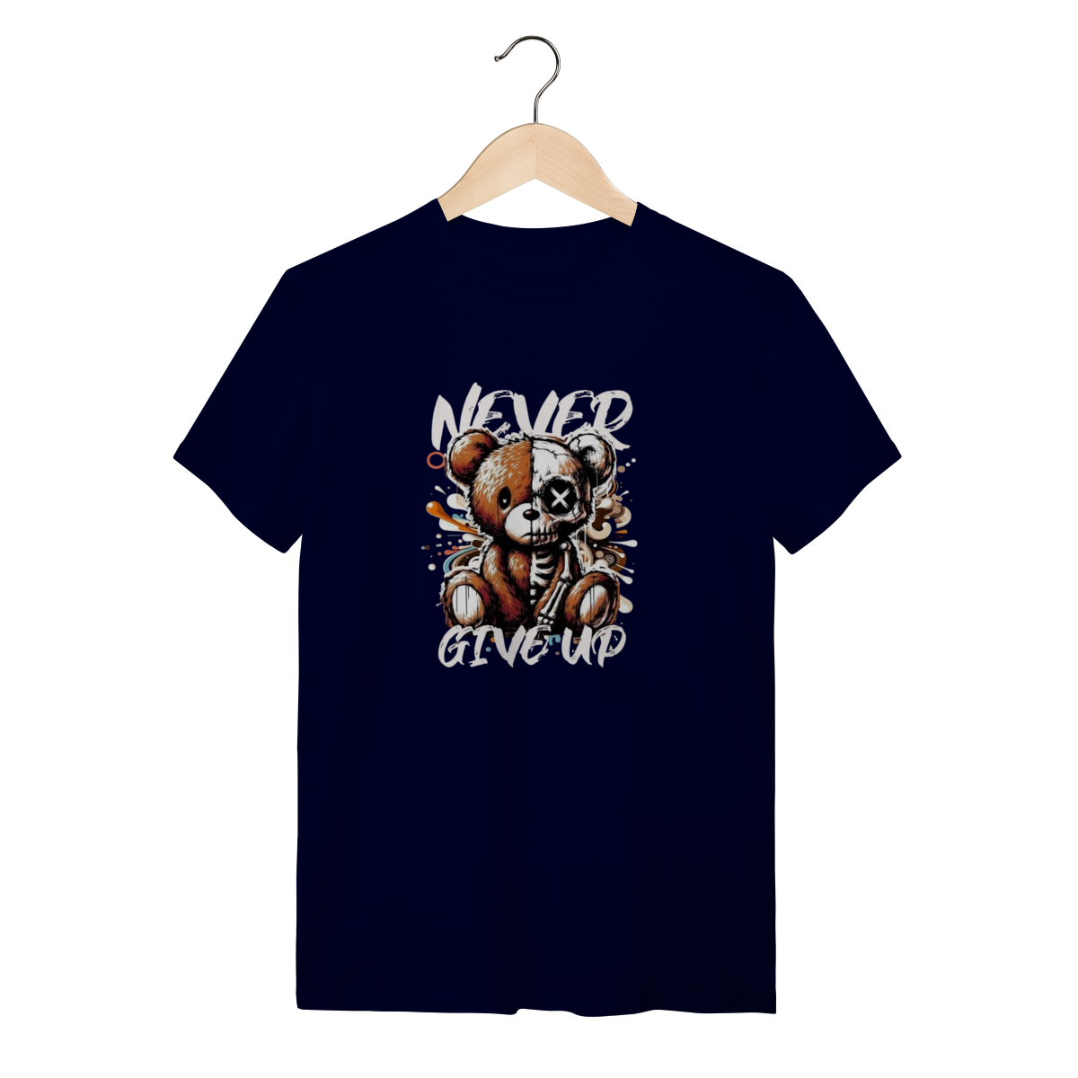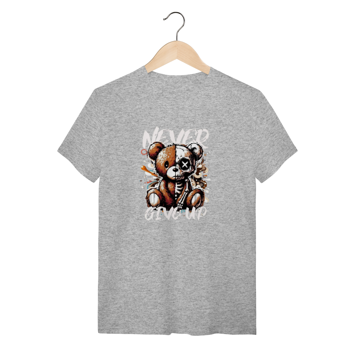 Este urso pode estar meio esquelético, mas o conforto desta camiseta nunca desiste! A mensagem é "Never Give Up" e a qualidade também não. Esta T-Shirt Quality é feita com o heroico Algodão 100% Quality – um tecido tão robusto e macio que aguenta qualquer batalha, desde a maratona de séries até uma noite de headbanging. A fibra premium oferece uma suavidade que desmente a estampa radical, garantindo que a sua pele sinta apenas o toque aveludado, nunca a dor! O tecido é leve e respirável, permitindo que você demonstre sua resiliência e estilo sem nunca desistir do conforto. Vista essa peça e prove que você é durão o suficiente para encarar o mundo, mas também merece o melhor algodão do mercado.