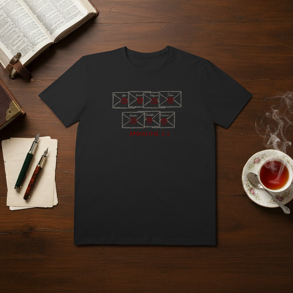 O Apóstolo João foi o único dos 12 discípulos mais próximos de Jesus que não foi martirizado de maneira brutal, morrendo de velhice depois de deixar a ilha de Patmos, onde foi exilado durante a perseguição. Durante o Exílio, João recebeu a revelação do livro de Apocalipse, livro este que recebeu direções claras vindas do próprio Senhor Jesus para que o escrevesse, e onde João documentou todos os acontecimentos que precederiam os últimos momentos antes da volta do Senhor. Já nos primeiros capítulos, o Senhor Jesus ditou cartas para 7 igrejas da Ásia menor. Essas cartas foram enviadas a Éfeso, Esmirna, Pérgamo, Tiatira, Sardes, Filadélfia e Laodiceia, e contêm elogios, repreensões, e promessas que ecoam através dos séculos para a igreja de todos os tempos. Essas cartas embora escritas no primeiro século, ainda possuem um poder valioso e atual para a igreja moderna, e devem ser relidas, ponderadas e acolhidas para nossas vidas hoje. Por isso, criamos a estampa "Cartas às 7 Igrejas" como um lembrete para a meditação nessas palavras de transformação, para que nos mantenhamos alinhados à vontade do Senhor e perseveremos em santidade aguardando a sua volta de forma prudente.