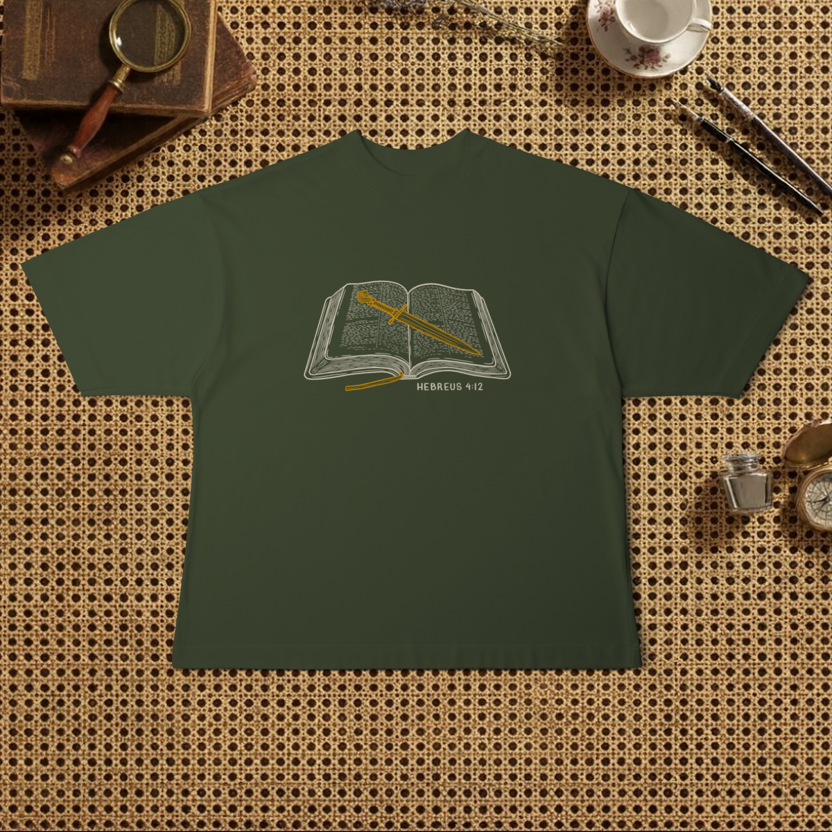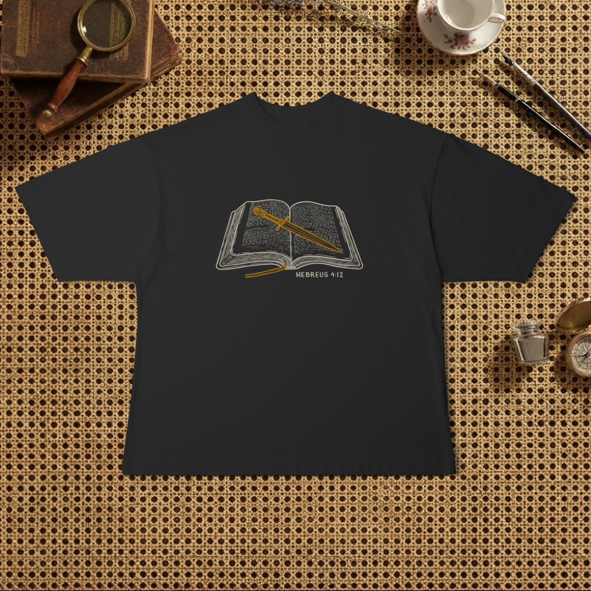 A Bíblia é a revelação divina, o registro escrito e infalível da vontade e do caráter de Deus, a Verdade acessível a todos, a fonte de vida, sabedoria e doutrina. Em Hebreus 4:12 a Palavra de Deus é comparada a uma espada de dois gumes, um objeto que não é apenas uma arma de combate, mas um instrumento de discernimento e julgamento. Ela representa o poder de penetração das Escrituras, que têm a capacidade de ir além da superfície e da mente, atingindo o mais profundo do ser humano, sendo viva, poderosa e eficaz para transformar o mais  inacessível lugar da alma humana. Ela julga e expõe as motivações ocultas, os pensamentos e as verdadeiras intenções do coração, e separa o que é divino e genuíno, do que é humano e falso. E essa é a base da nossa estampa "Palavra cortante", onde você irá se vestir da convicção de que a viva Palavra de Deus é suficiente para transformar e aperfeiçoar qualquer coração, começando pelo seu.