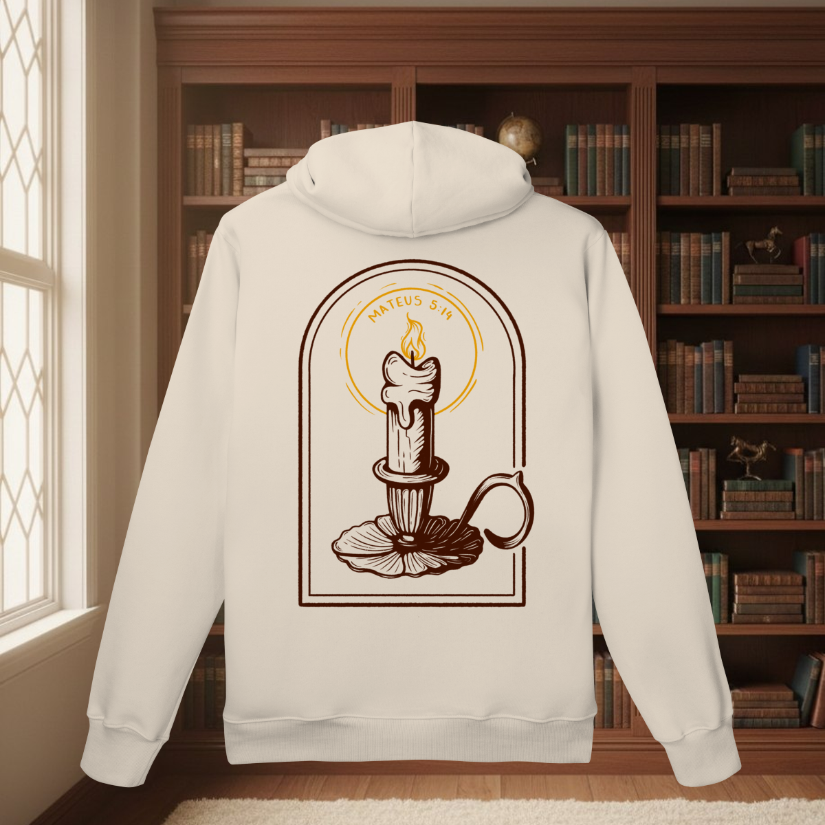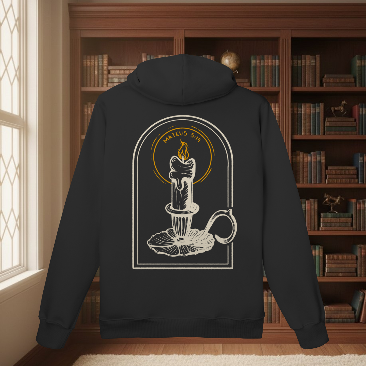 No capítulo 5 de Mateus temos o maior Sermão público feito por Jesus, o Sermão do Monte. Tais ensinamentos são considerados por muitos teólogos como a "Constituição do Reino de Deus", pois dita a maneira como os cidadãos do Reino dos céus vivem. Em uma das maravilhosas passagens contidas nesse sermão está a famosa frase: "Vocês são a luz do mundo". Baseando-se nessa declaração, nossa estampa "Luz no mundo" celebra o chamado para o testemunho visível. A vela acesa no castiçal é o símbolo de uma fé que não pode ser escondida. É tempo de remover o "alqueire" e deixar que a luz, a verdade e o amor de Cristo transformem o ambiente ao seu redor. Vista este lembrete de que sua vida é como uma vela, ilumine as pessoas ao seu redor com a Luz do Senhor que você carrega! O mundo jaz em trevas, mas o nosso Deus nos levantou para trazer clareza, direcionamento, revelação e entendimento para os que não O conhecem. Não esconda essa chama!