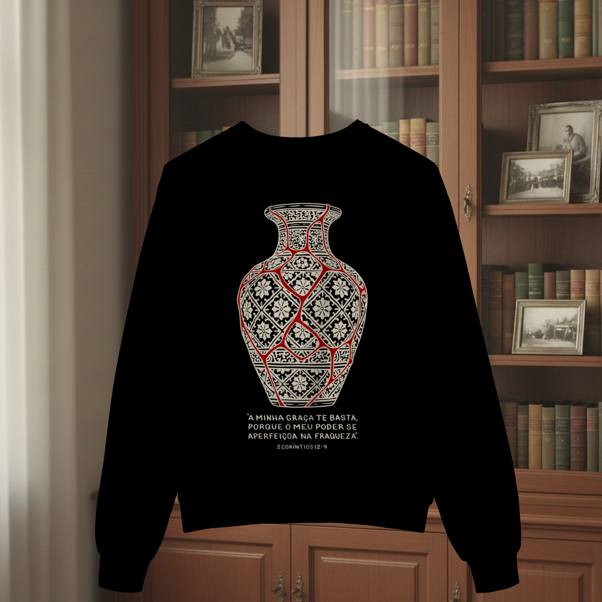 Antes de conhecermos a Cristo, estávamos todos quebrados... Como um vaso de cerâmica estávamos em cacos, destruídos pelo pecado e suas consequências. Mas, quando tivemos um encontro com a sua Graça, os cacos voltaram ao propósito e posições originais, fomos transformados, nos tornamos novas criaturas redimidas pelo Sangue do Cordeiro. Mas o pecado ainda está no mundo, embora salvos, ainda pecamos, embora refeitos, ainda temos rachaduras... "Ainda", enquanto não chega o grande Dia do Senhor. No Reino eterno que virá corações não vão mais doer, mas neste mundo eles ainda doem... Na Nova Jerusalém seremos fortes, mas neste mundo ainda temos fraquezas... Mas ânimo! Recebemos promessas! Promessas de que o Senhor sempre estará conosco e que, como diz 2 Coríntios 12:9, Seu Poder e Sua Graça estarão presentes nos nossos momentos de fraqueza. E é baseada nessa promessa que nossa estampa "Beleza na fraqueza" surge! A ilustração é baseada em uma antiga técnica Japonesa chamada Kintsugi, que consiste em unir peças de cerâmicas quebradas usando ouro, evidenciando e ressignificando as falhas daquele objeto que antes seria descartado, e transformando-o em arte. Na nossa vida espiritual somos como um vaso restaurado, mas não com ouro, e sim com o Sangue de Cristo, que preenche nossas fraquezas com poder e ressignifica nossas falhas para a glória do Seu nome, sendo capaz de fazer nossas feridas curarem outras pessoas, e trazendo beleza e propósito onde antes só haveria dor e vazio.
