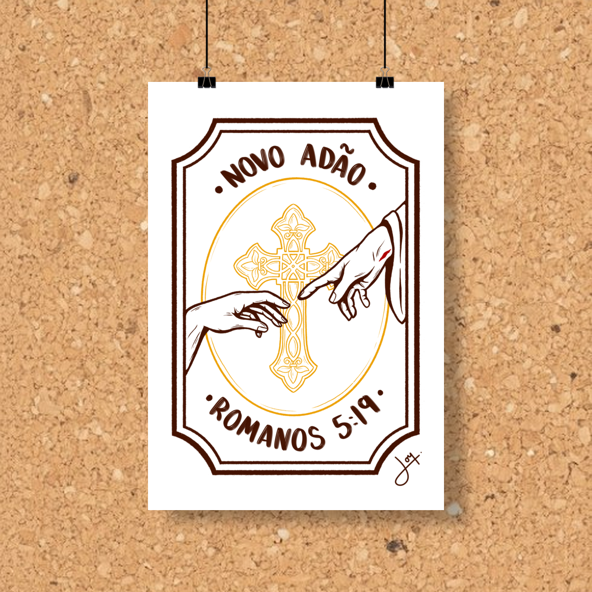 Adão foi o primeiro ser humano criado por Deus, uma criatura feita para ser imagem e semelhança do criador e glorificá-lo com a sua vida eternamente. Porém... Adão desobedeceu o Senhor e, como primeiro dentre a criação da humanidade, transmitiu a iniquidade para os seus descendentes, fazendo com que a morte chegasse para eles. Assim, por meio de um único homem veio a condenação para todos os outros. Mas o Senhor, em sua eterna bondade, encarna e se faz sacrifício pelas nossas transgressões, pagando o salário do pecado que nós acumulamos com nossos gritos de rebeldia iniciados por Adão no Éden, e nos libertou para a vida eterna e o propósito inicial. Dessa forma, por meio de Jesus Cristo, o novo Adão, a vida foi reconquistada e livremente distribuída para todo aquele que crê em seu Santo Sacrifício. E foi com isso em mente que nossa estampa "Novo Adão" nasceu, baseada em Romanos 5:19, e simbolizando como a Cruz de Cristo foi a porta de entrada para a redenção e justificação da humanidade, sendo ele o Novo Adão, onde o primeiro foi porta de entrada para morte e condenação. Além disso, a estampa faz referência à pintura "Criação de Adão" do artista renascentista Michelangelo, representando como Cristo faz de nós novas criaturas, resgatando o propósito original de glorificá-lo que já estava presente na "primeira criação".