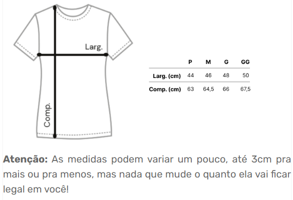 Cores do produto: Como cada tela de computador ou celular tem seu próprio jeito de mostrar cores, então a cor da sua camiseta e da estampa pode ser um pouco diferente do que você viu online.