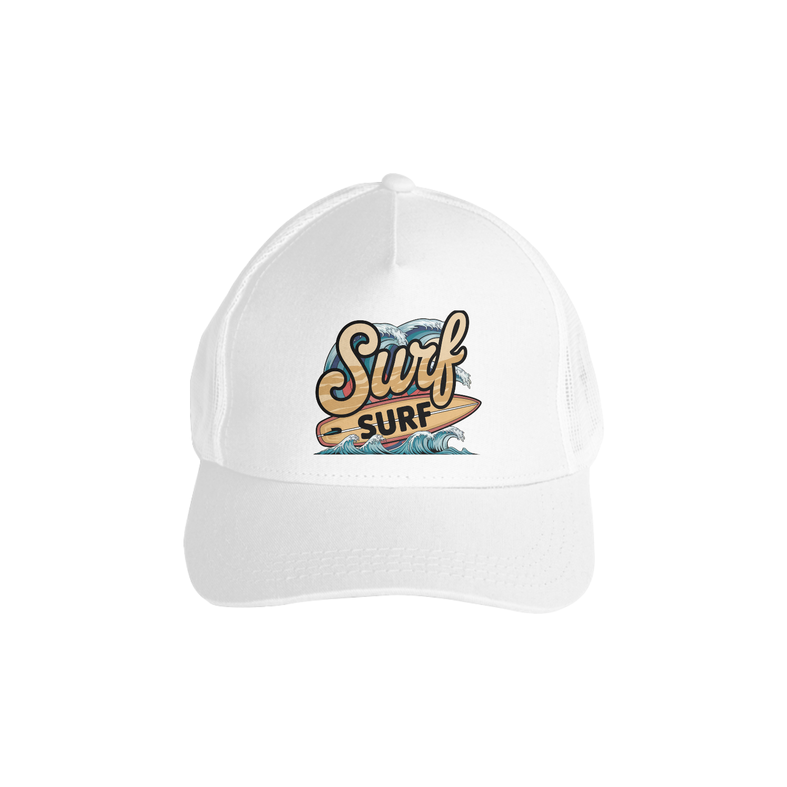 Uma estampa retrô da palavra "surf" em uma fonte de praia curva. Abaixo do texto, há uma prancha de surf com a palavra "surf" escrita nela. Há ondas com cores vibrantes no fundo.