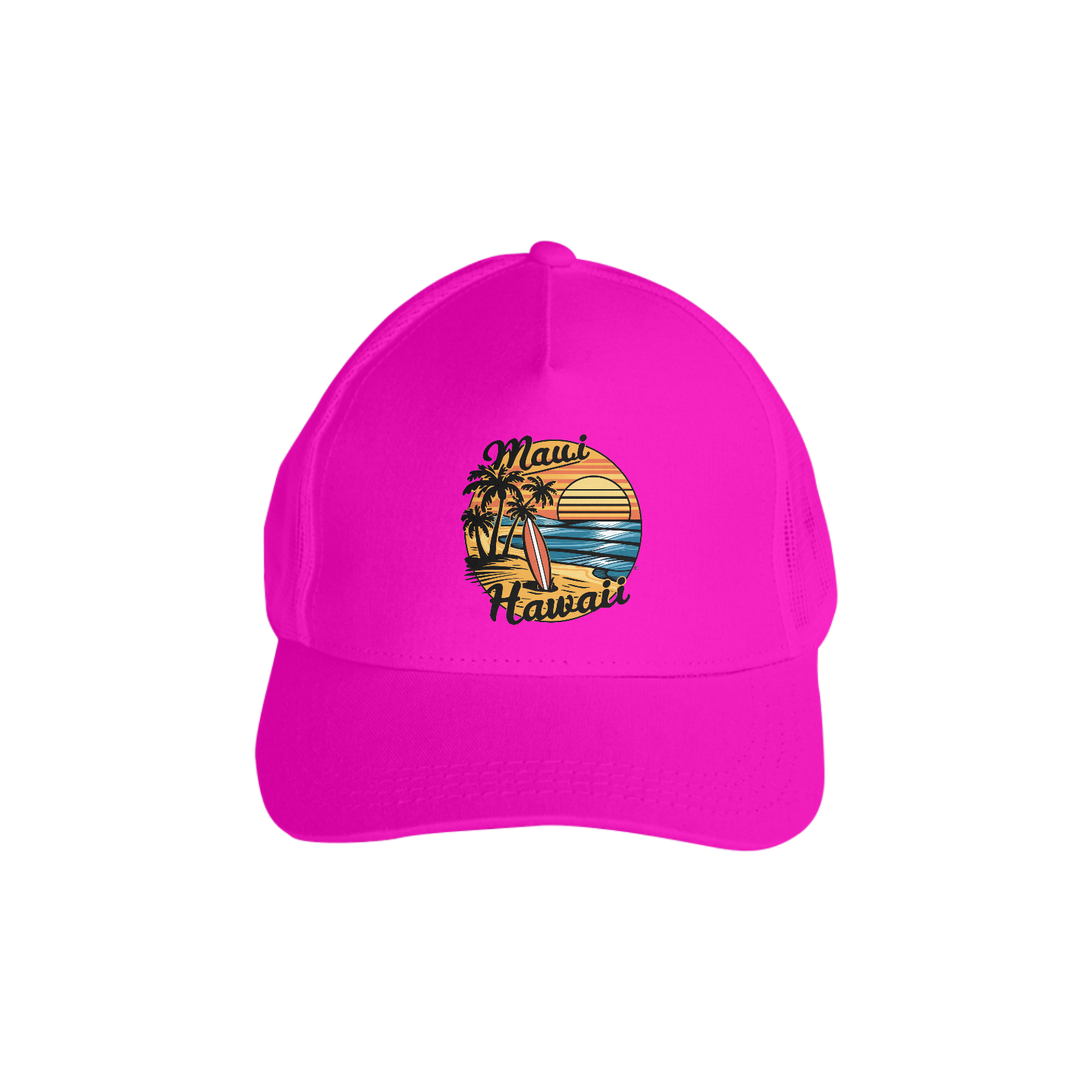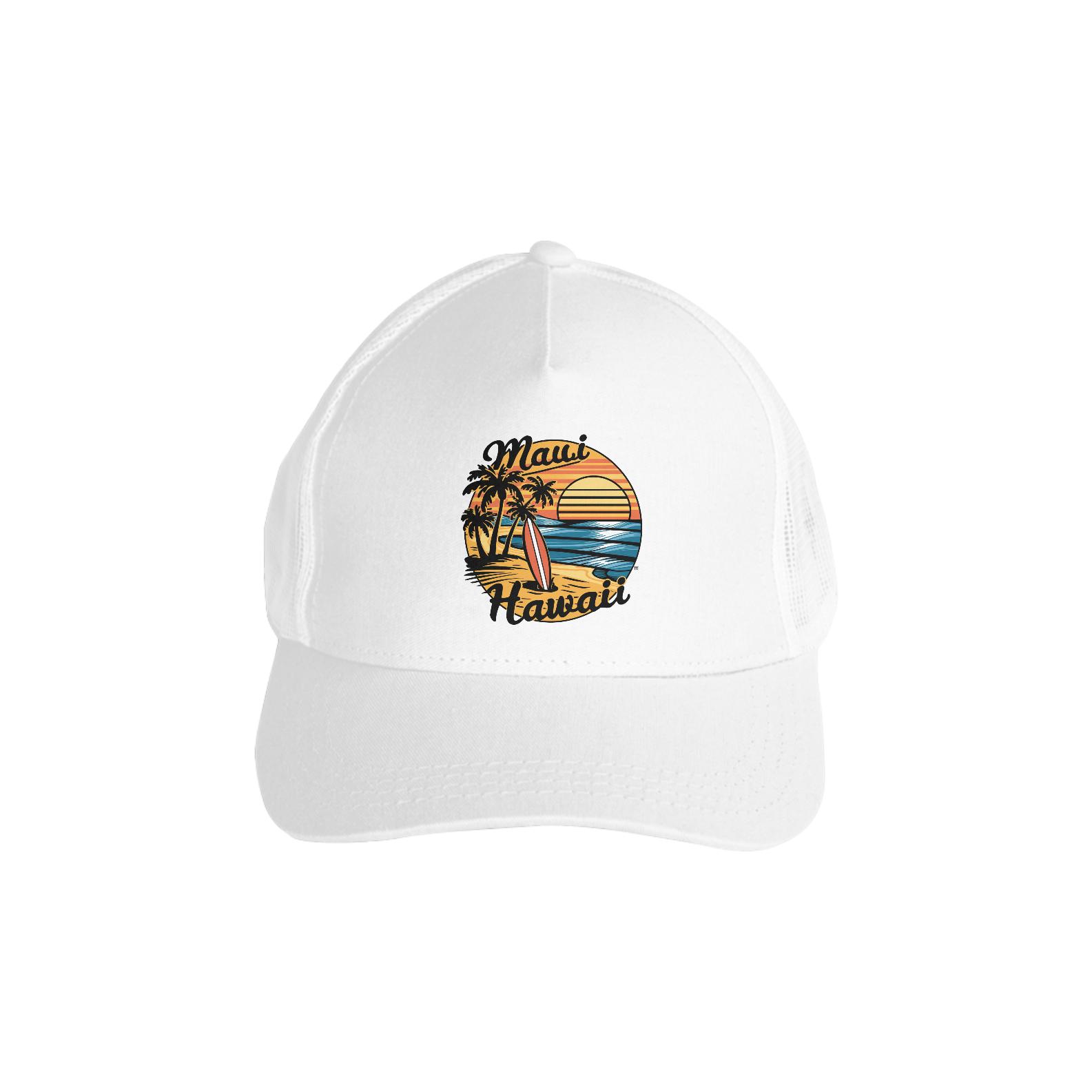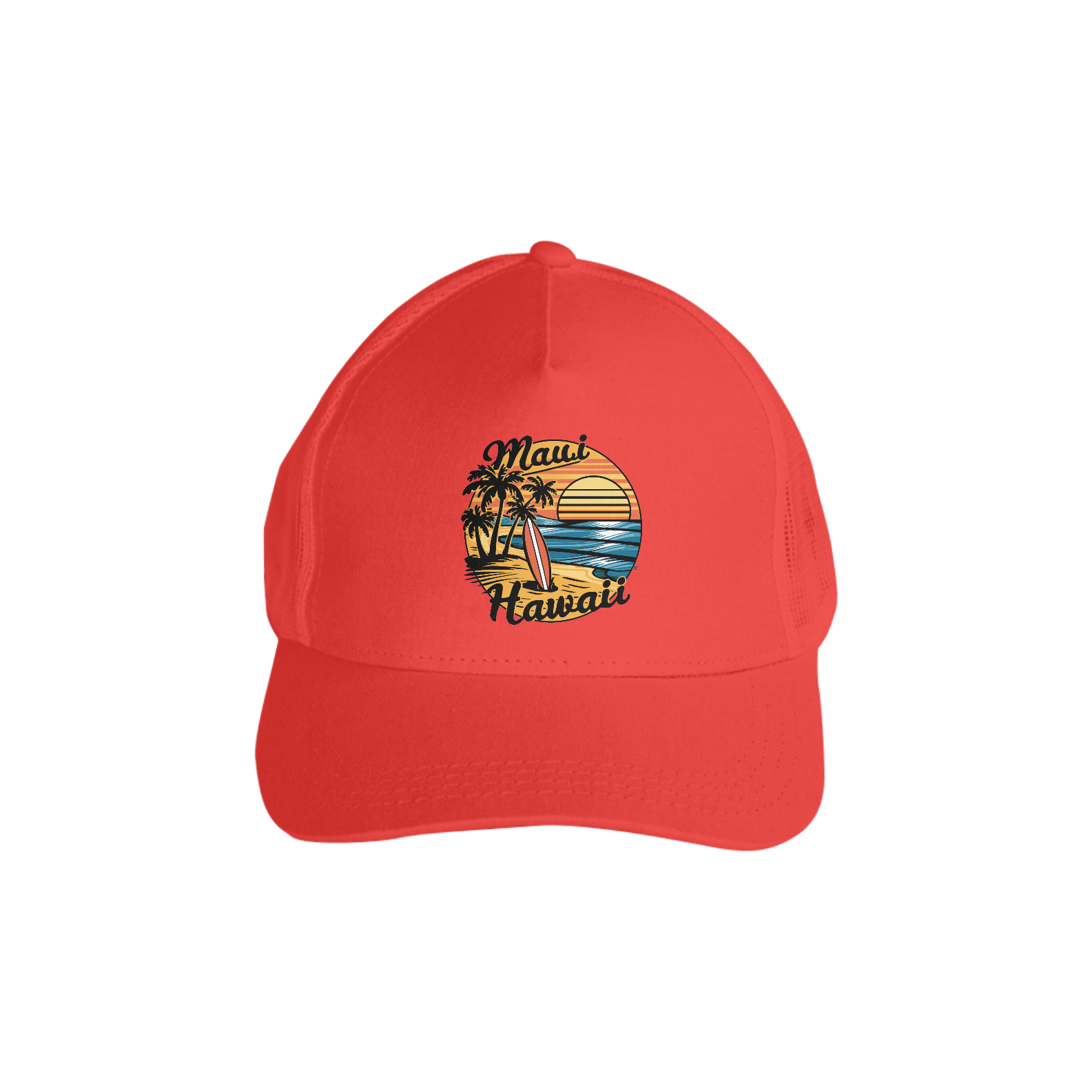 Uma estampa de surfe retrô-vintage com uma cena ensolarada de Maui, Havaí. Palmeiras pontilham a costa dourada, e uma prancha de surf estilosa está plantada na vertical nas areias quentes. O sol se põe em uma paleta de laranjas e amarelos quentes, refletindo seus raios nas ondas azuis cintilantes. O texto "Maui Hawaii" é artisticamente colocado ao redor da composição em uma fonte vintage e retrô.