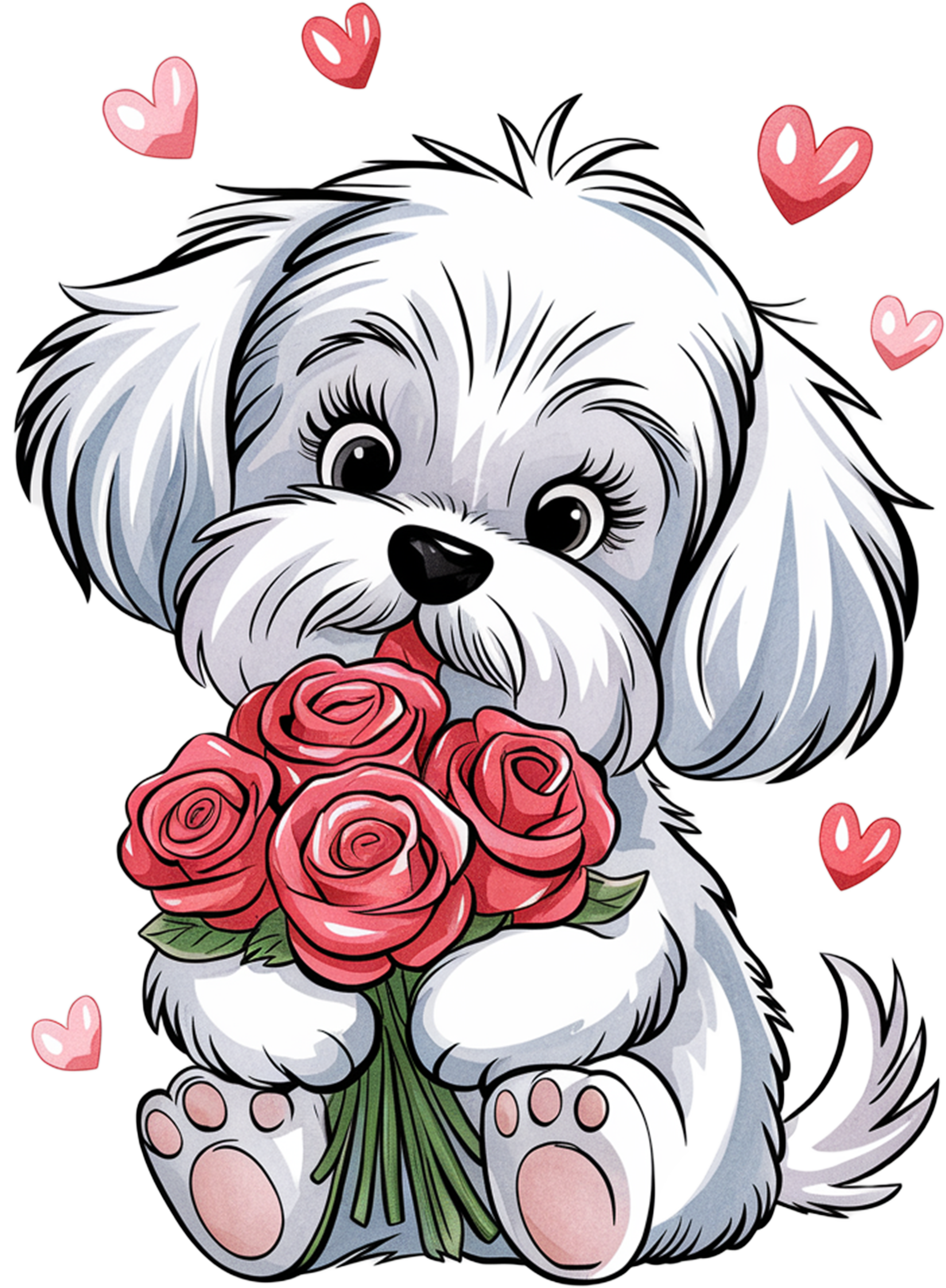 Uma estampa de alta qualidade em aquarela suave e brilhante em estilo 3D de um cão branco maltês bonito desenhado à mão no estilo dos desenhos animados do Dia dos Namorados segurando um buquê de rosas vermelhas. Há pequenos corações vermelhos e rosas ao redor. O fundo é uma cor branca isolada. O estilo geral da arte lembra a decoração clássica de berçário, tornando-a um complemento perfeito para uma camiseta de uma criança.