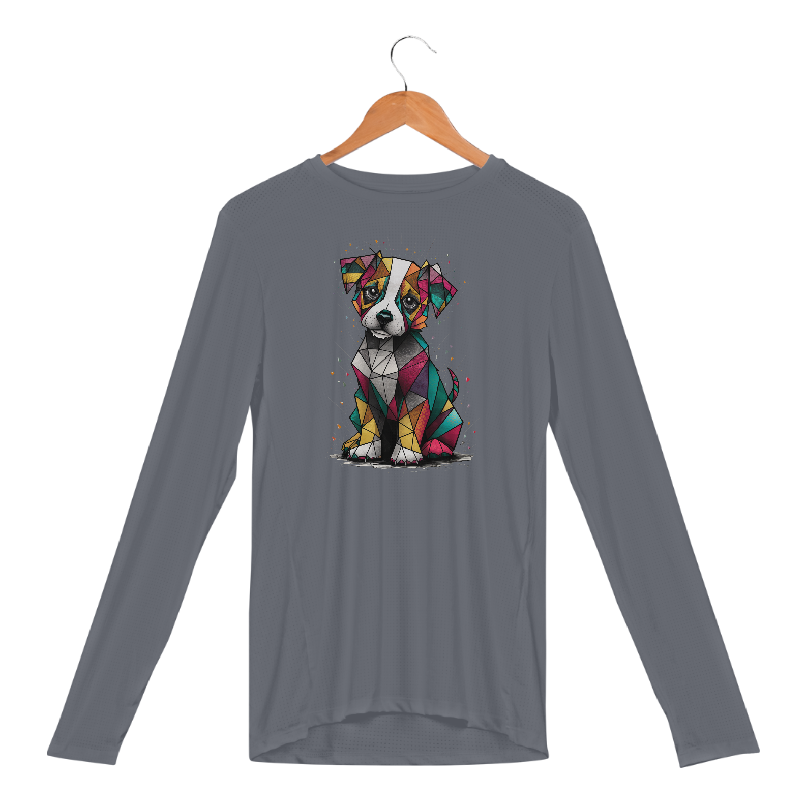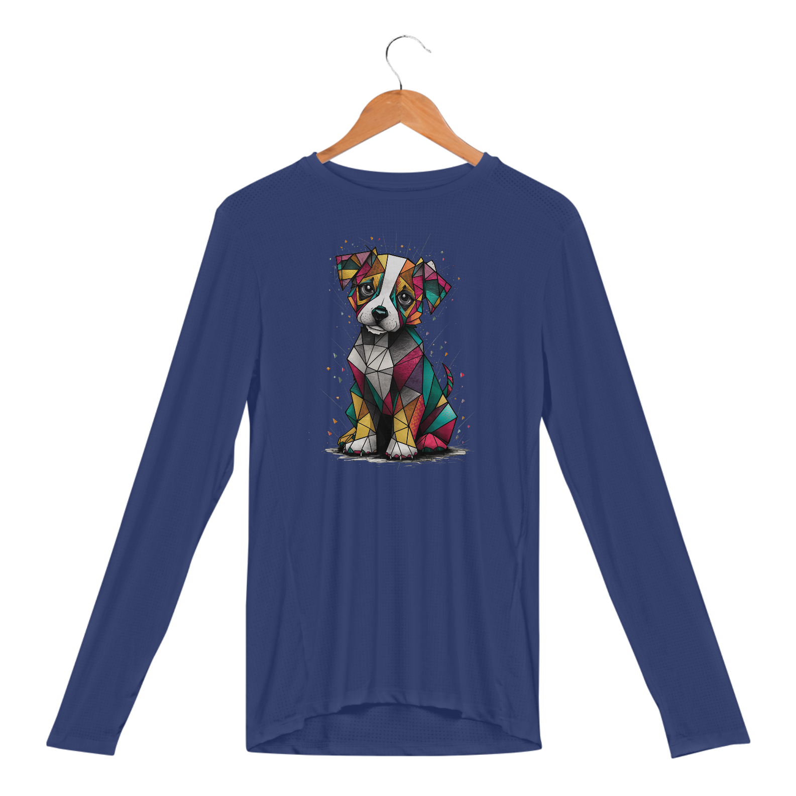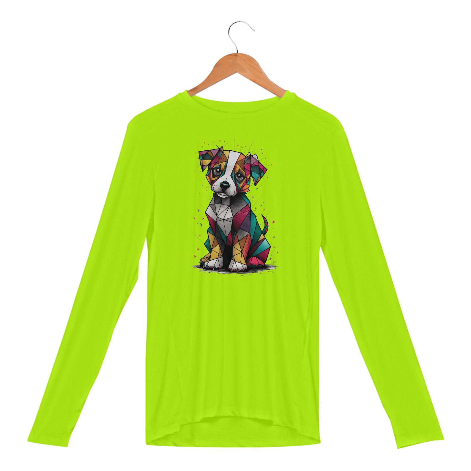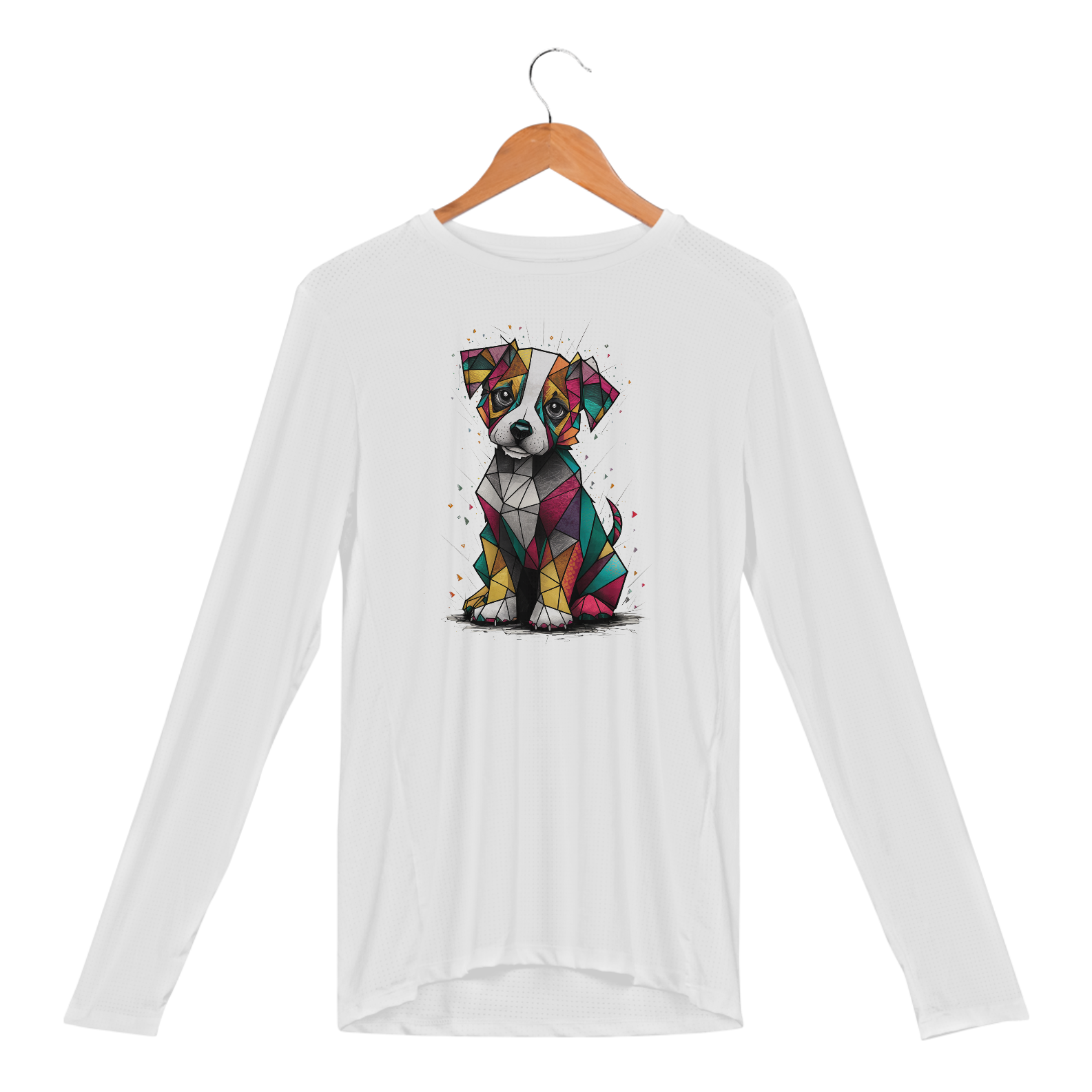 Camiseta Camaleon visualmente deslumbrante e conceitual de um cachorrinho cubista, desenhado com precisão excepcional. O cachorrinho, feito de formas geométricas, é uma mistura vibrante de cores e padrões, criando um design lúdico e atraente. Seus olhos expressiv