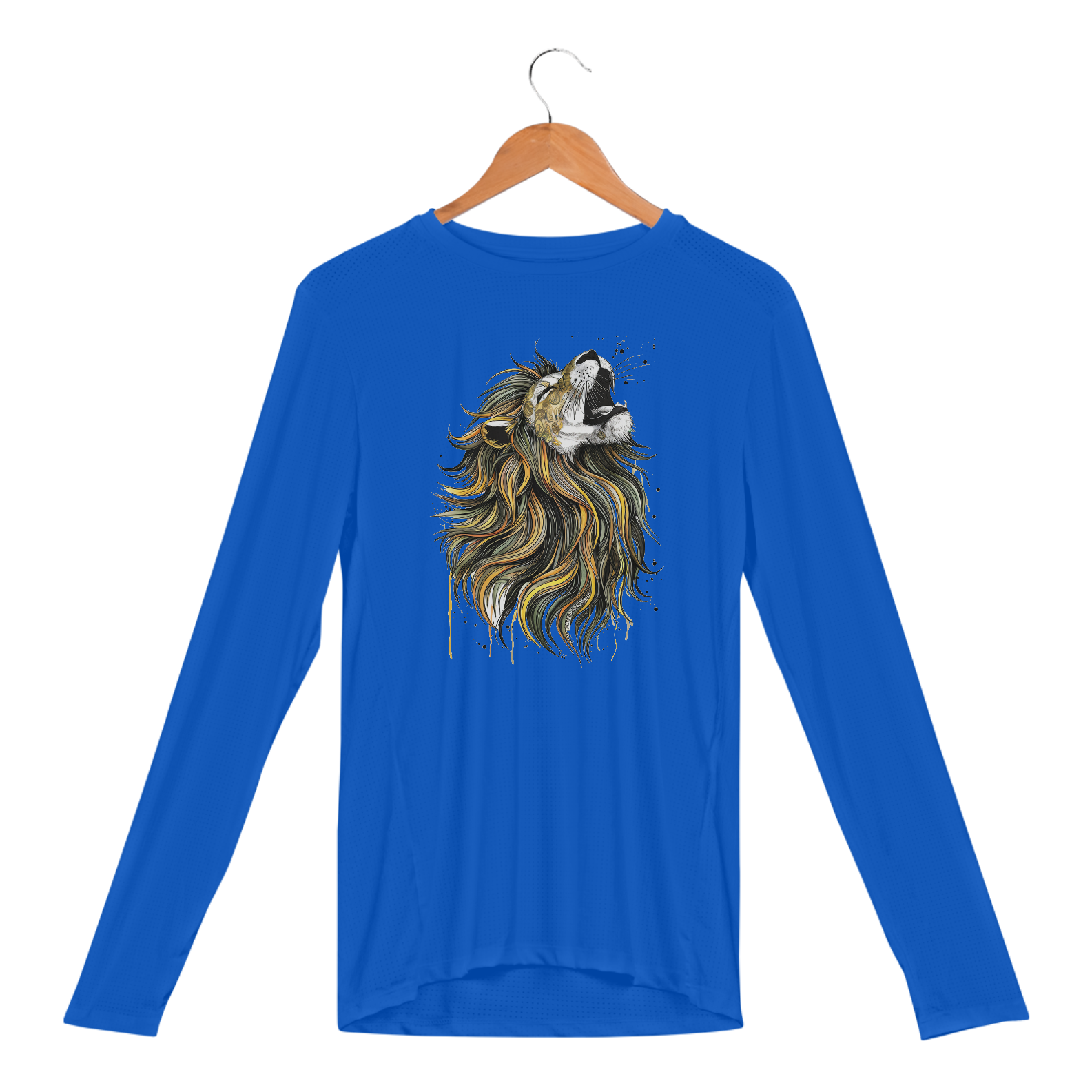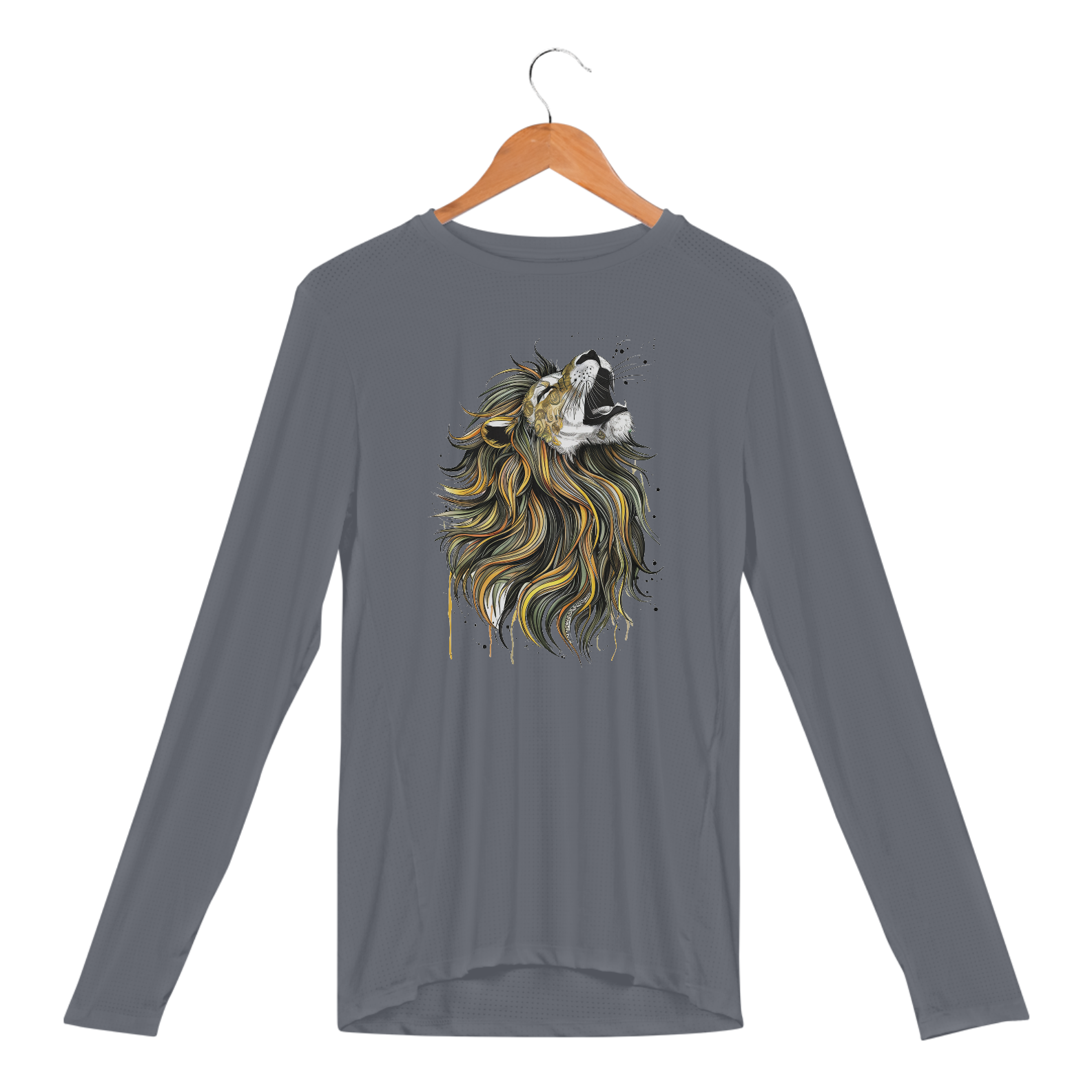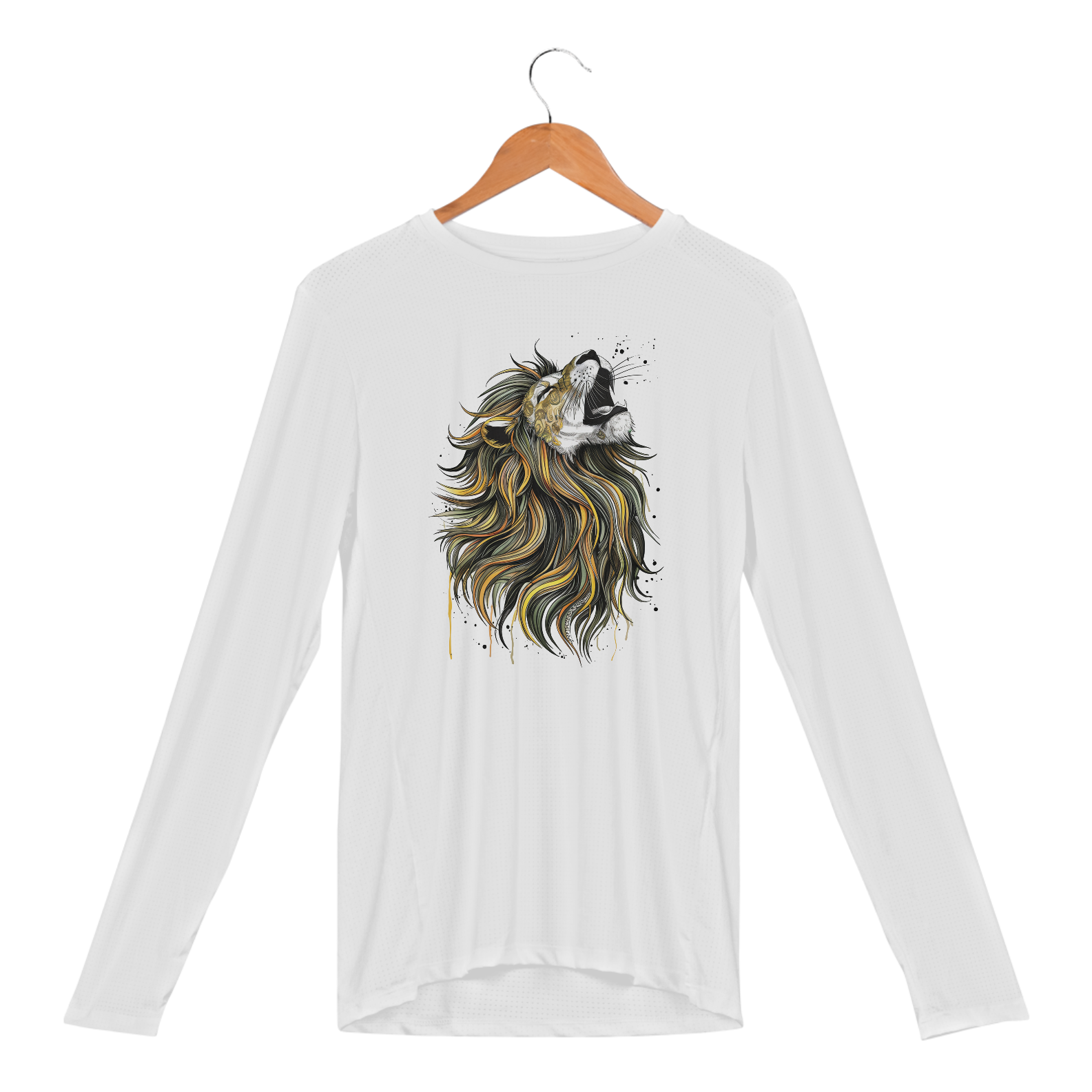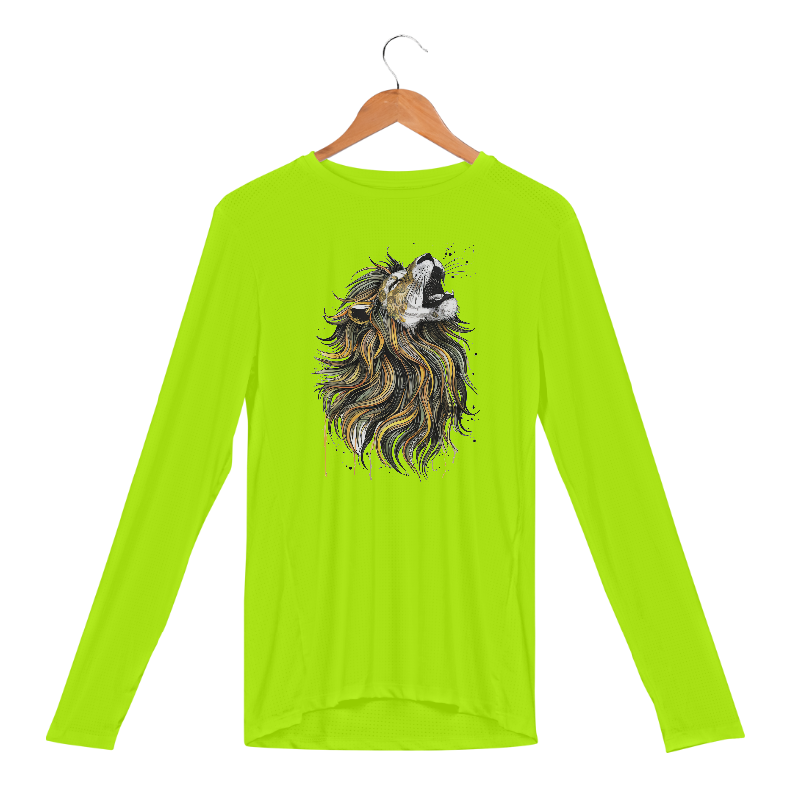 Uma estampa cativante e intrincada de um leão majestoso com uma longa e colorida juba que flui graciosamente. A juba do leão é adornada com padrões hipnóticos e cores vibrantes, incluindo amarelos, verdes sálvia e pretos. Os olhos do leão estão fechados, e sua boca aberta evoca uma sensação de uivo ou canto.