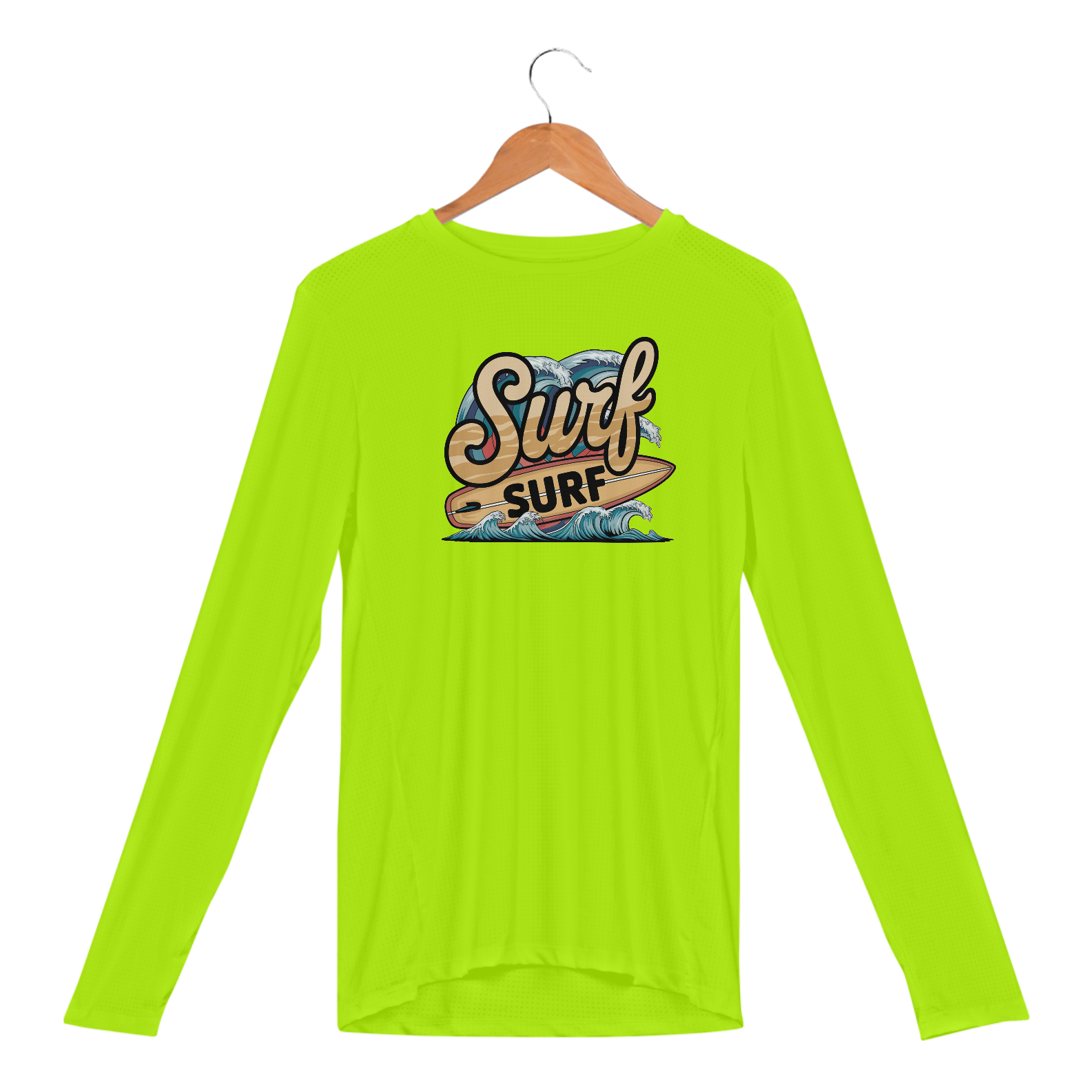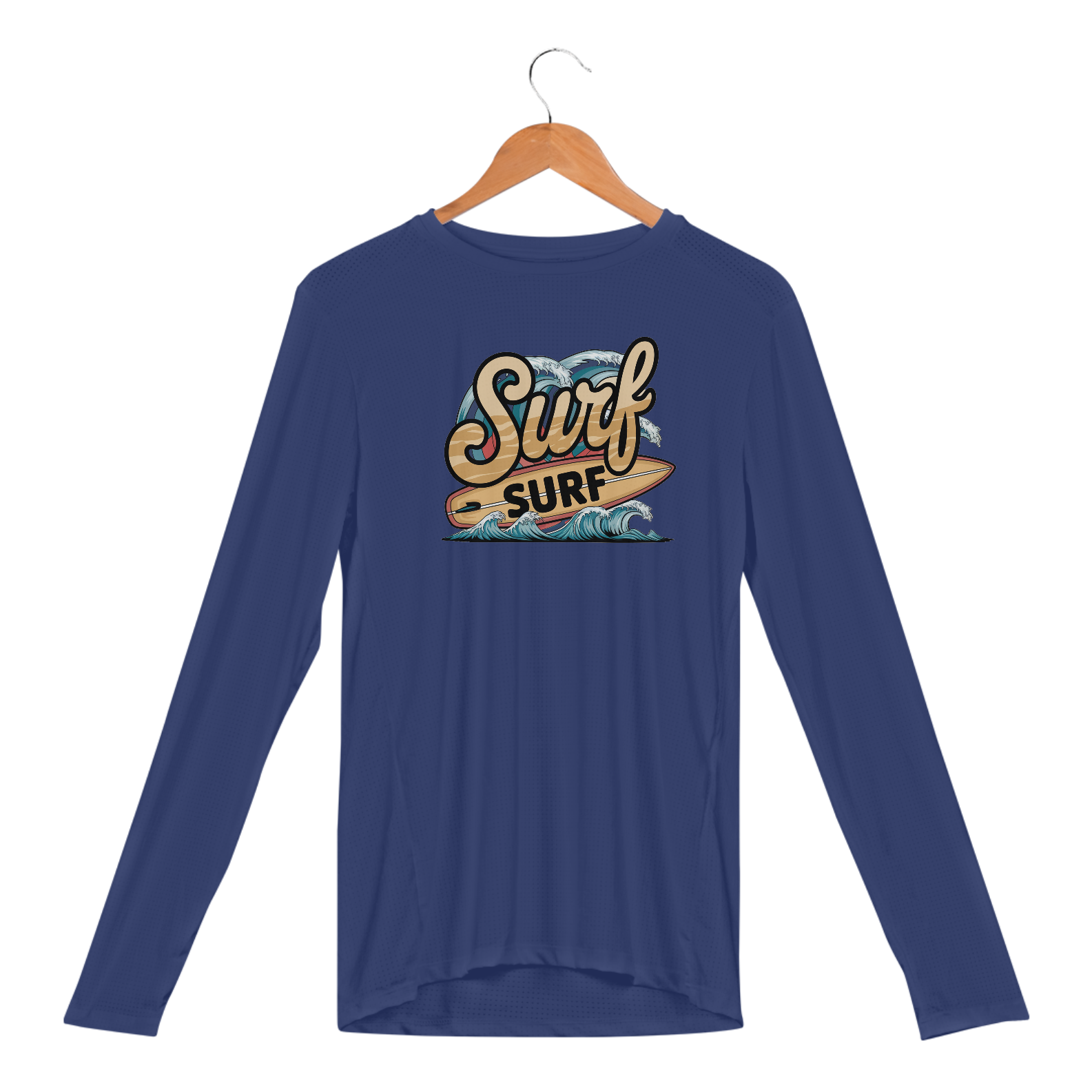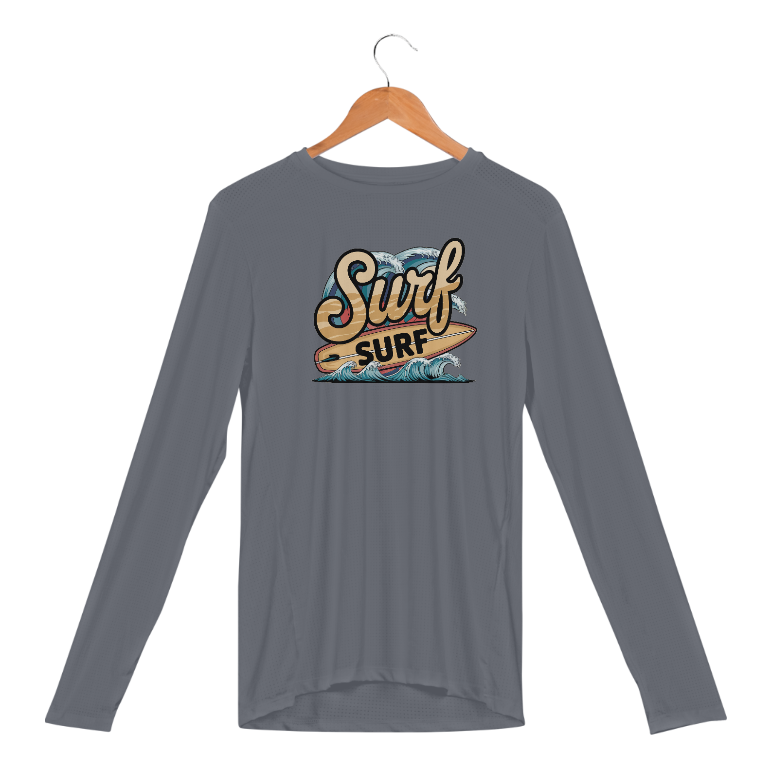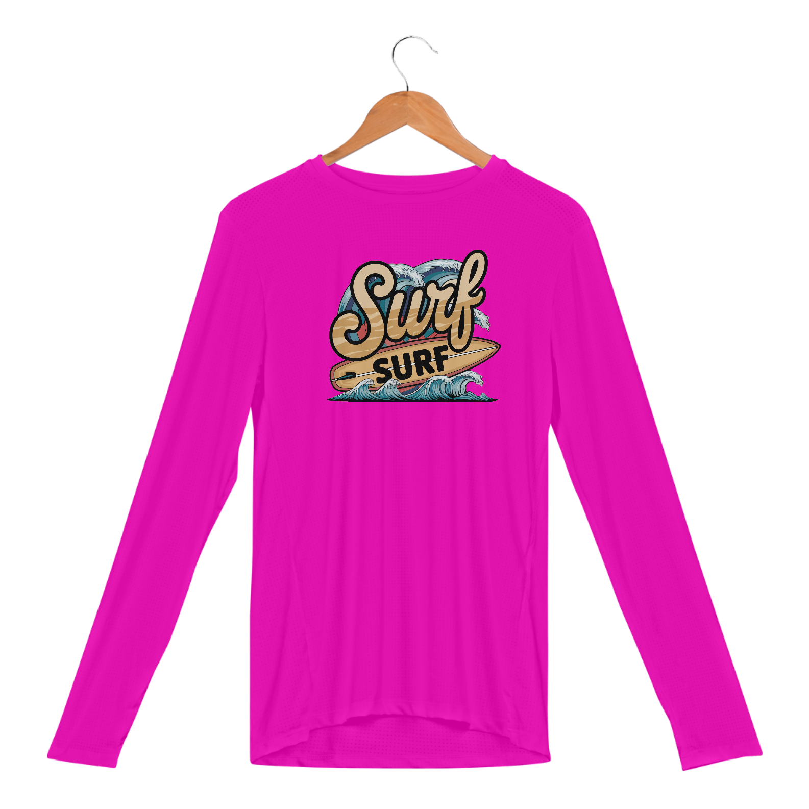 Uma estampa retrô da palavra "surf" em uma fonte de praia curva. Abaixo do texto, há uma prancha de surf com a palavra "surf" escrita nela. Há ondas com cores vibrantes no fundo.