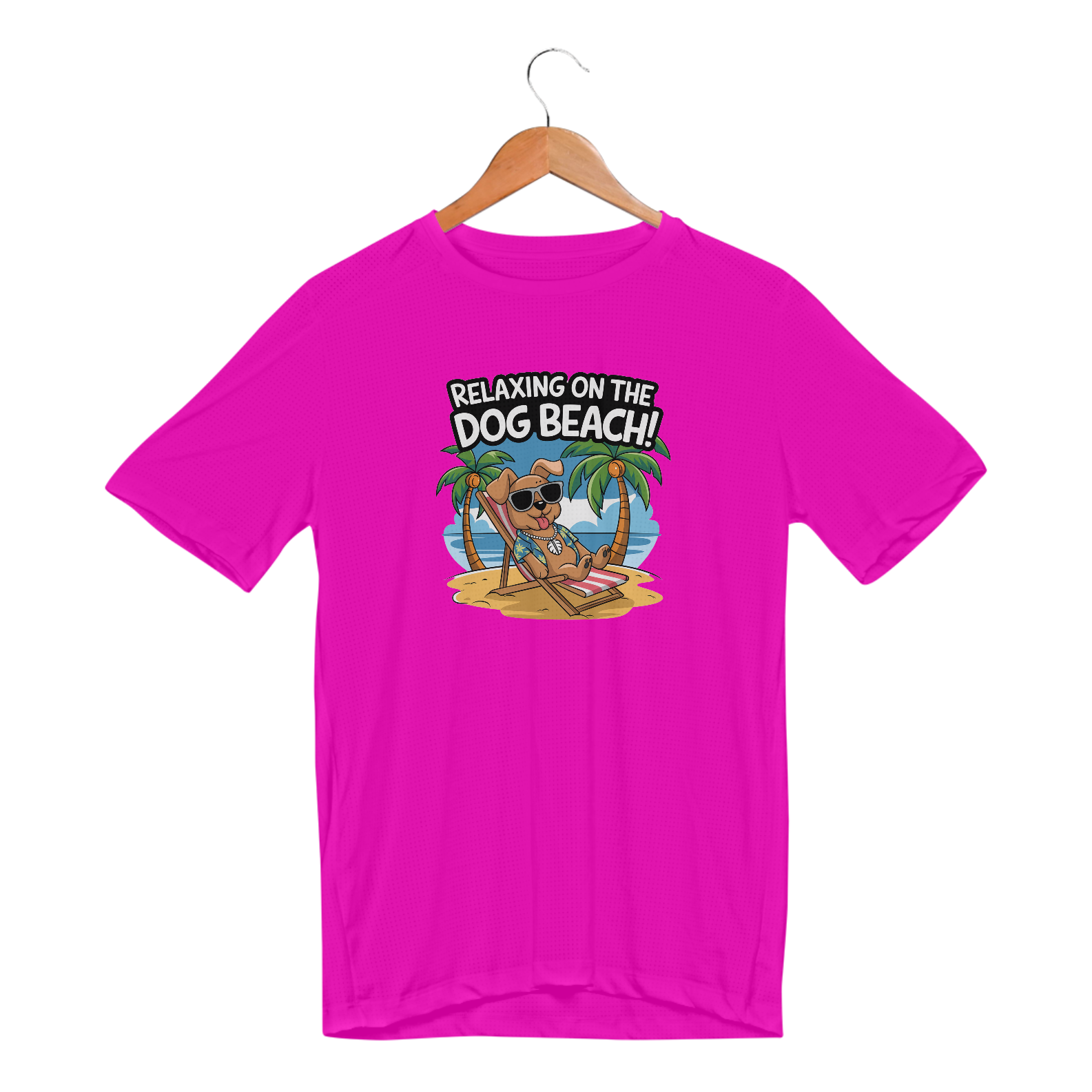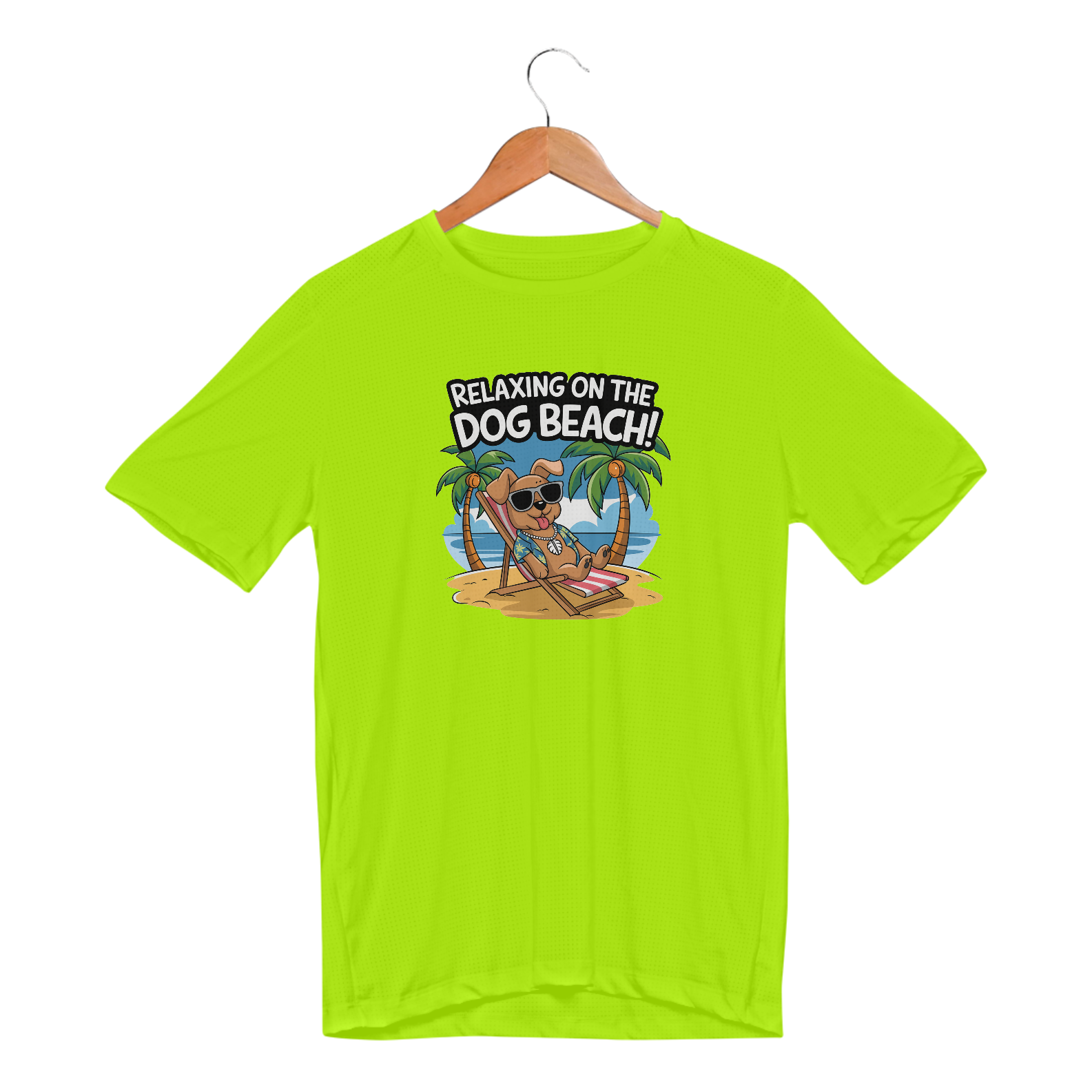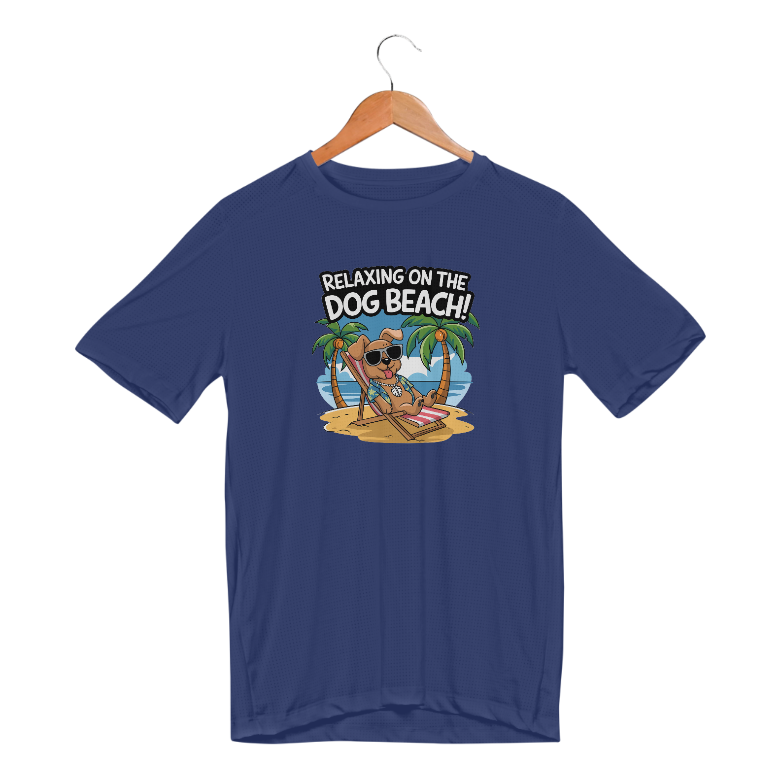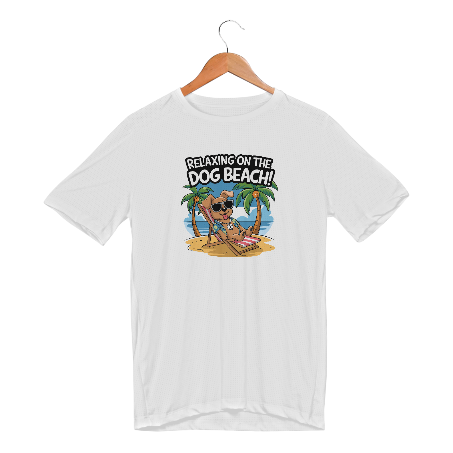 Uma estampa de um cachorro com óculos escuros descansando em uma cadeira de praia em uma praia arenosa. O cachorro está usando uma camisa havaiana e um colar com uma concha puka. O fundo contém palmeiras e um céu azul. O texto "Relaxando na Praia dos Cachorros!" está escrito em uma fonte divertida acima do cachorr