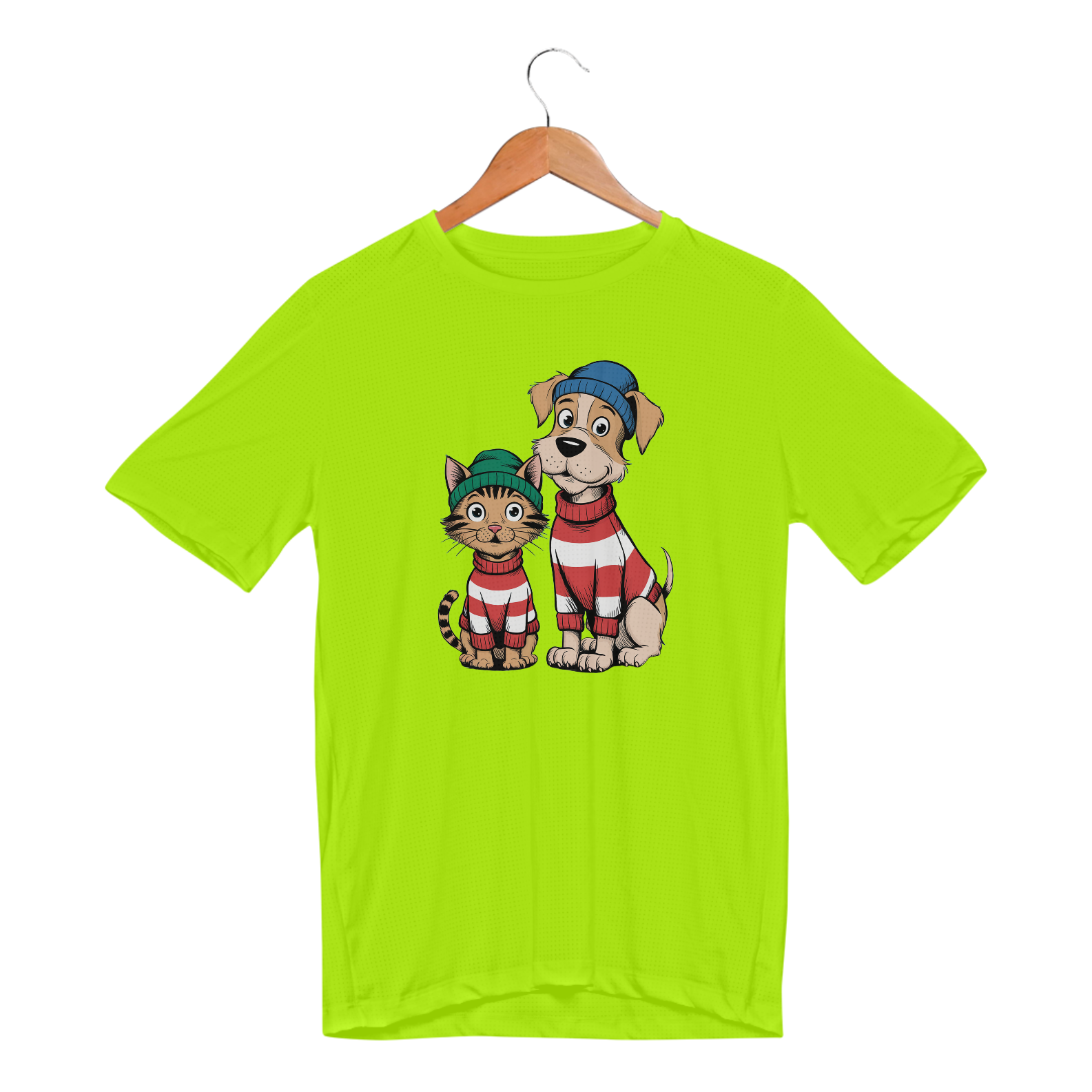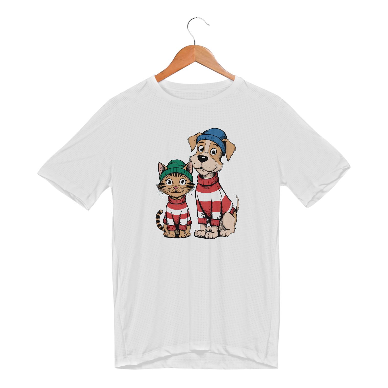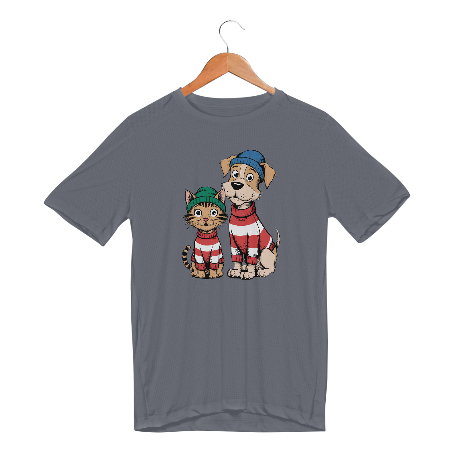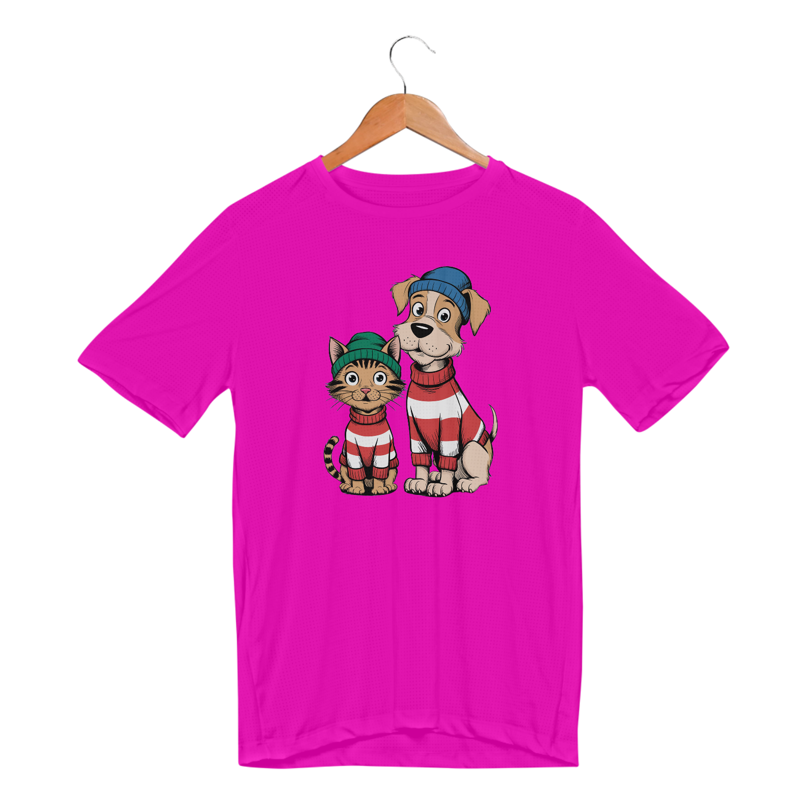 Uma estampa com o texto "Adote-me". Um gato com uma expressão curiosa e um cachorro com uma expressão feliz e sorridente, ambos em seus próprios bolsos.