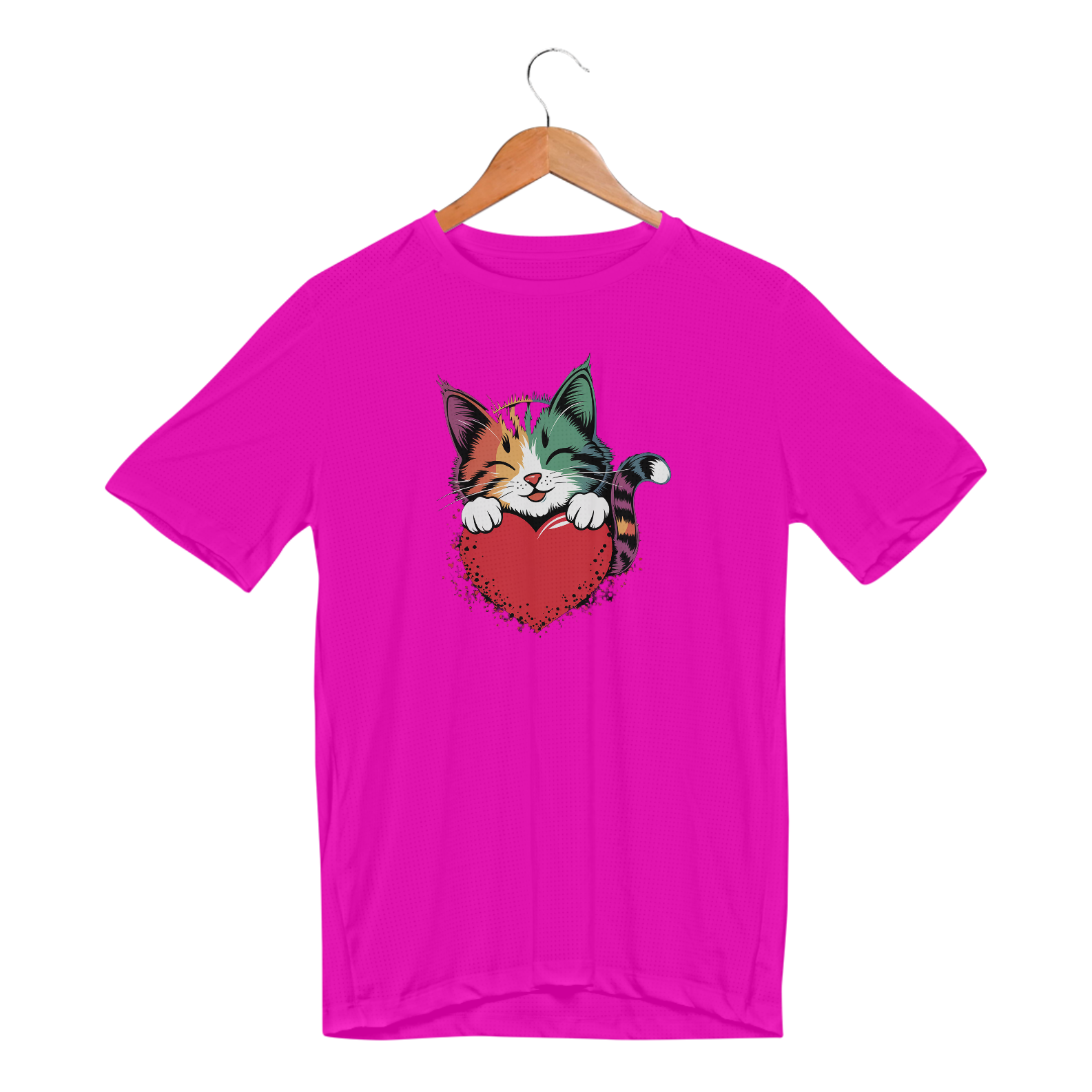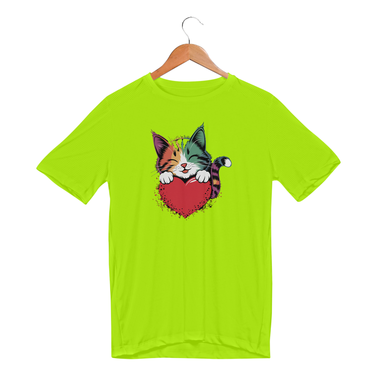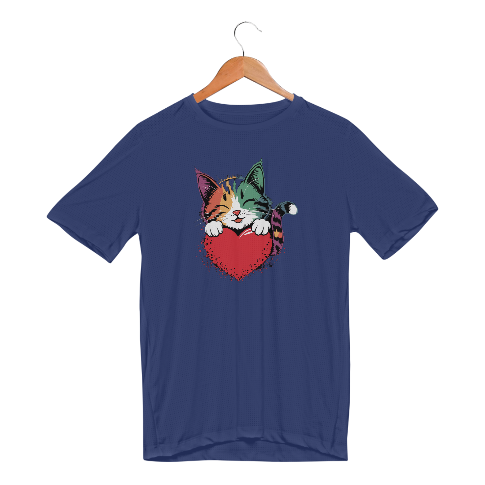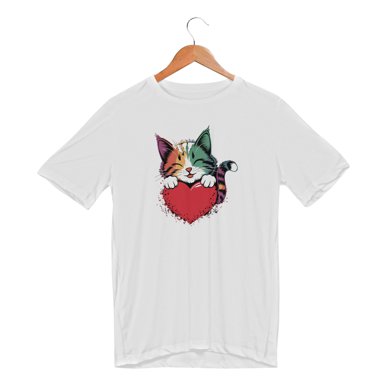 Uma estampa colorida e estilizada de um gato fofo com tons de arco-íris e padrões ousados ​​de pinceladas cobrindo seu pelo. O gato está descansando suas patas dianteiras em um coração vermelho brilhante e está dando uma expressão calorosa e amorosa, com seus olhos fechados como se estivesse sorrindo. Oste design exala uma vibração alegre e afetuosa, perfeita para o Dia dos Namorados ou amantes de gatos.