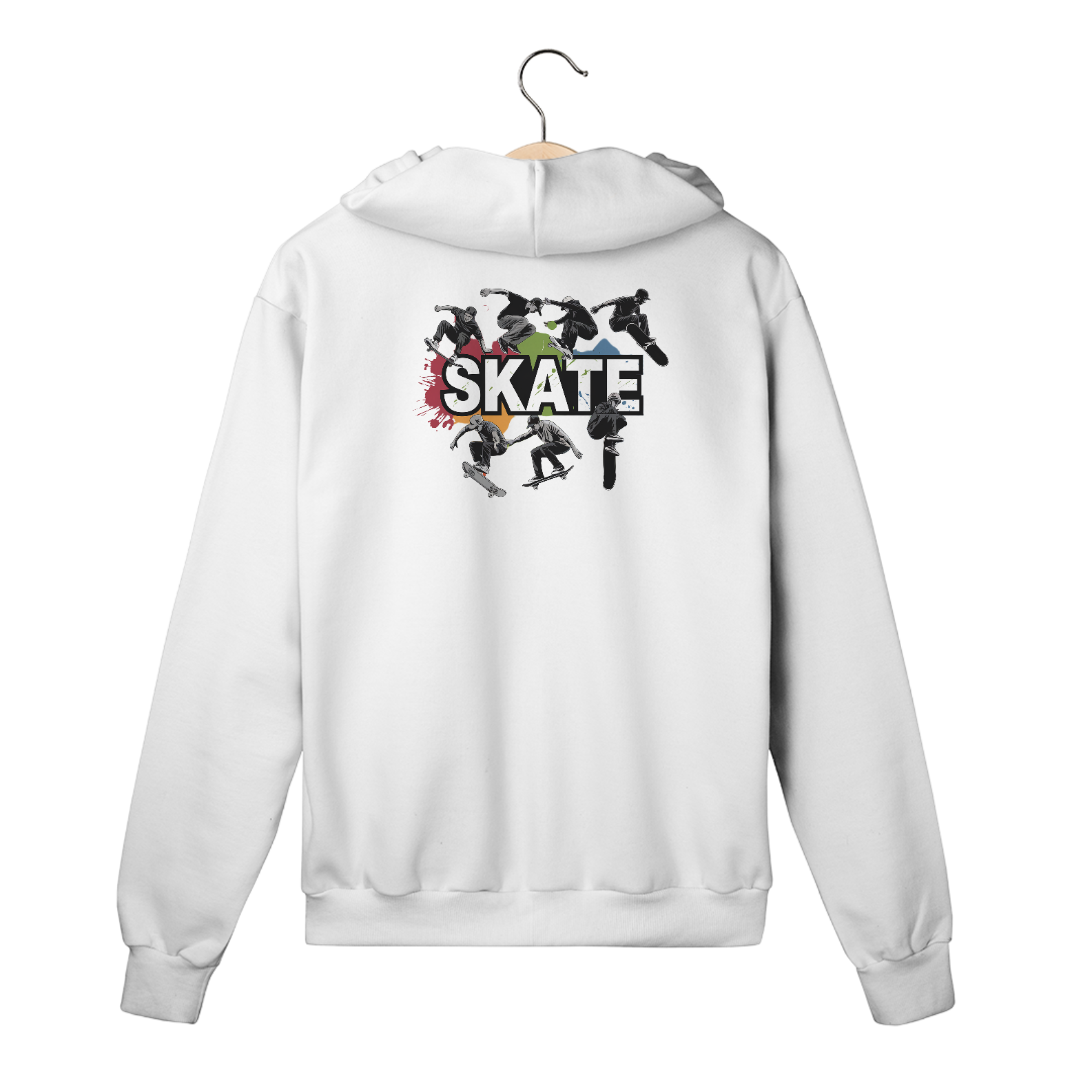 Uma estampa com o texto "Skate". Há vários skatistas em diferentes posições, alguns no ar com suas pranchas de lado. Há também respingos de cor ao redor do design.