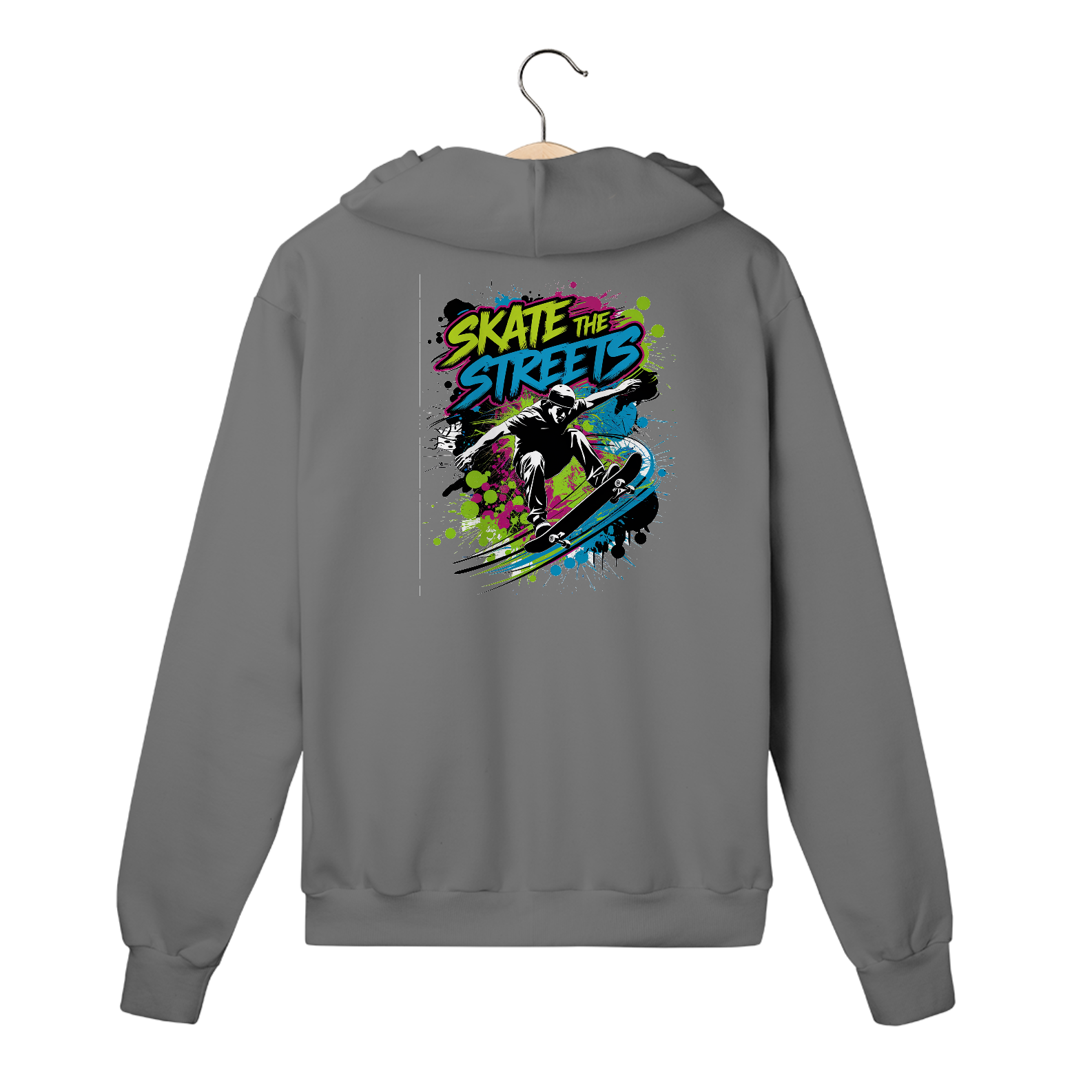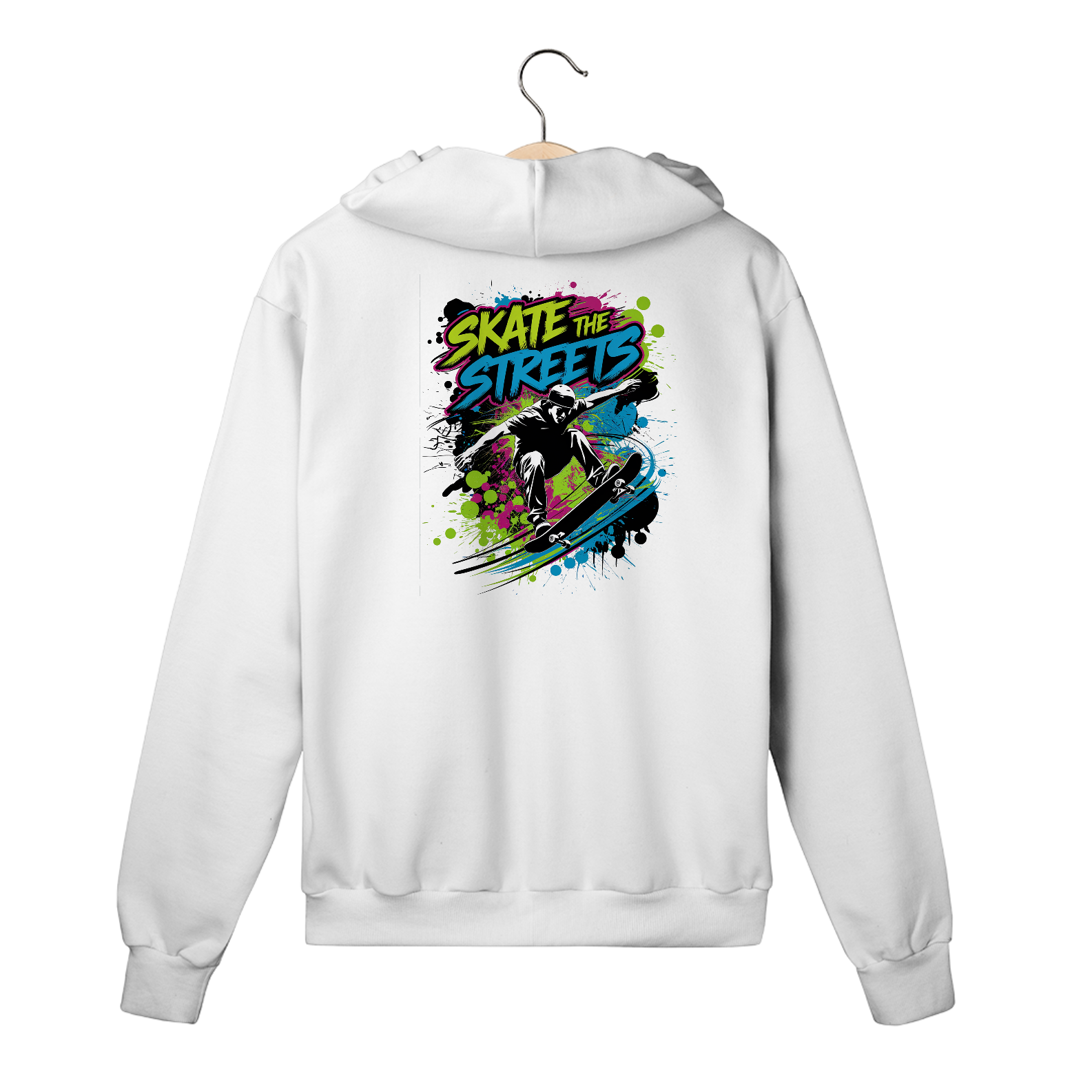 Uma estampa, de inspiração urbana, com um skatista realizando uma manobra. O skatista está no ar, com seu skate girando abaixo dele. O fundo é preenchido com respingos de tinta estilo grafite em cores neon brilhantes. Acima da figura, a tipografia em negrito diz "Skate the Streets". Os respingos de tinta adicionam movimento dinâmico. A estética geral é arte de rua.
