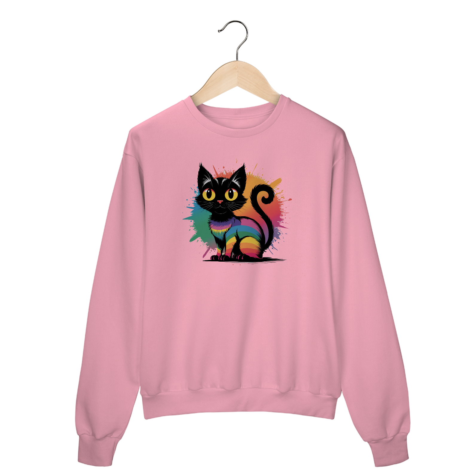 Uma estampa psicodélica de uma silhueta de gato preto com pelo de arco-íris.