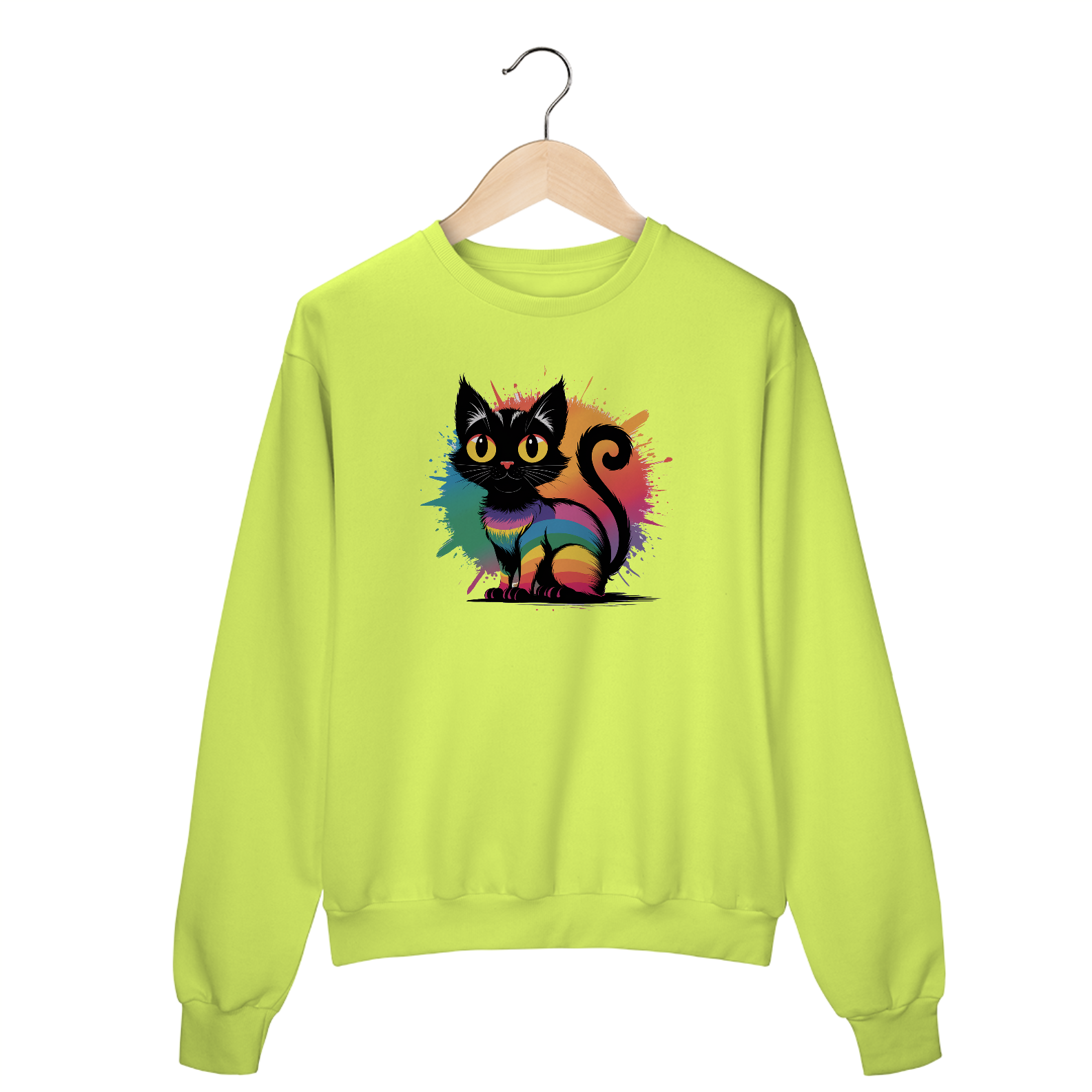 O gato tem grandes olhos amarelos e está contra um fundo branco. O corpo do gato é preenchido com cores vibrantes e detalhes em neon. contém respingos