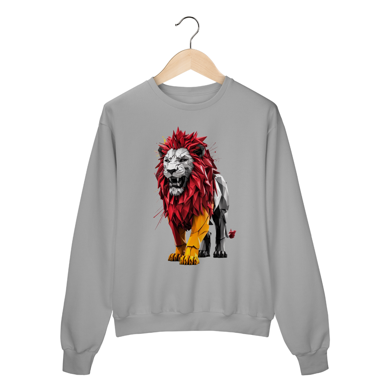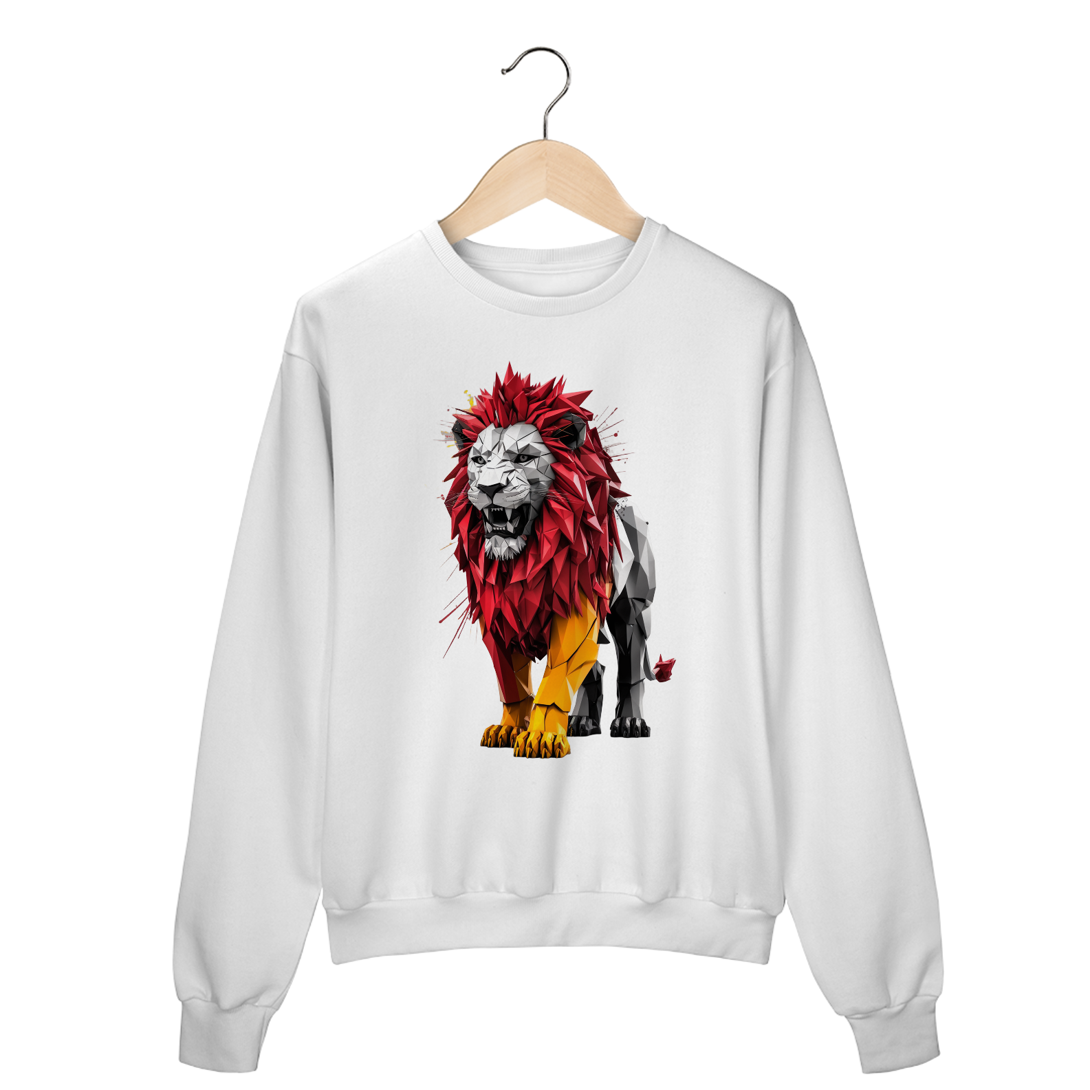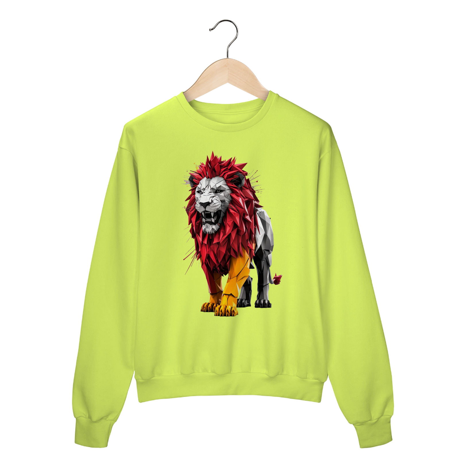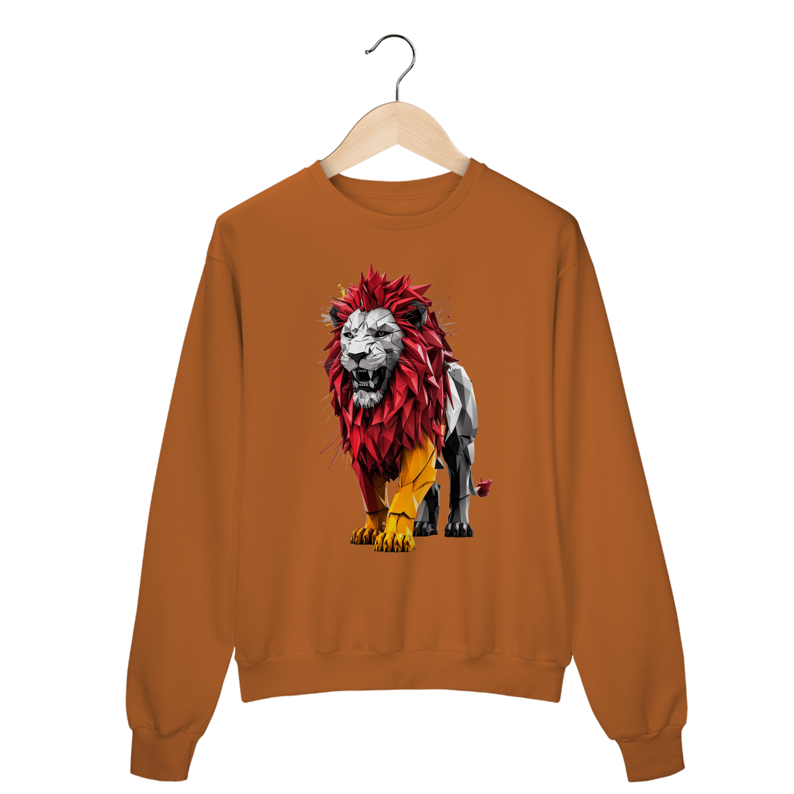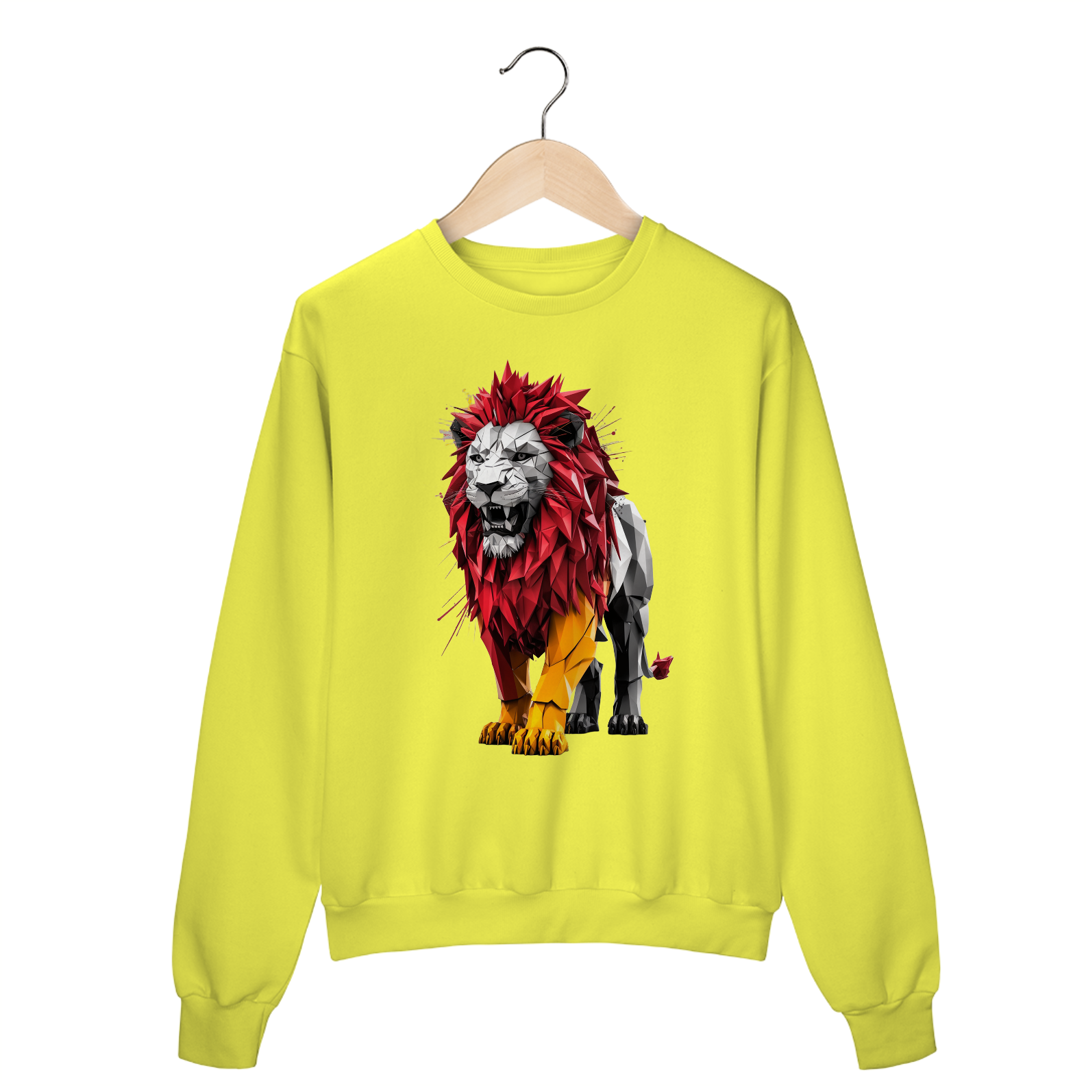 Uma estampa extraordinária e fascinante que mostra um leão poderoso e dinâmico meticulosamente trabalhado a partir de formas geométricas intrincadas e linhas ousadas. A combinação marcante das cores vermelha e amarela do leão irradia uma sensação de urgência e energia, capturando a atenção do observador.