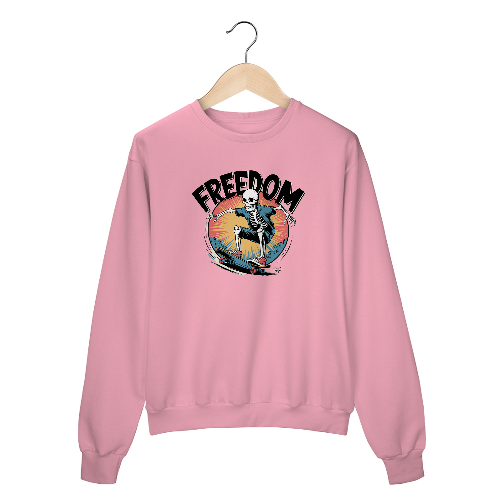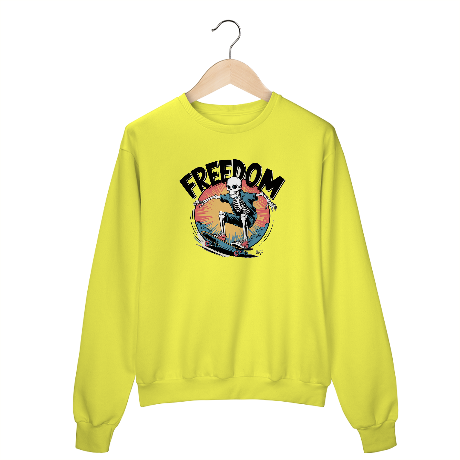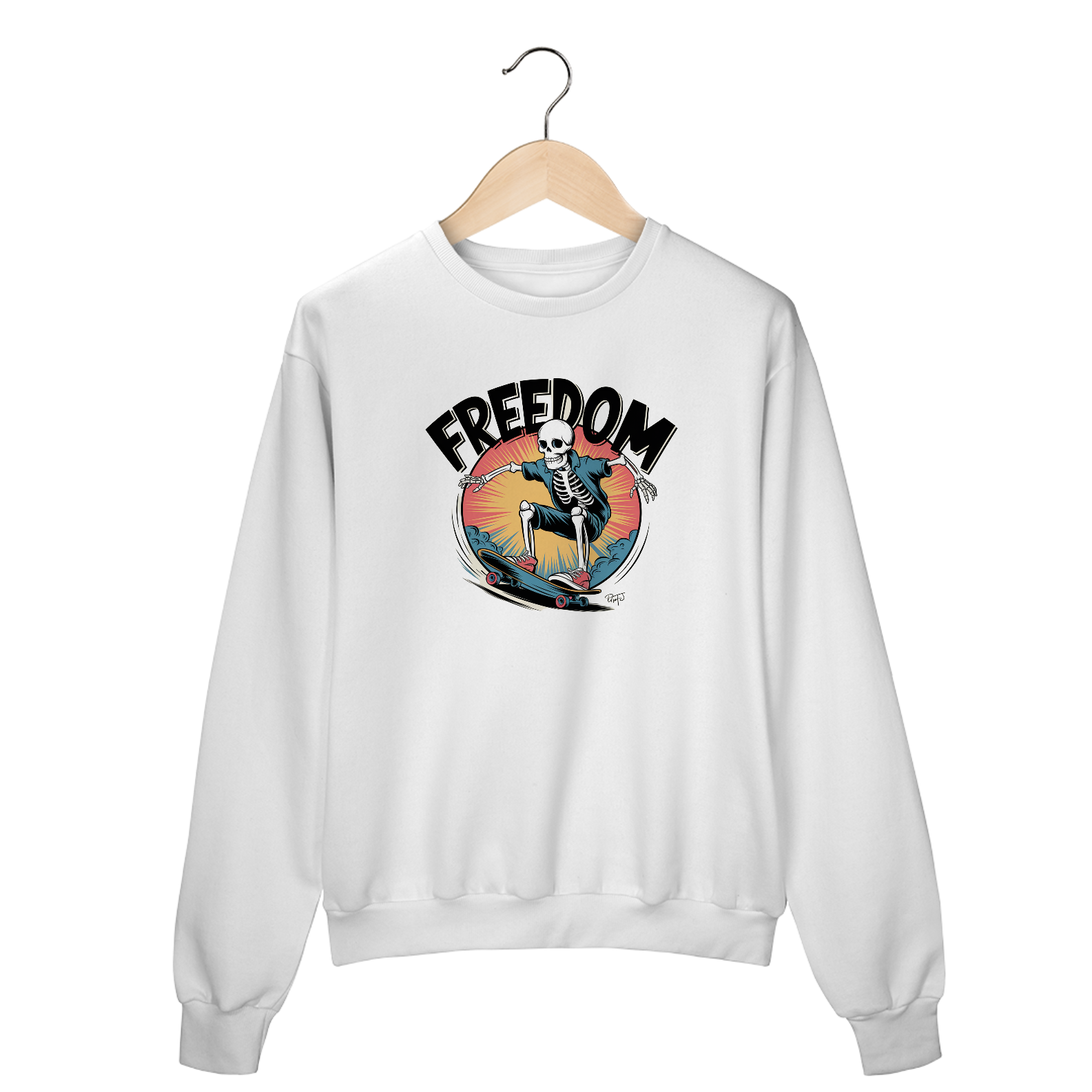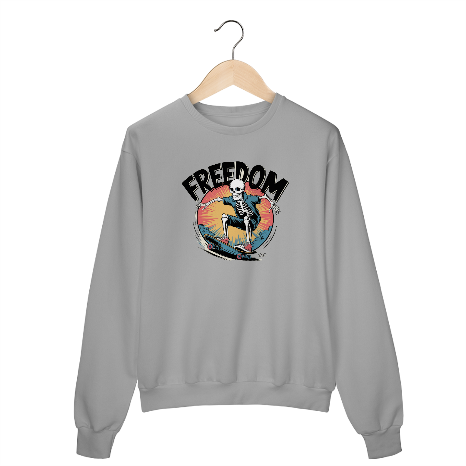 Uma estampa ousada, dinâmica e desenhada à mão de um esqueleto andando de skate no estilo surrealismo. A estampa apresenta contornos pretos grossos, cores vibrantes e uma história em quadrinhos retrô. O texto "liberdade" aparece em fonte em negrito, sombreada e estilo vintage, colocada de forma proeminente dentro de uma composição circular. A arte reflete o espírito energético e rebelde da cultura do skate, com alto contraste e detalhes corajosos