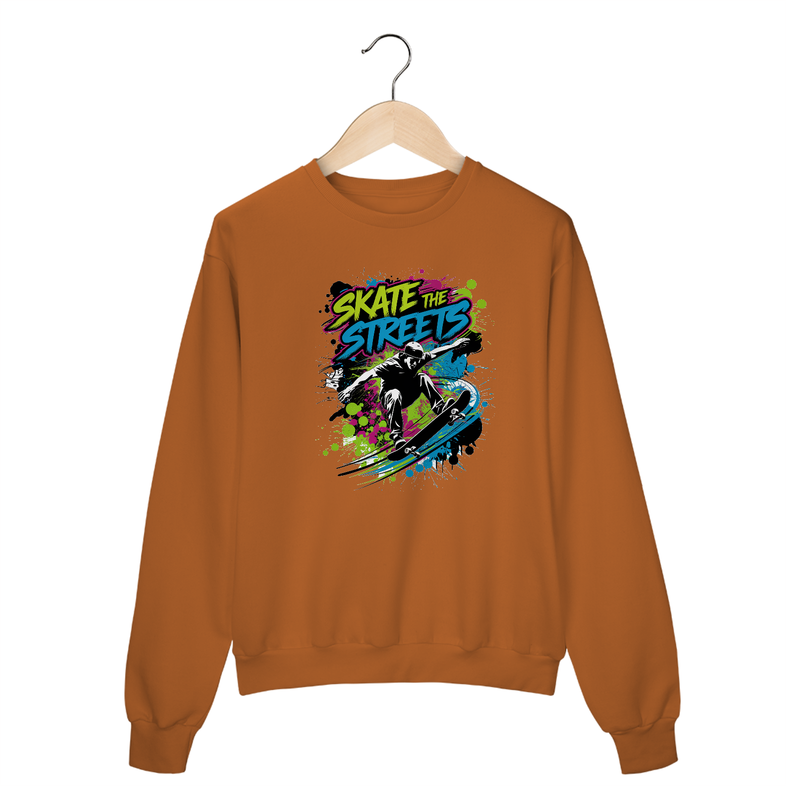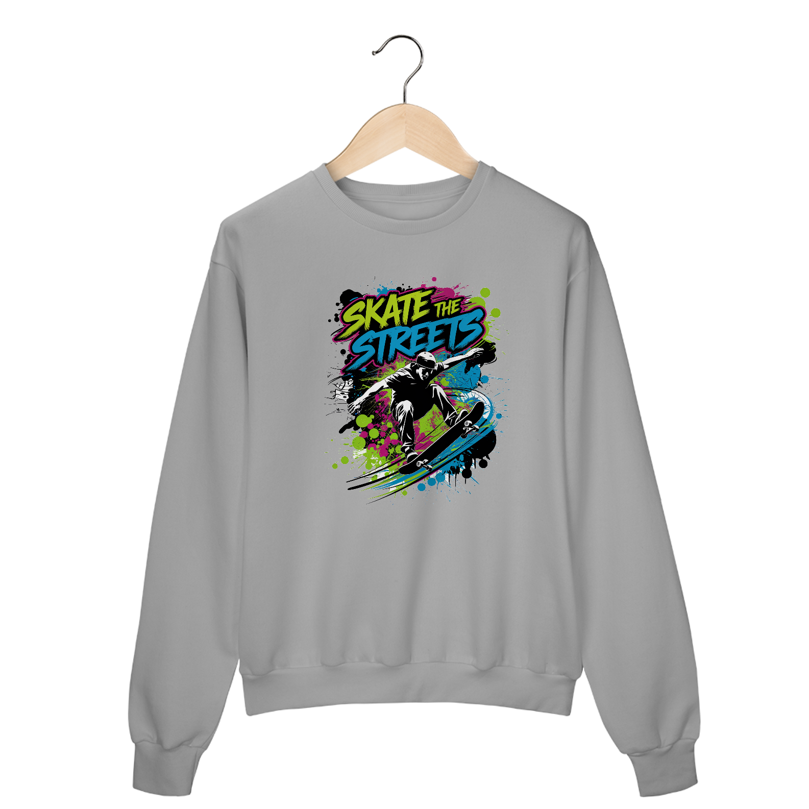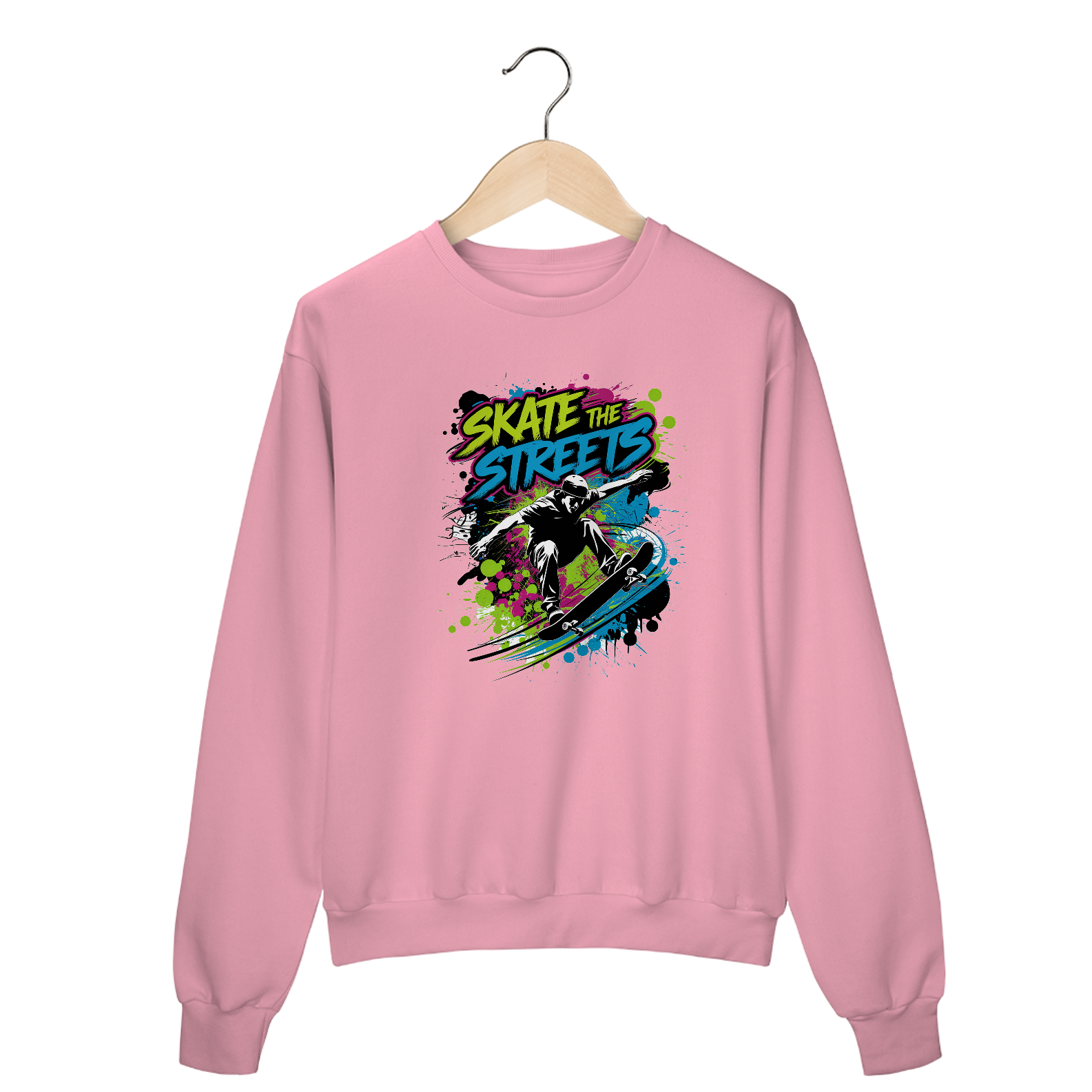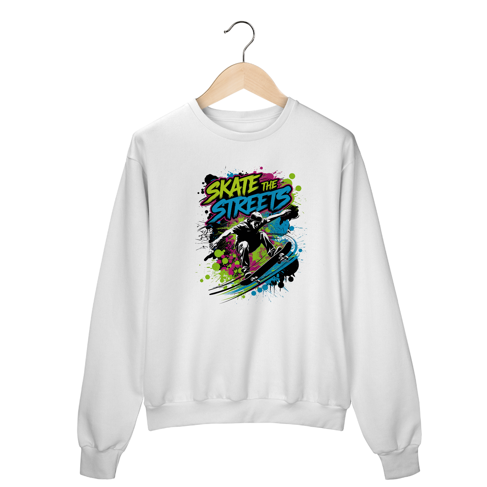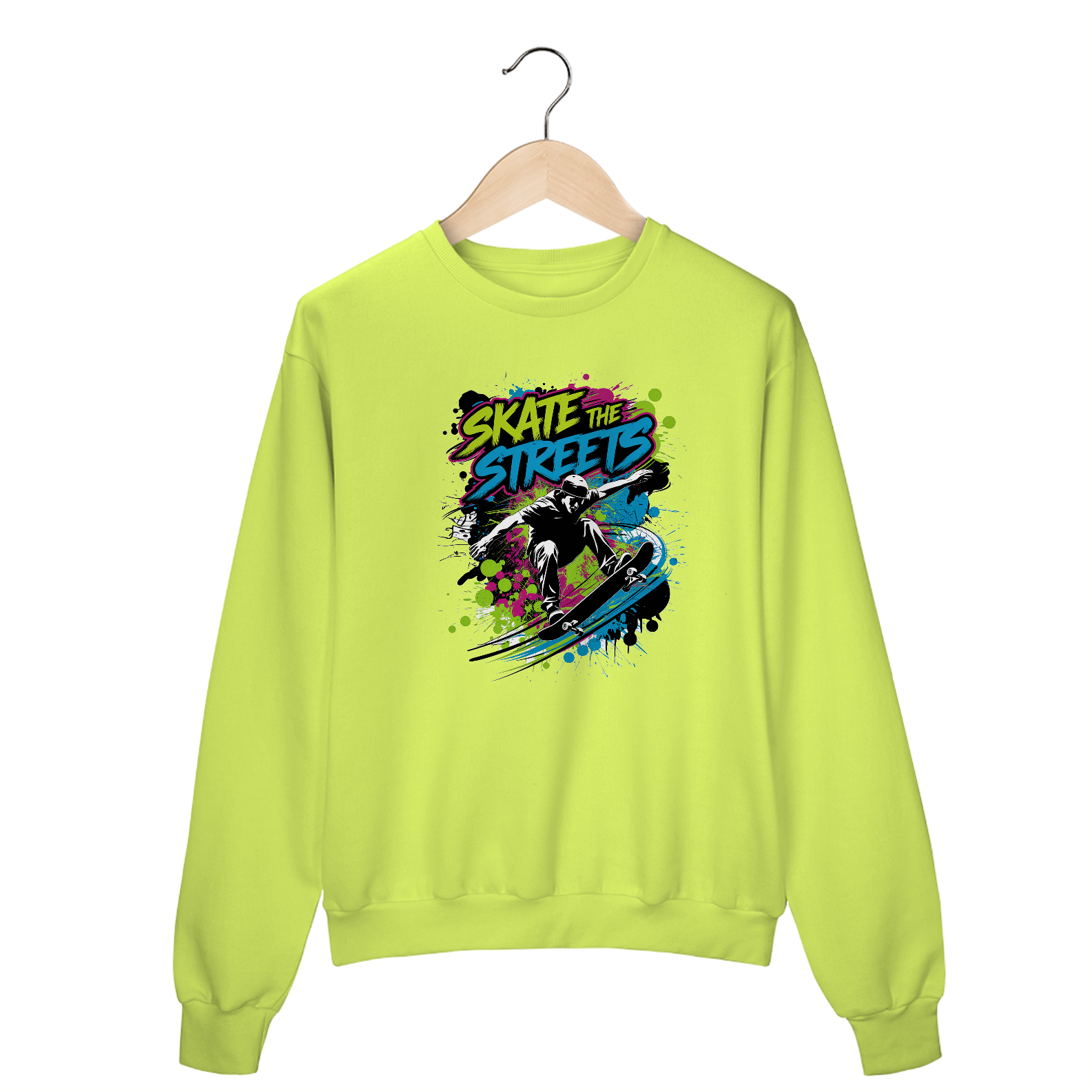 Uma estampa, de inspiração urbana, com um skatista realizando uma manobra. O skatista está no ar, com seu skate girando abaixo dele. O fundo é preenchido com respingos de tinta estilo grafite em cores neon brilhantes. Acima da figura, a tipografia em negrito diz "Skate the Streets". Os respingos de tinta adicionam movimento dinâmico. A estética geral é arte de rua.