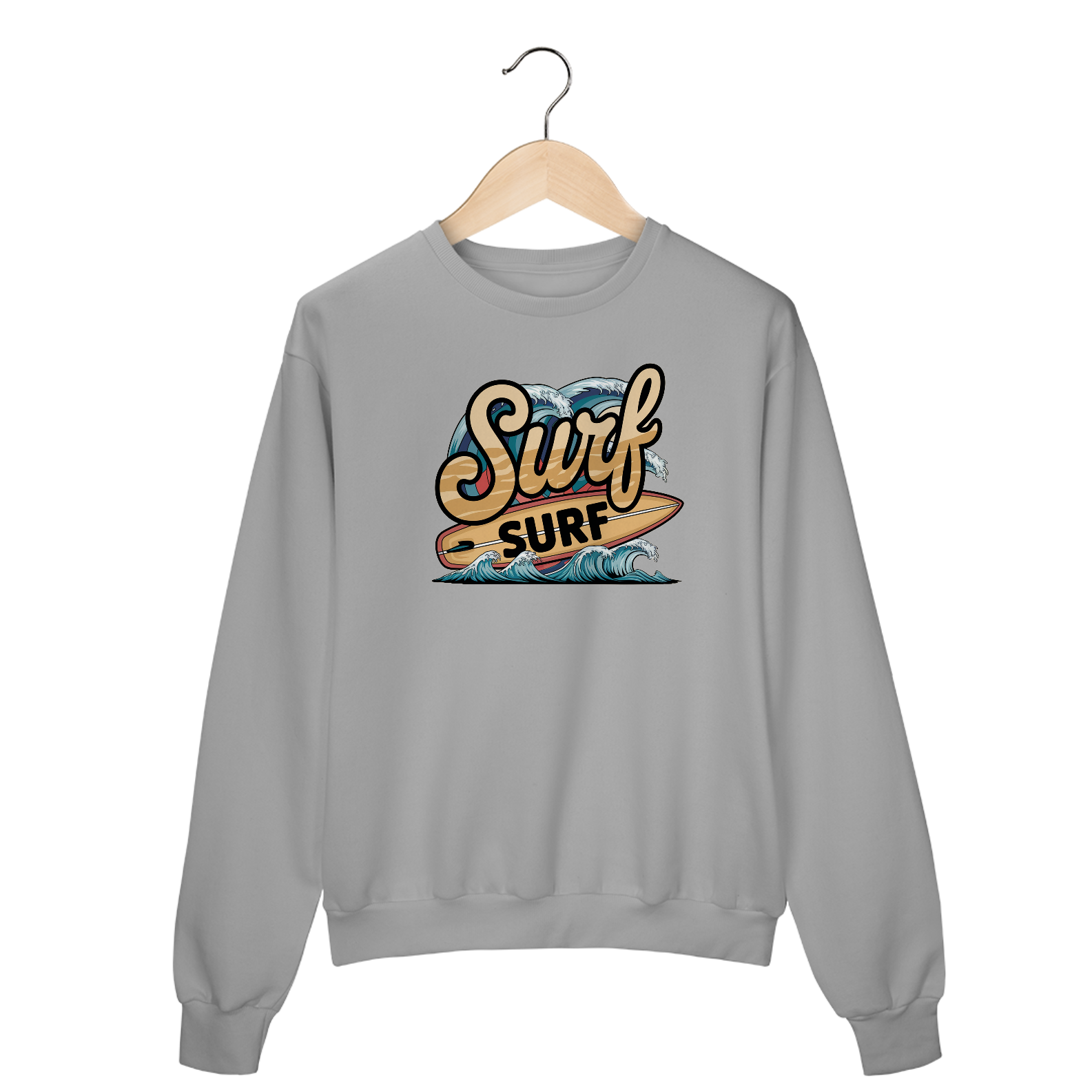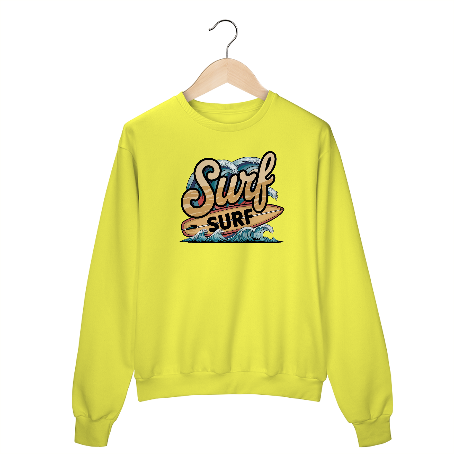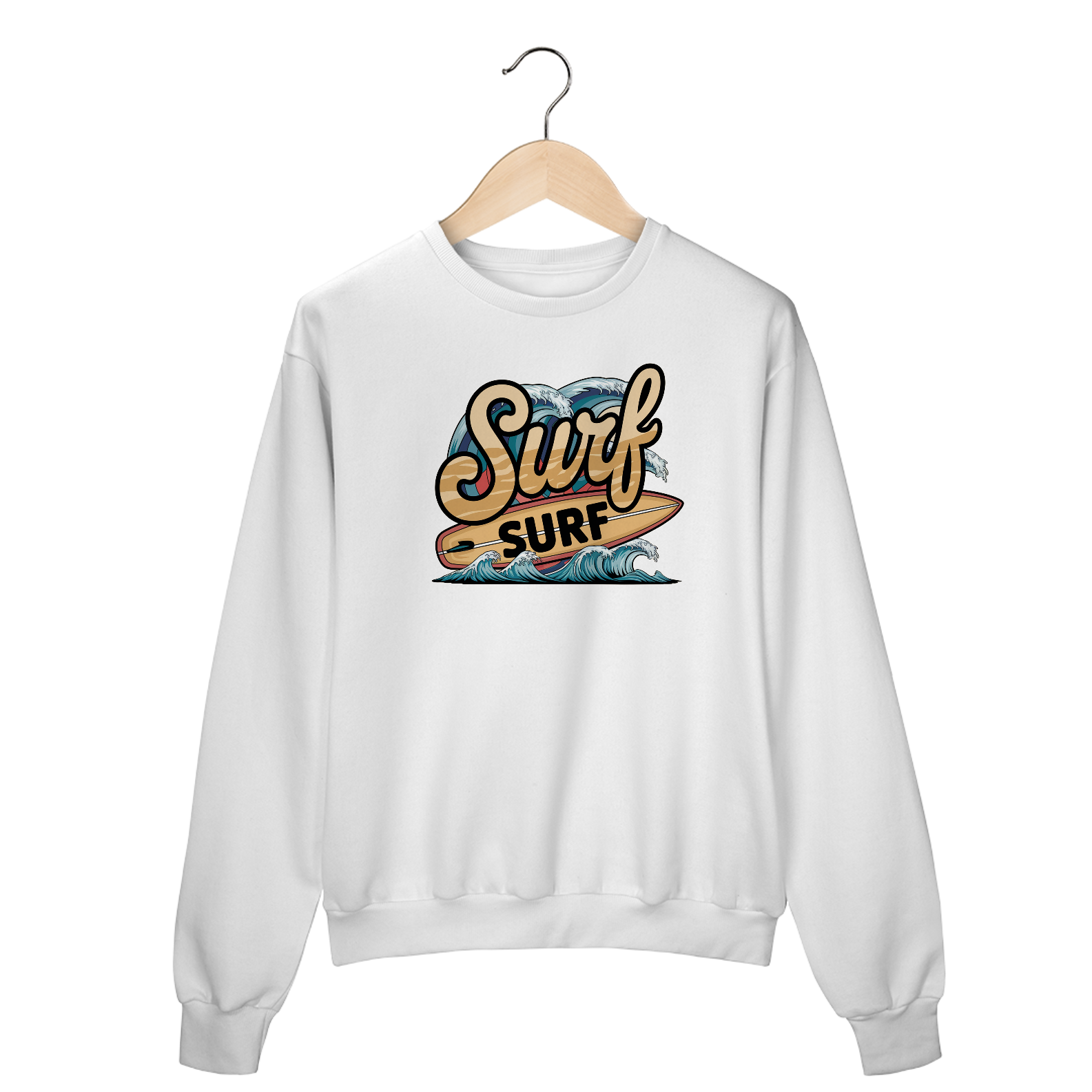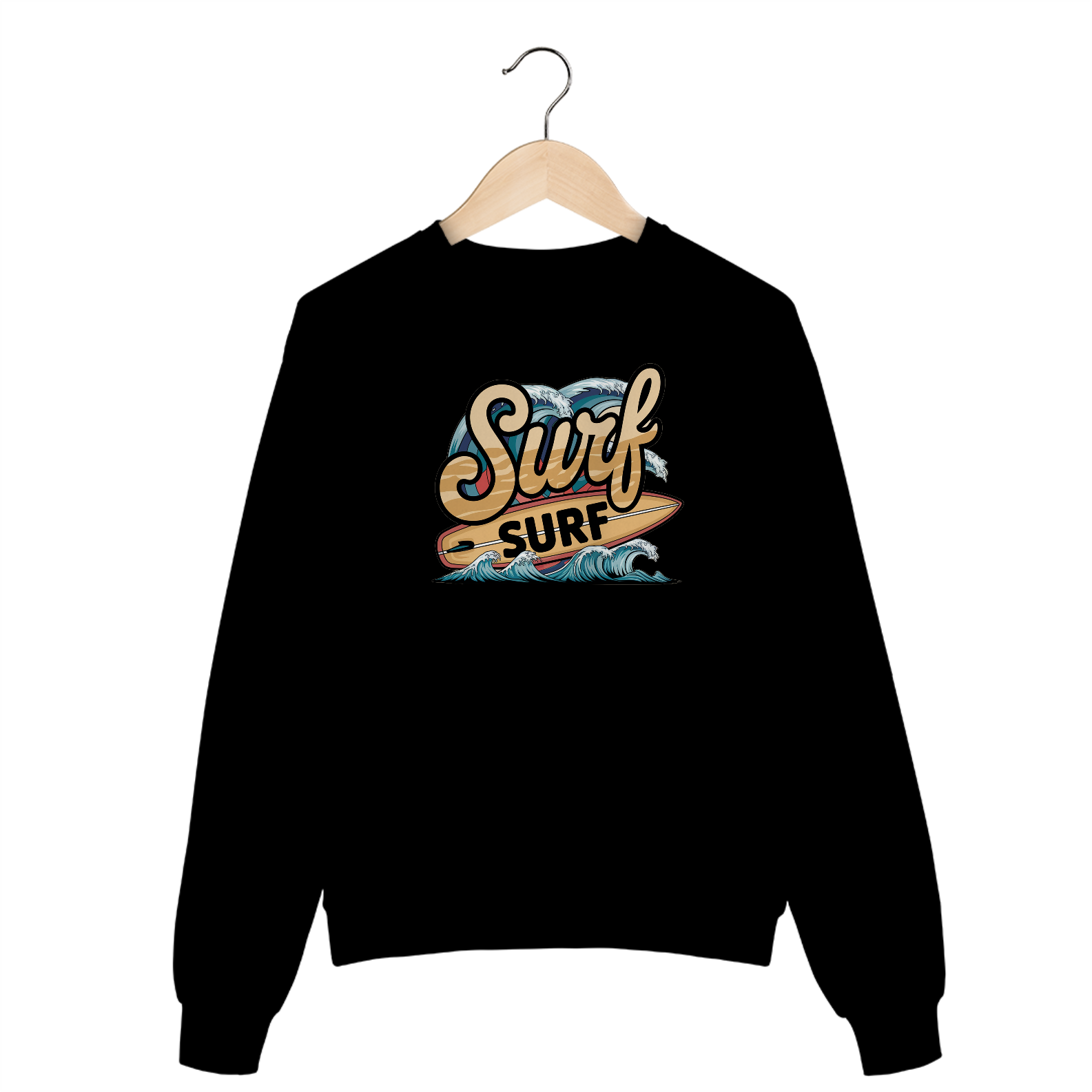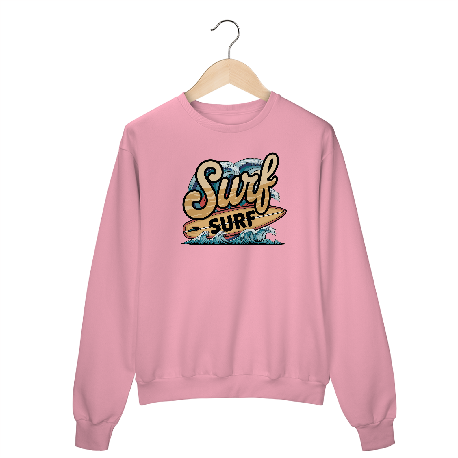 Uma estampa retrô da palavra "surf" em uma fonte de praia curva. Abaixo do texto, há uma prancha de surf com a palavra "surf" escrita nela. Há ondas com cores vibrantes no fundo.