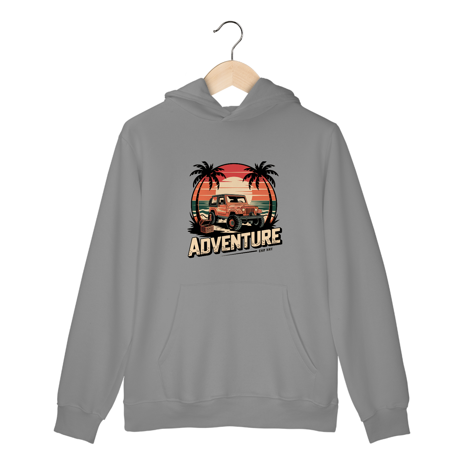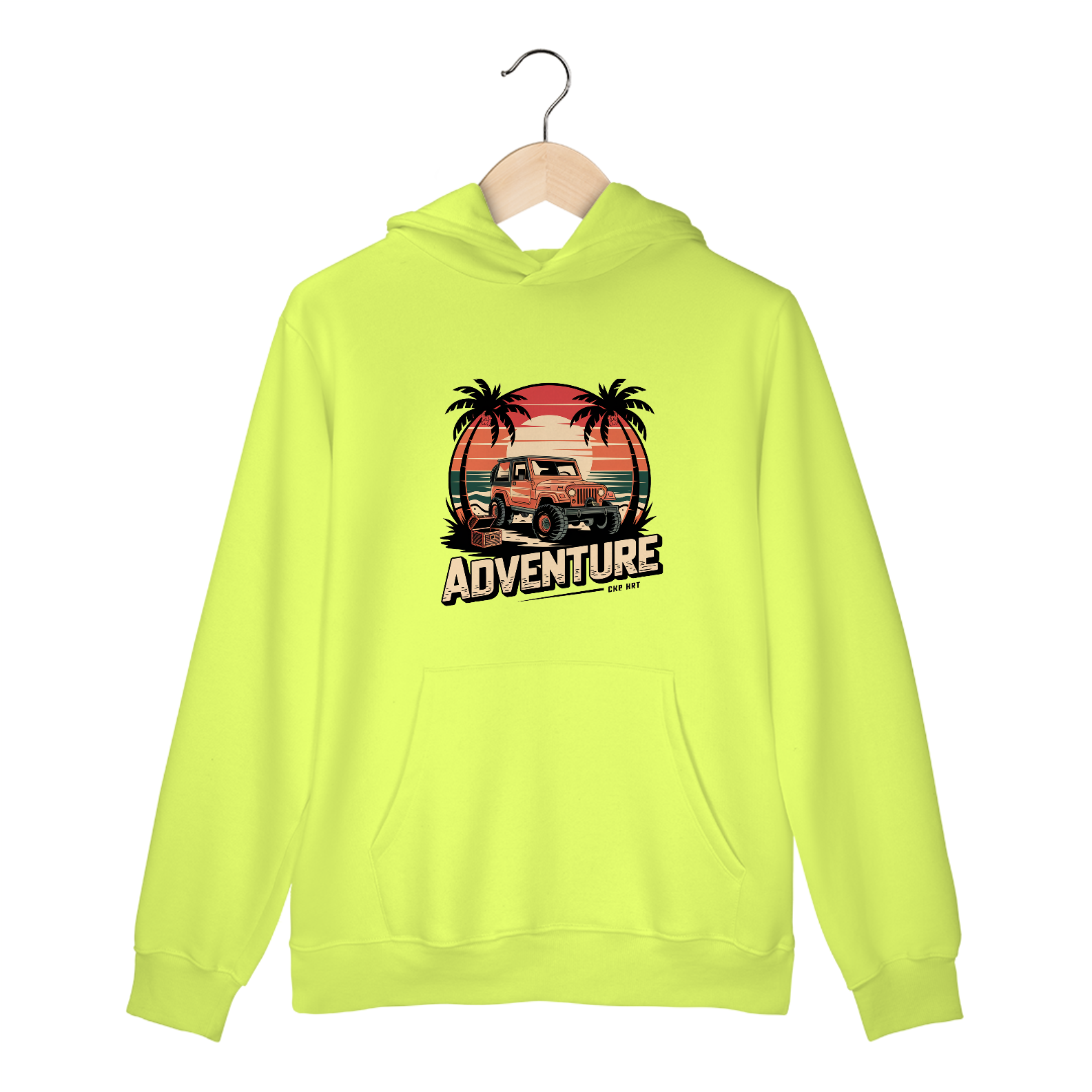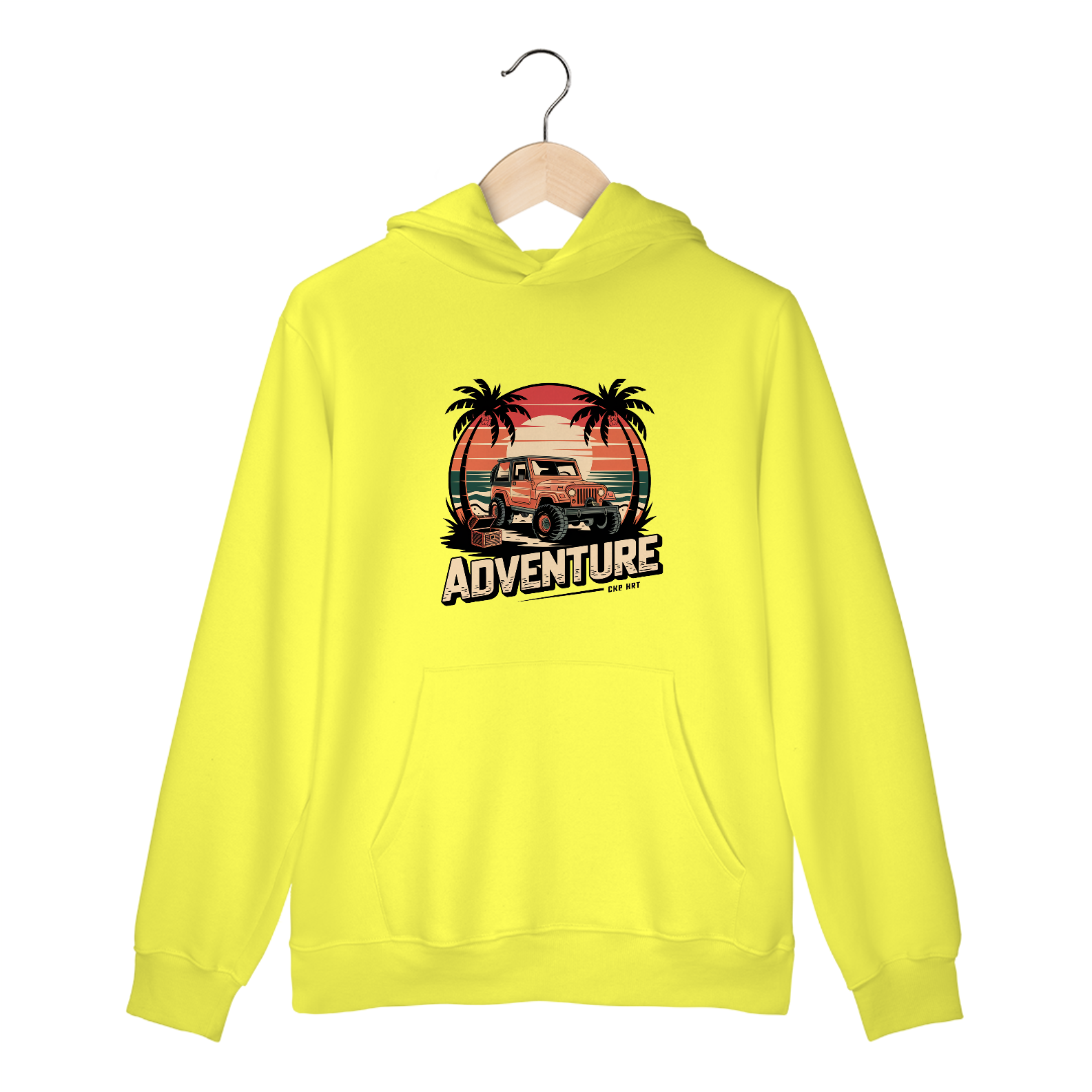 Uma estampa de um  jipe ​​off-road robusto em uma praia tropical ao pôr do sol. Inclua palmeiras em ambos os lados do design, um grande sol e ondas do oceano no fundo. Use uma paleta de cores de tons quentes de pôr do sol (laranja, vermelho, amarelo) e verdes profundos. Adicione elementos de viagem, como um baú de tesouro perto do jipe, para destacar o senso de aventura.