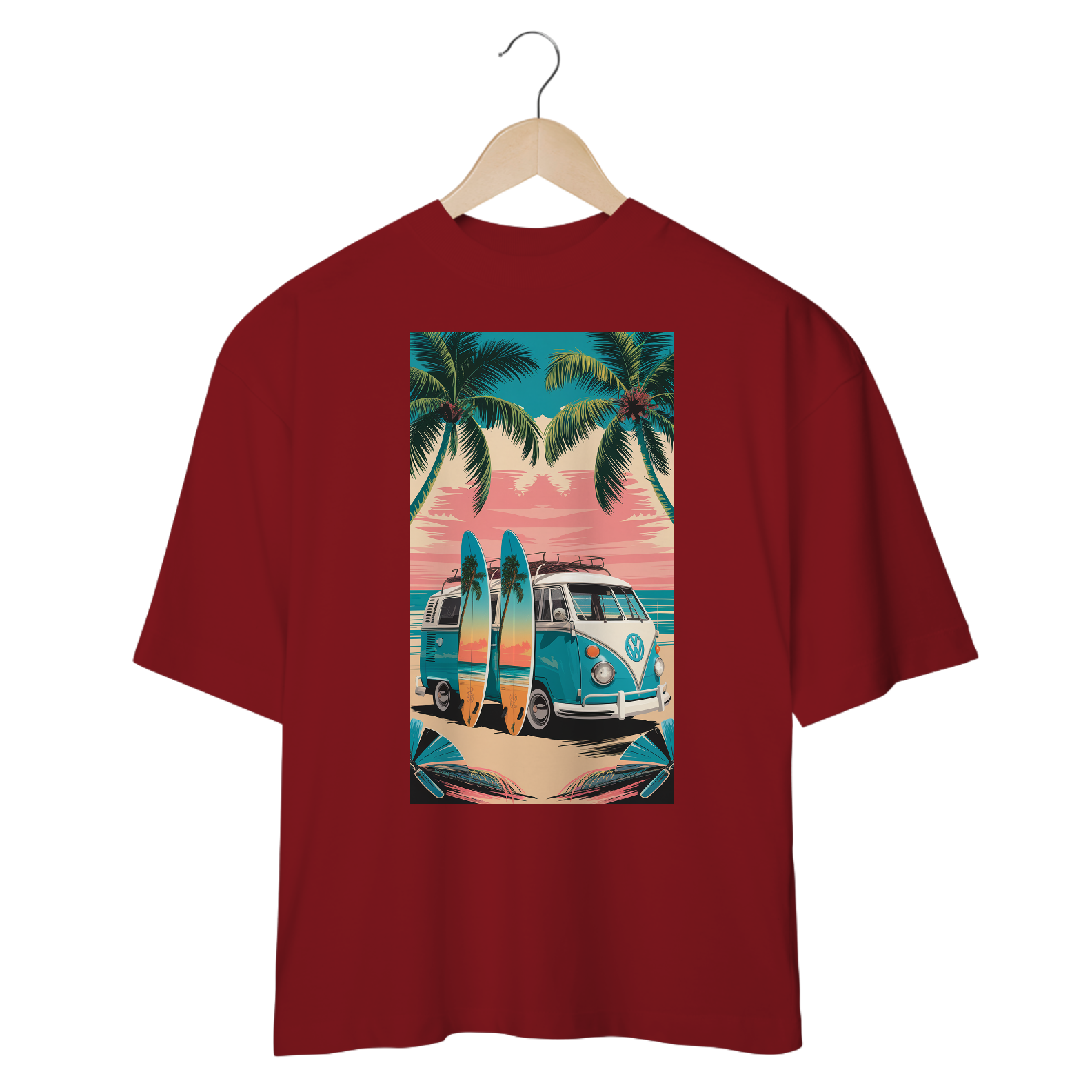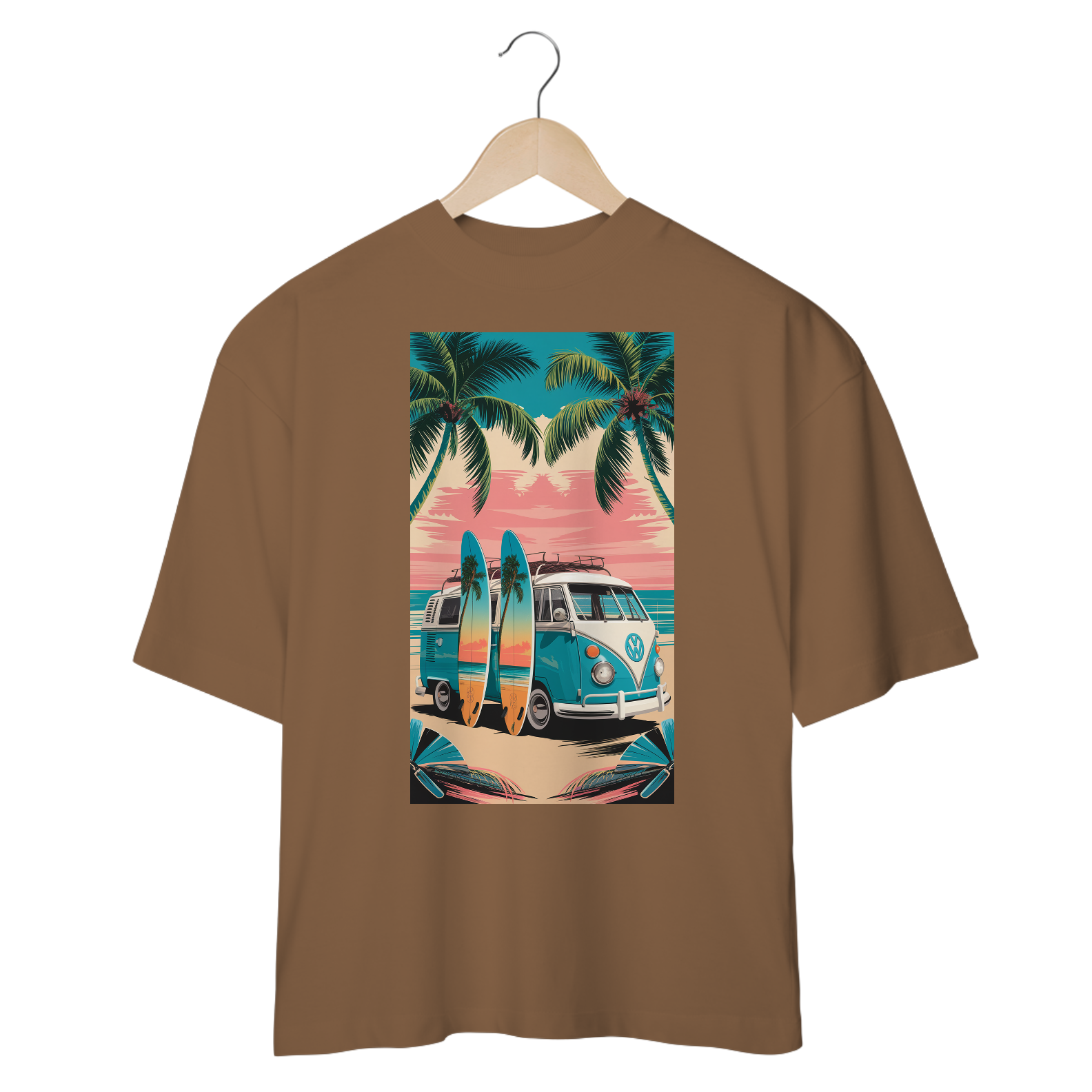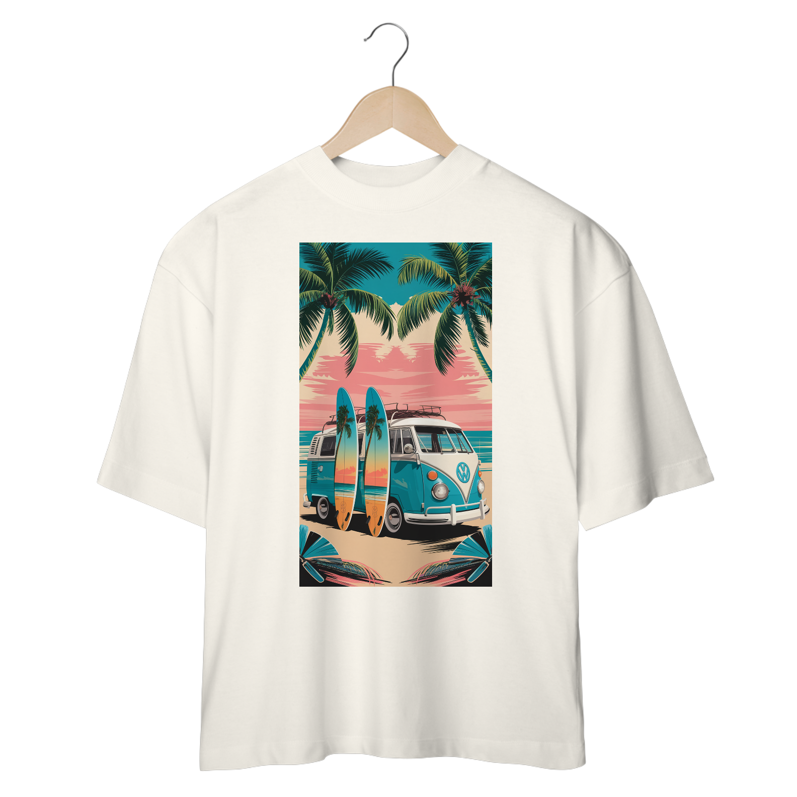 Uma estampa premiada de uma van de surf VW estacionada em uma praia. A van tem pranchas de surf pintadas à mão encostadas nela, cada uma com uma cena de dupla exposição de palmeiras verdejantes em uma praia tropical. O fundo contém um lindo oceano com céu rosa e uma praia cheia de palmeiras verdejantes
