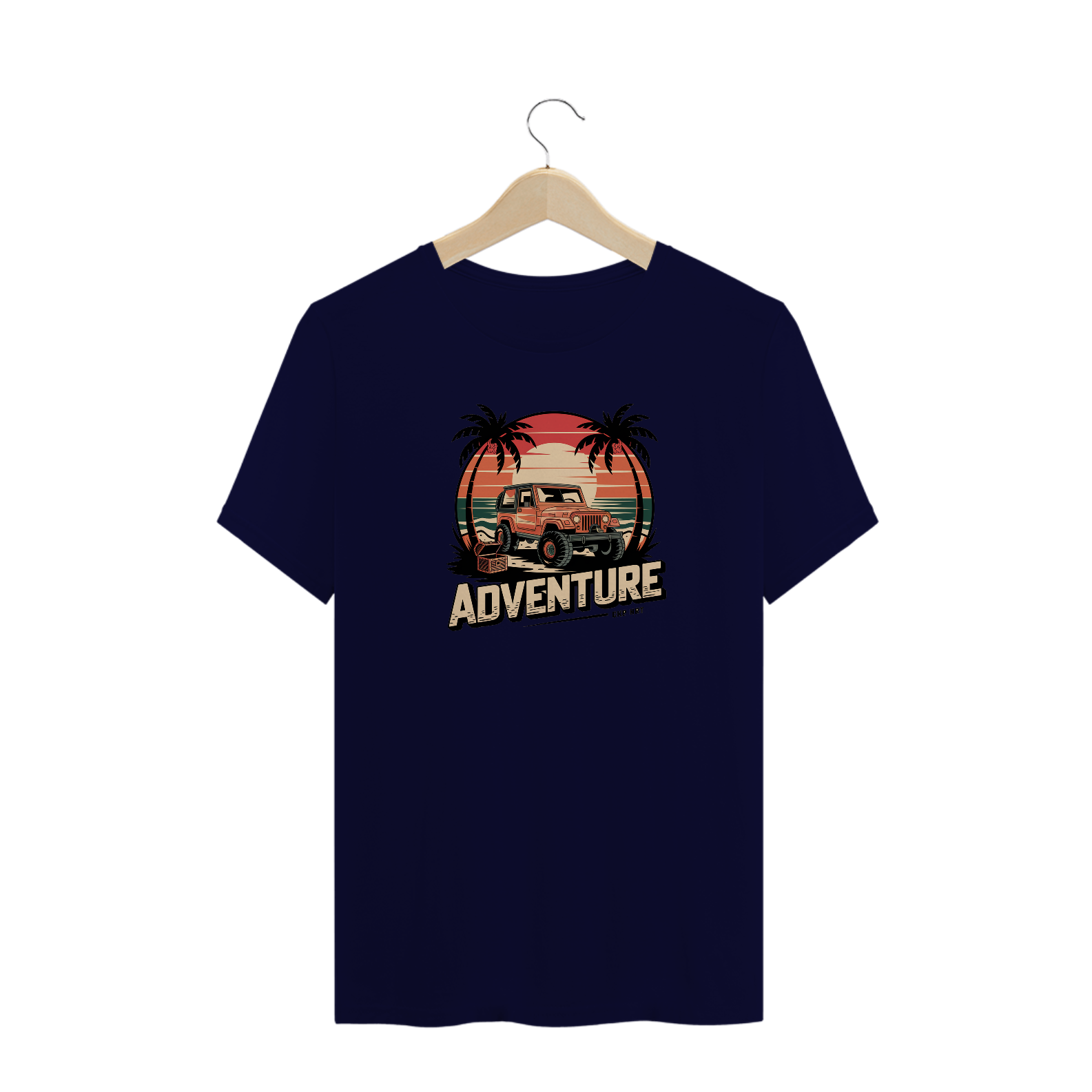 Uma estampa de um  jipe ​​off-road robusto em uma praia tropical ao pôr do sol. Inclua palmeiras em ambos os lados do design, um grande sol e ondas do oceano no fundo. Use uma paleta de cores de tons quentes de pôr do sol (laranja, vermelho, amarelo) e verdes profundos. Adicione elementos de viagem, como um baú de tesouro perto do jipe, para destacar o senso de aventura.