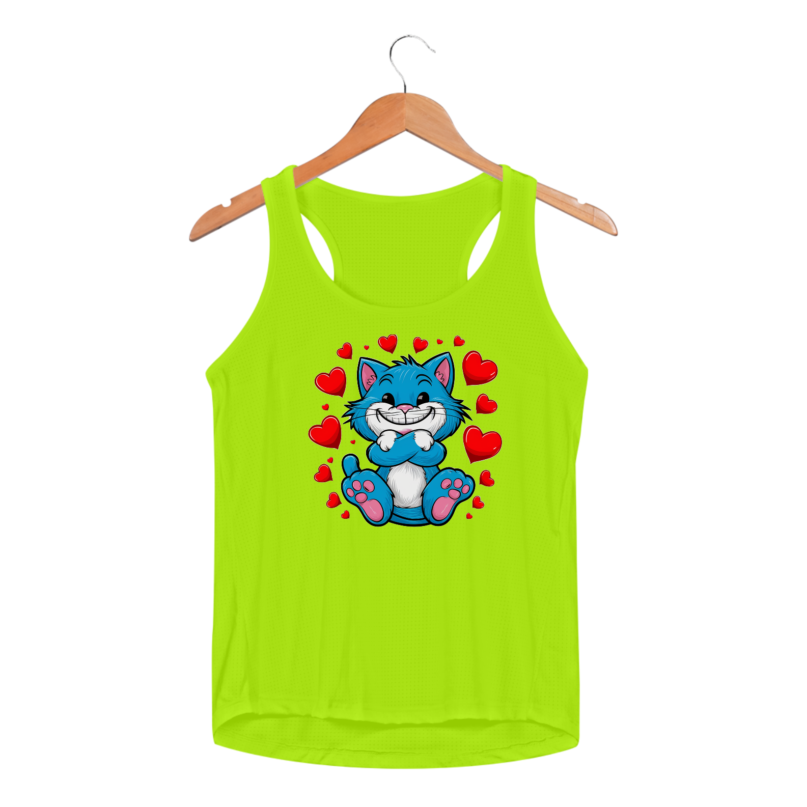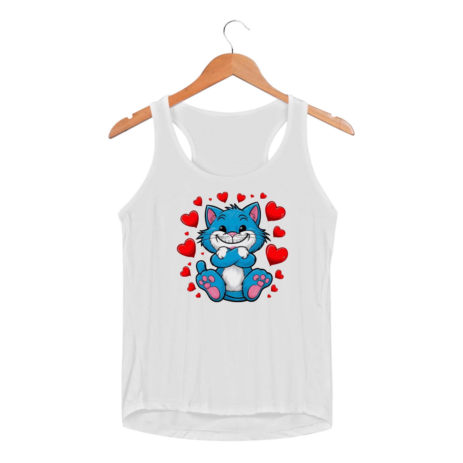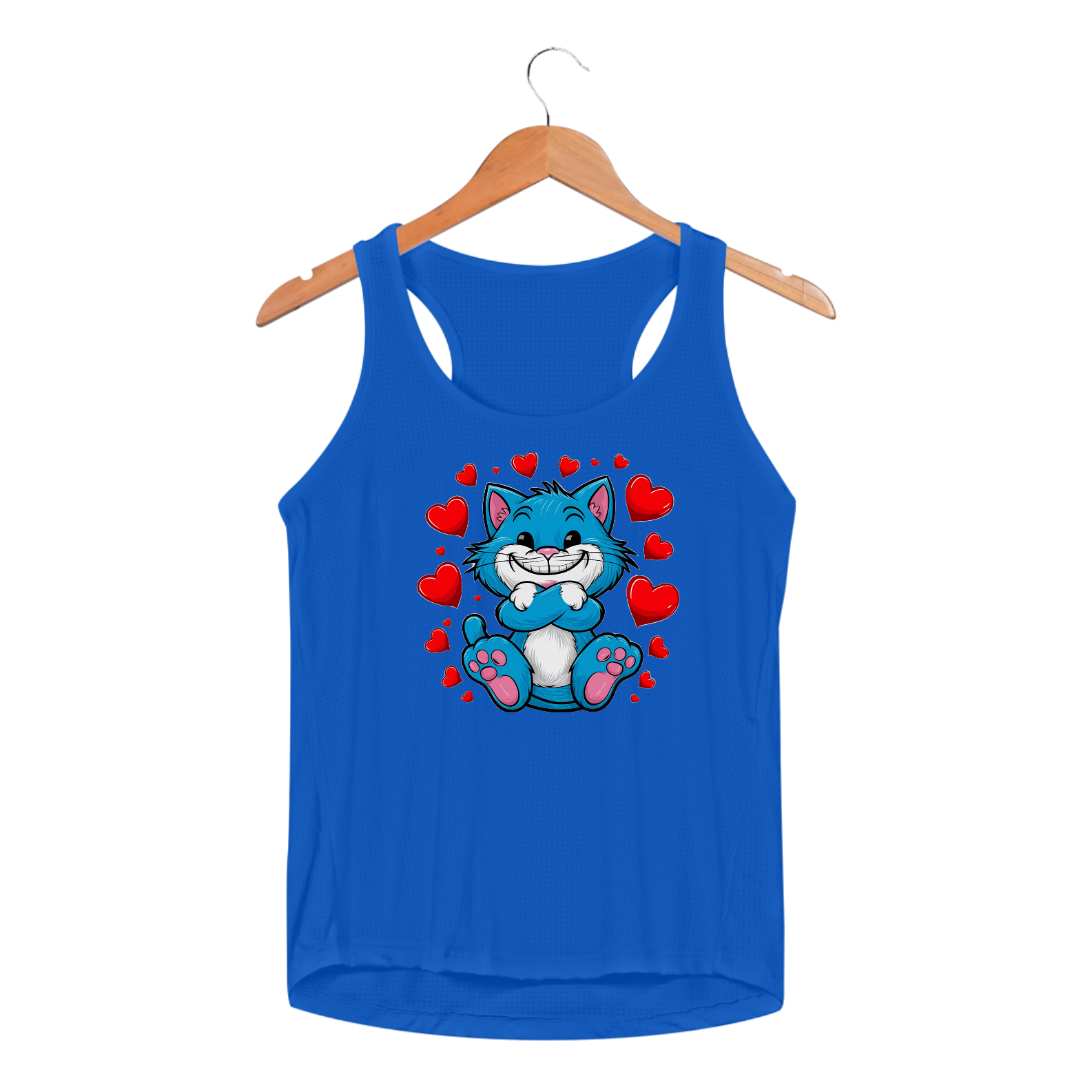 Uma estampa de um gato adorável e brincalhão, com pelo azul brilhante e um sorriso contagiante. Suas patas estão cruzadas, exalando uma aura de fofura. Ao redor do gato há corações vermelhos que flutuam, aumentando a atmosfera encantadora. Desenhado em um estilo simples e infantil com bordas arredondadas e cores vibrantes, o gato de desenho animado é colocado contra um fundo branco imaculado. A imagem geral exala felicidade e calor.