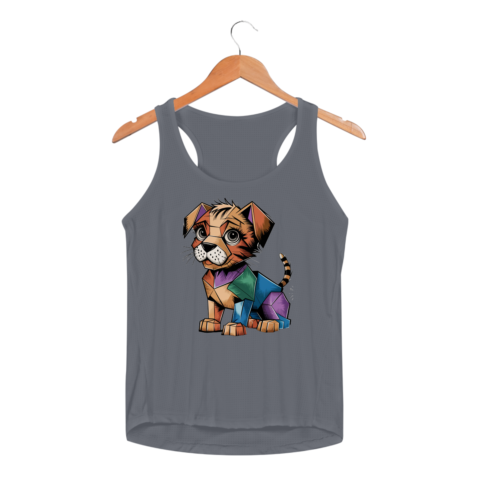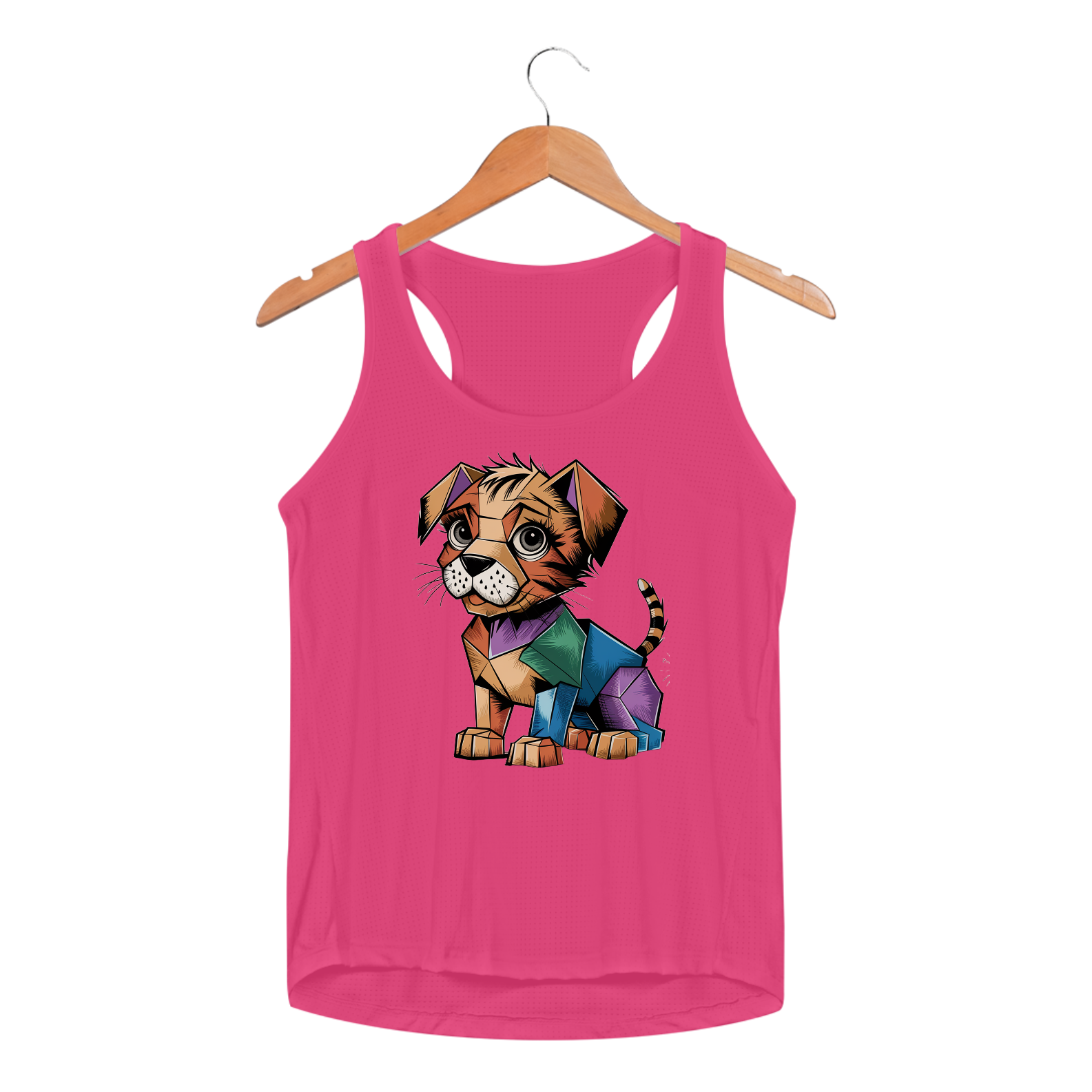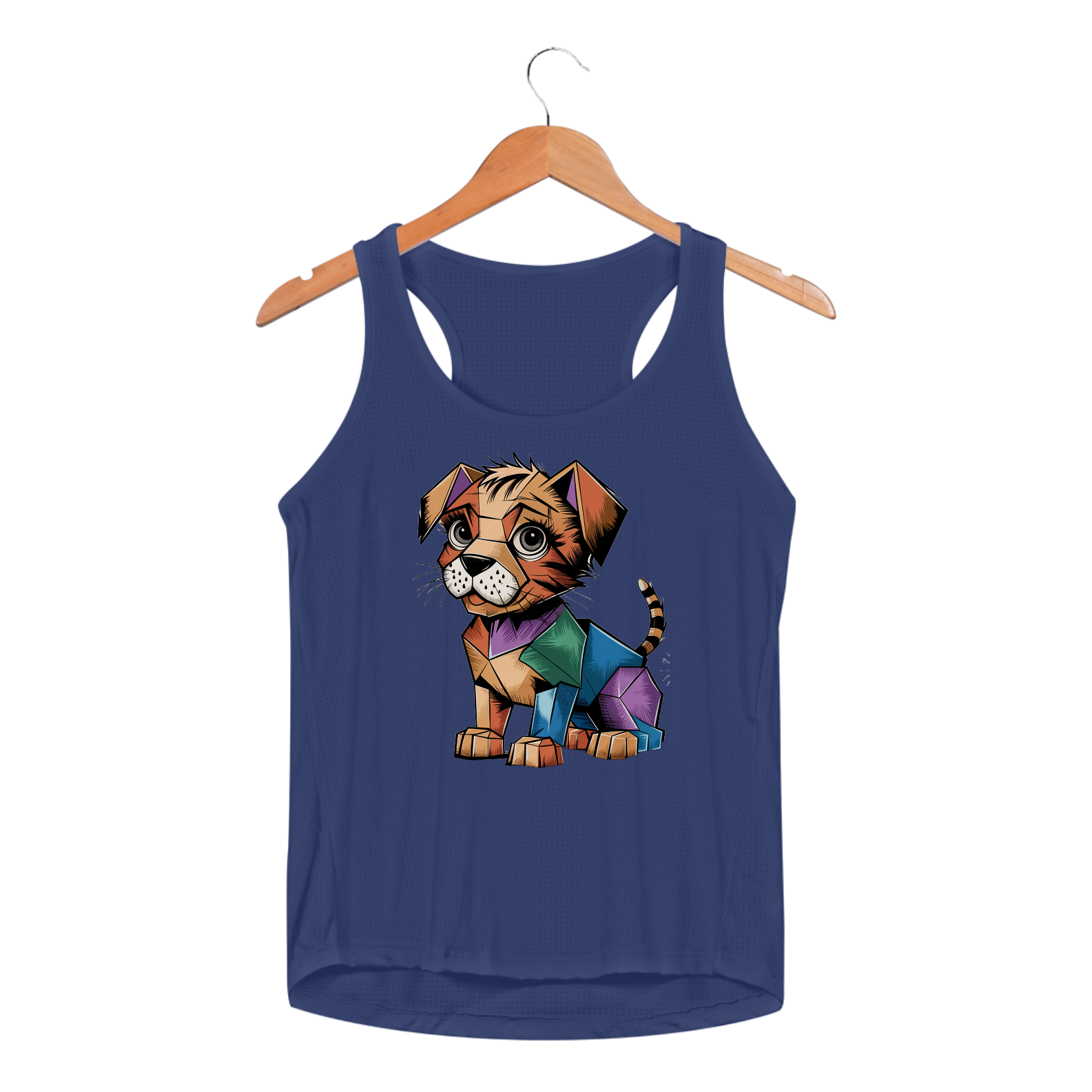 amiseta Camaleon visualmente deslumbrante e conceitual de um gatinho cubista, desenhado com precisão excepcional. O gatinho, feito de formas geométricas, é uma mistura vibrante de cores e padrões, criando um design lúdico e atraente. Seus olhos expressivos são detalhados e cheios de vida. Em uma camiseta branca, permitindo que o cachorrinho realmente se destaque e cative o observador com seu design único e inovador.