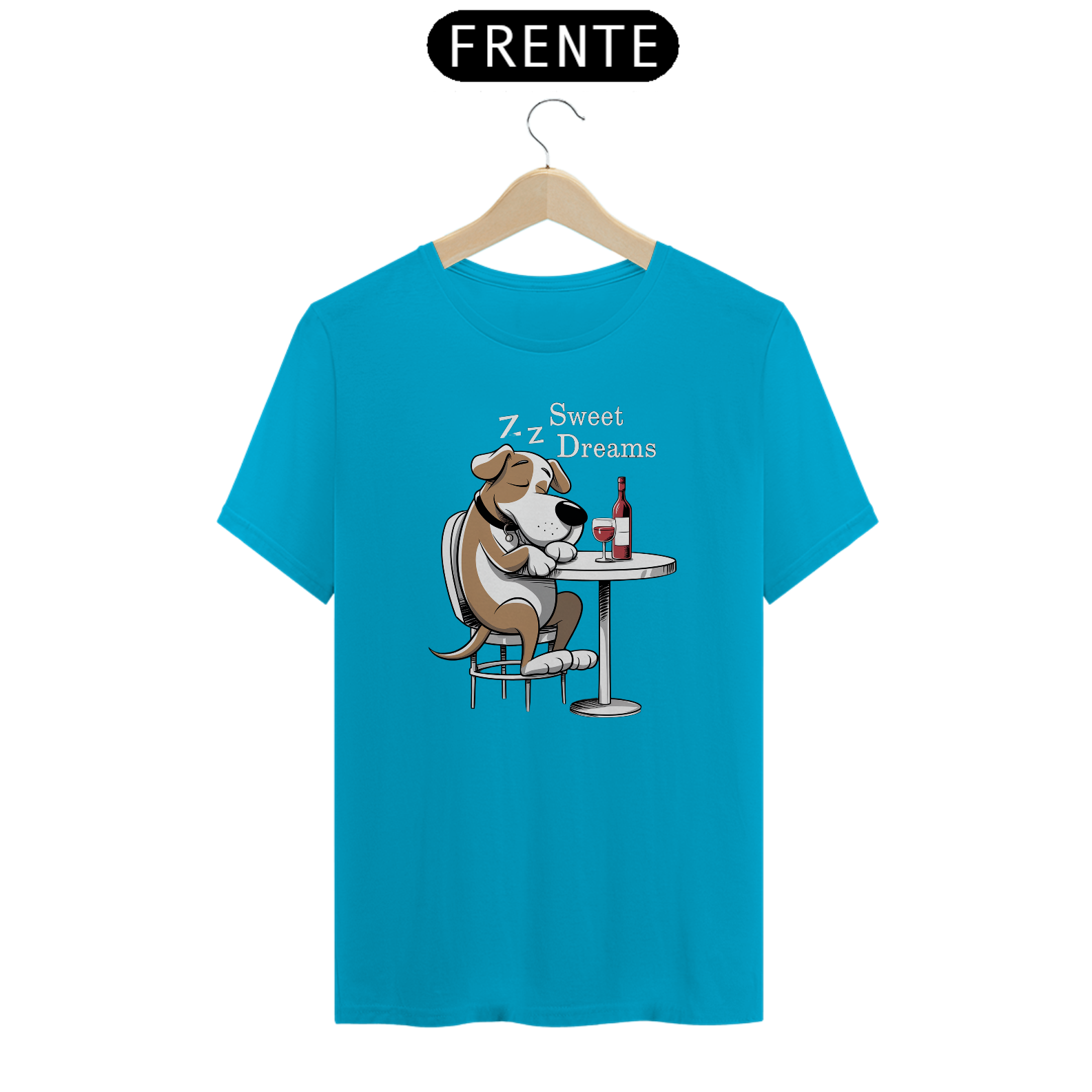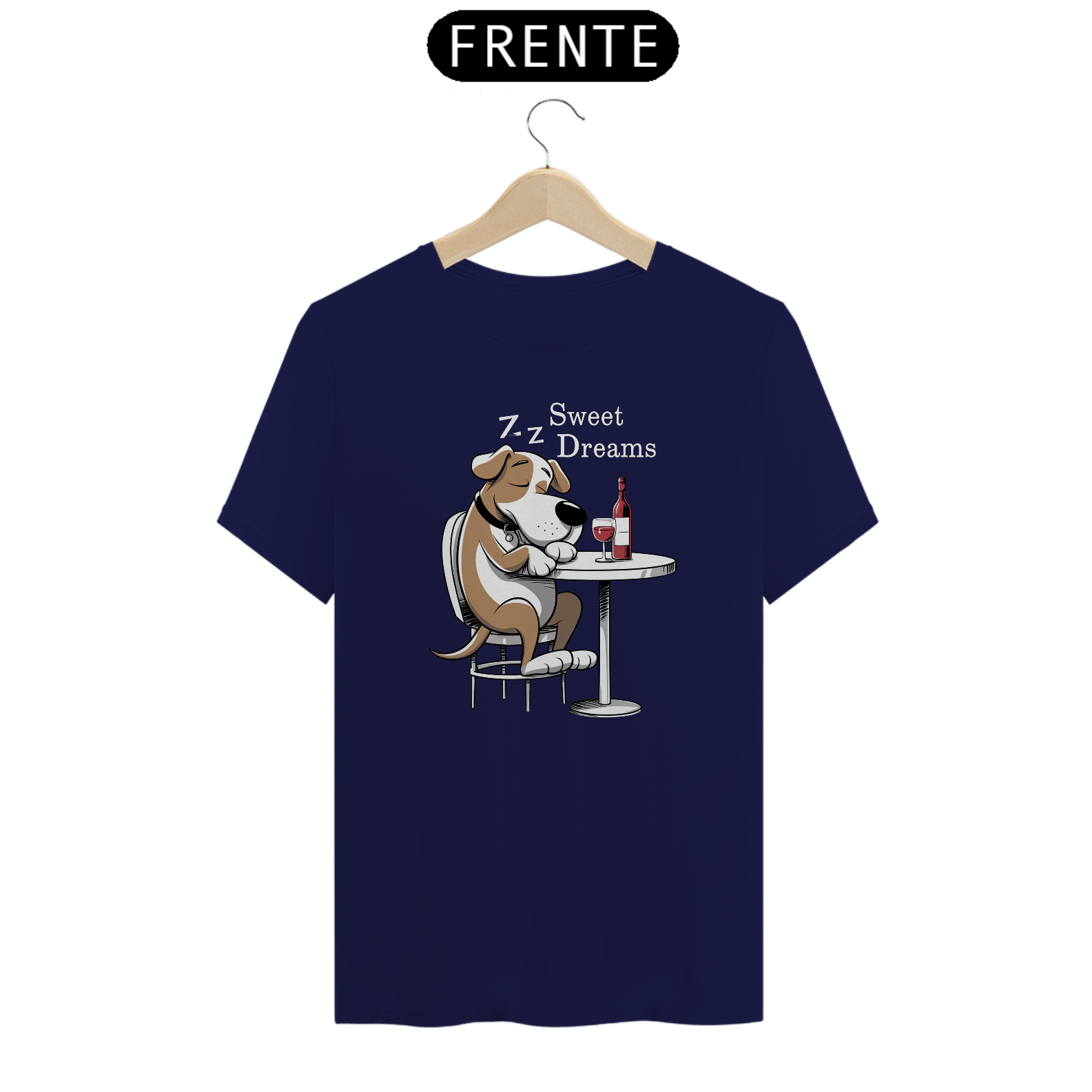 Estampa de um  cachorro de desenho animado está sentado em uma mesa redonda, dormindo com uma garrafa de vinho tinto. O cão está em uma postura relaxada. O fundo é escuro, enfatizando o cachorro e a mesa. As palavras "DOCES SONHOS" são exibidas acima da cabeça do cachorr