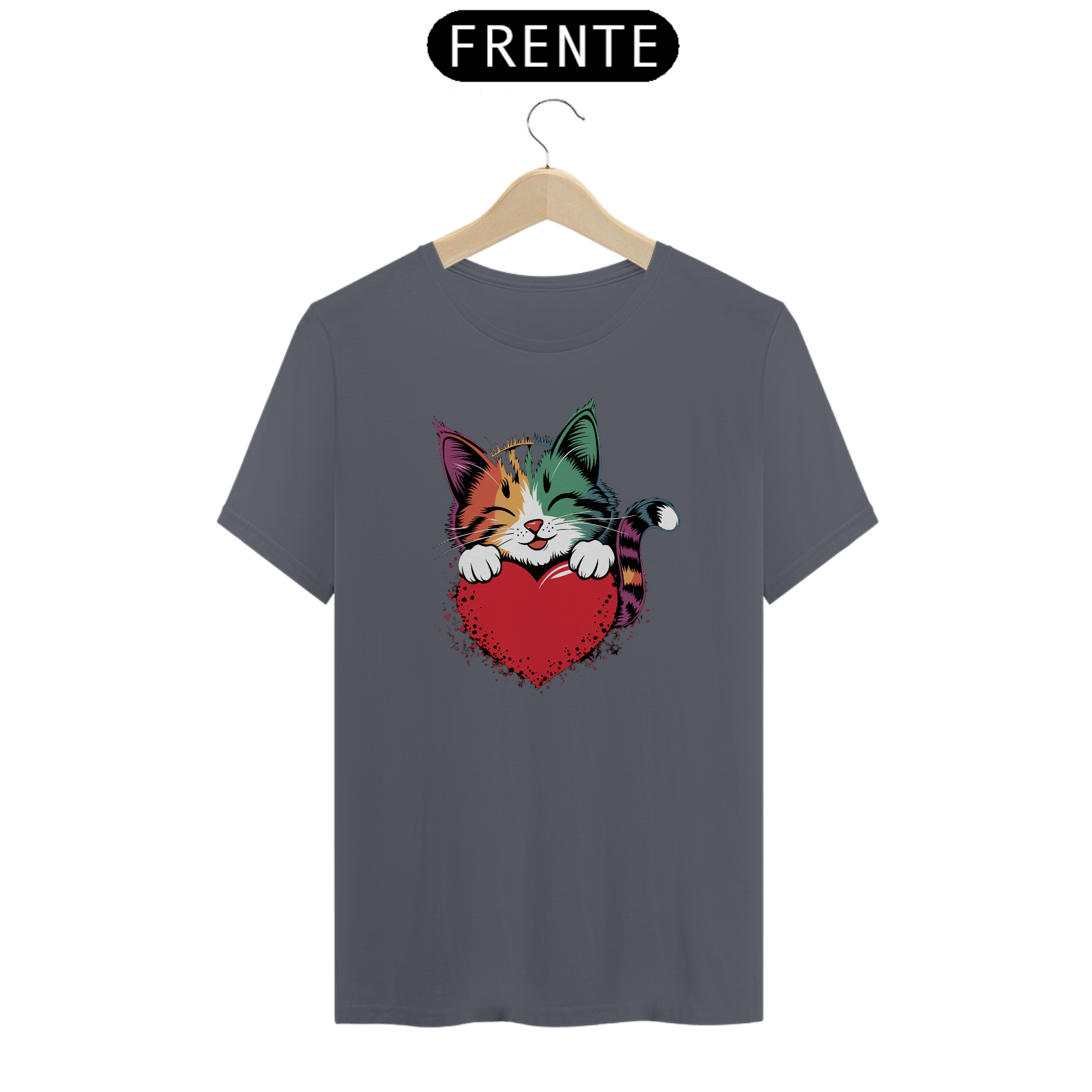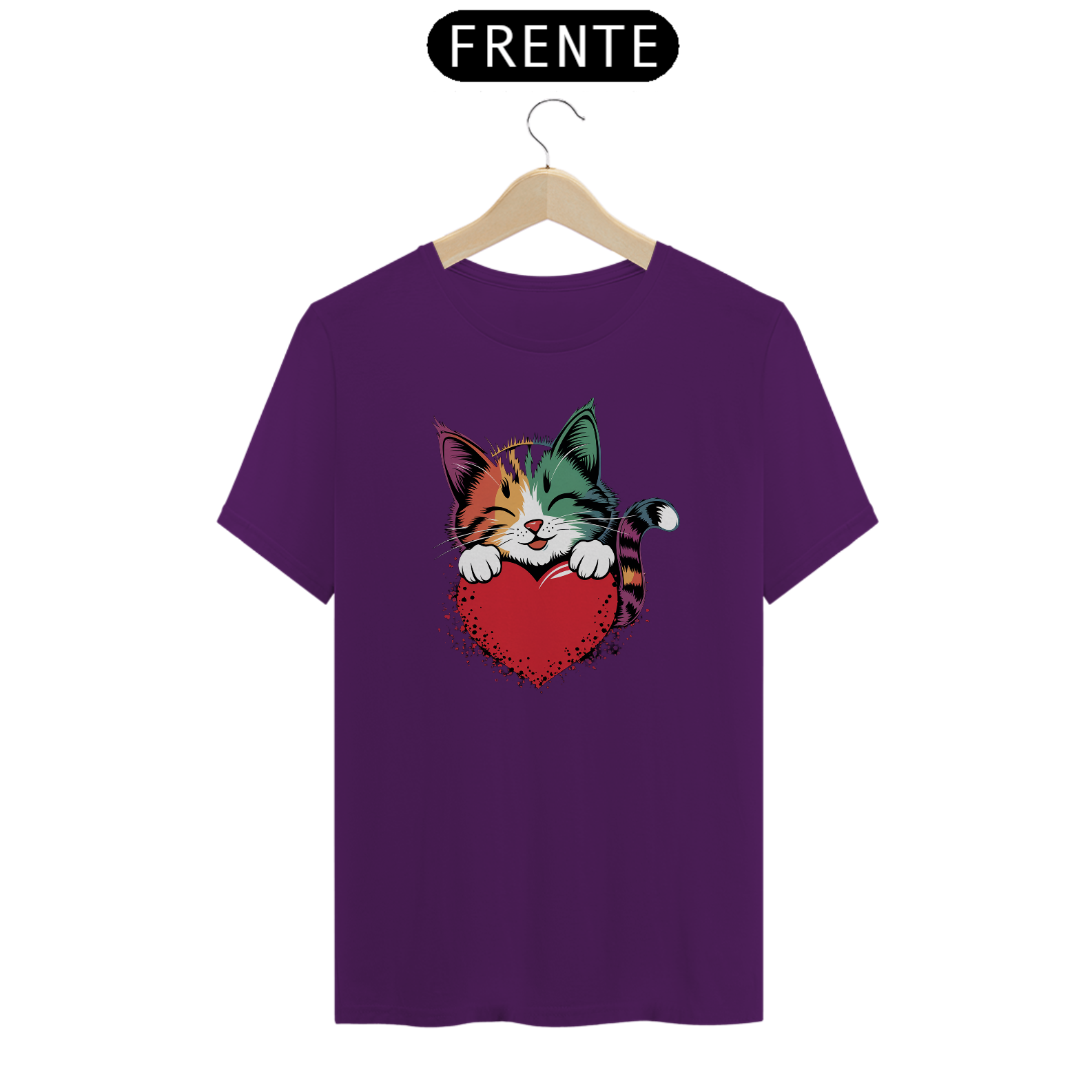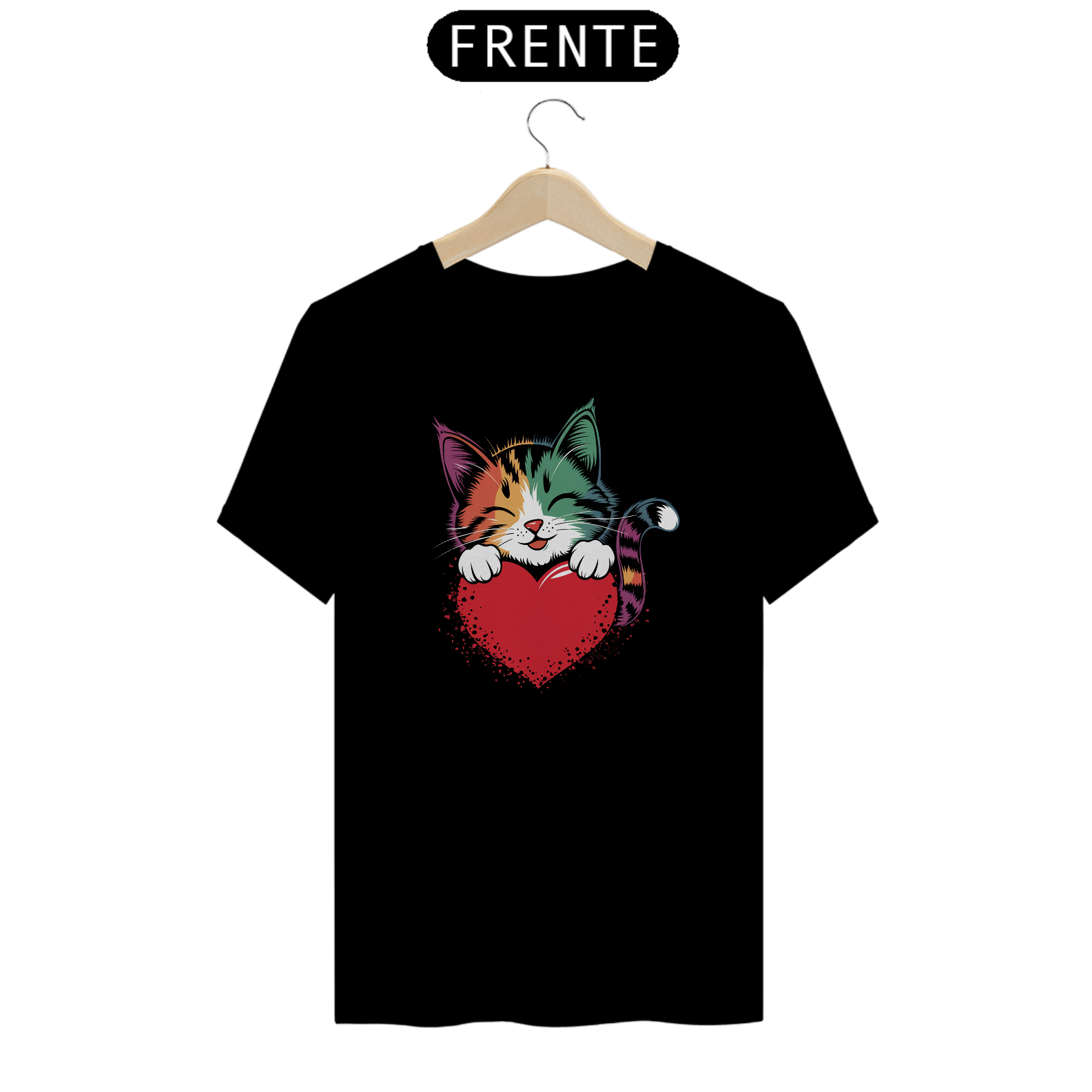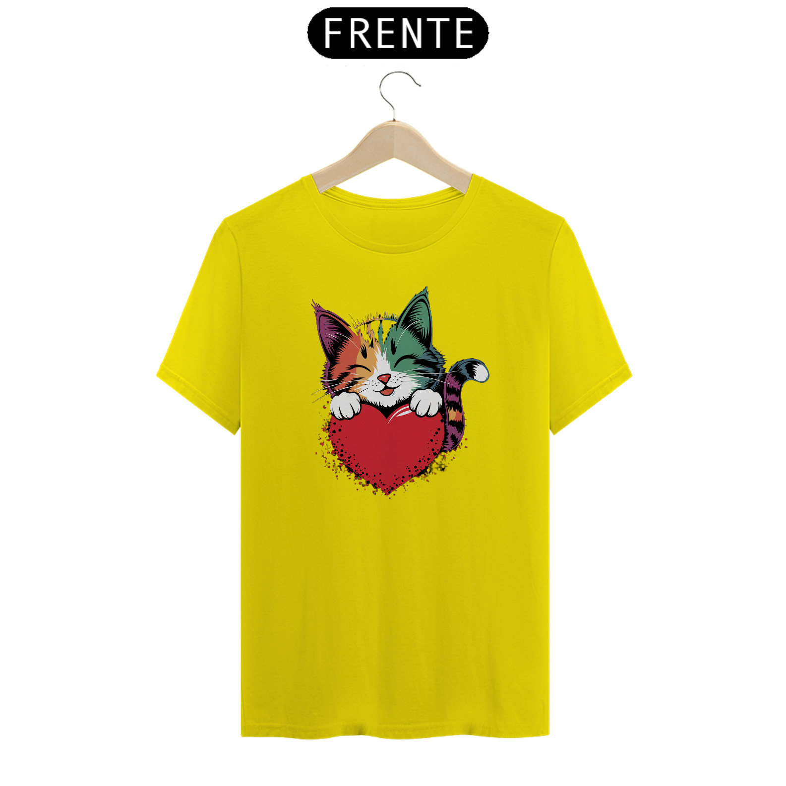 Uma estampa colorida e estilizada de um gato fofo com tons de arco-íris e padrões ousados ​​de pinceladas cobrindo seu pelo. O gato está descansando suas patas dianteiras em um coração vermelho brilhante e está dando uma expressão calorosa e amorosa, com seus olhos fechados como se estivesse sorrindo. Oste design exala uma vibração alegre e afetuosa, perfeita para o Dia dos Namorados ou amantes de gatos.