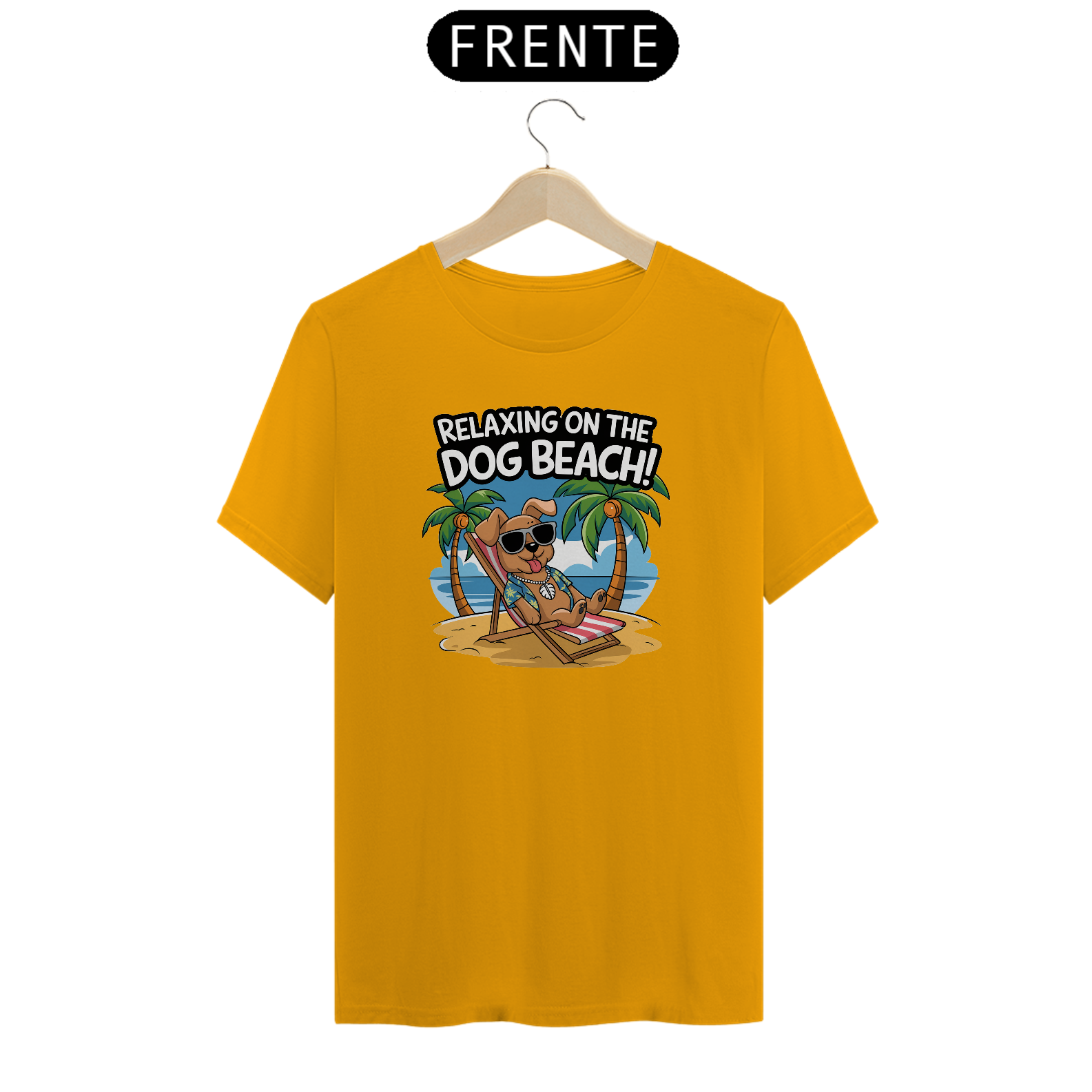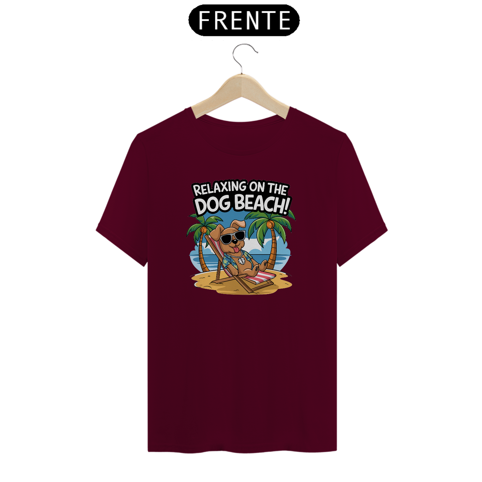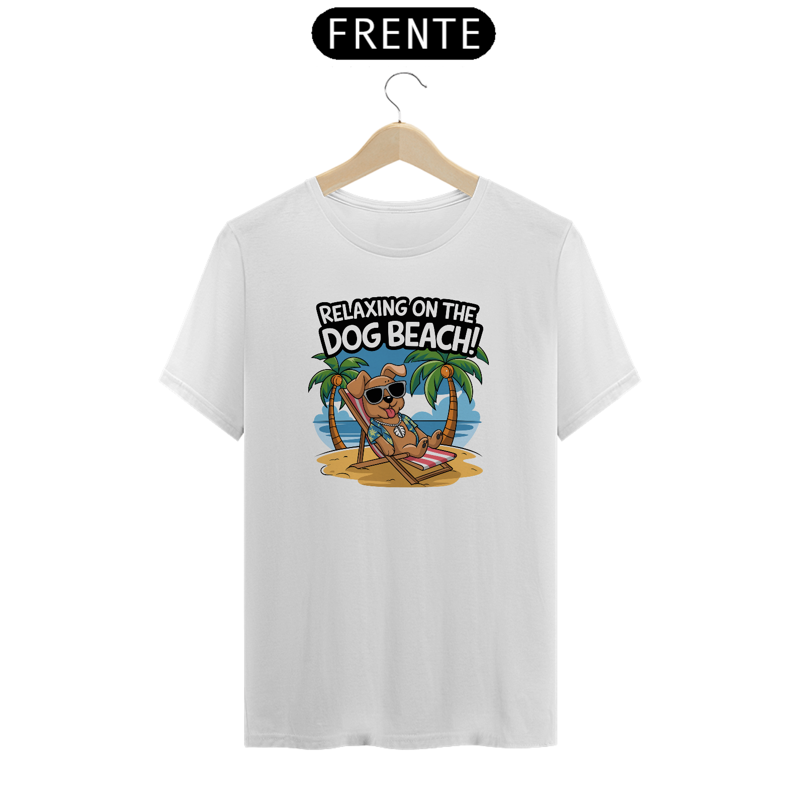 Uma estampa de um cachorro com óculos escuros descansando em uma cadeira de praia em uma praia arenosa. O cachorro está usando uma camisa havaiana e um colar com uma concha puka. O fundo contém palmeiras e um céu azul. O texto "Relaxando na Praia dos Cachorros!" está escrito em uma fonte divertida acima do cachorr