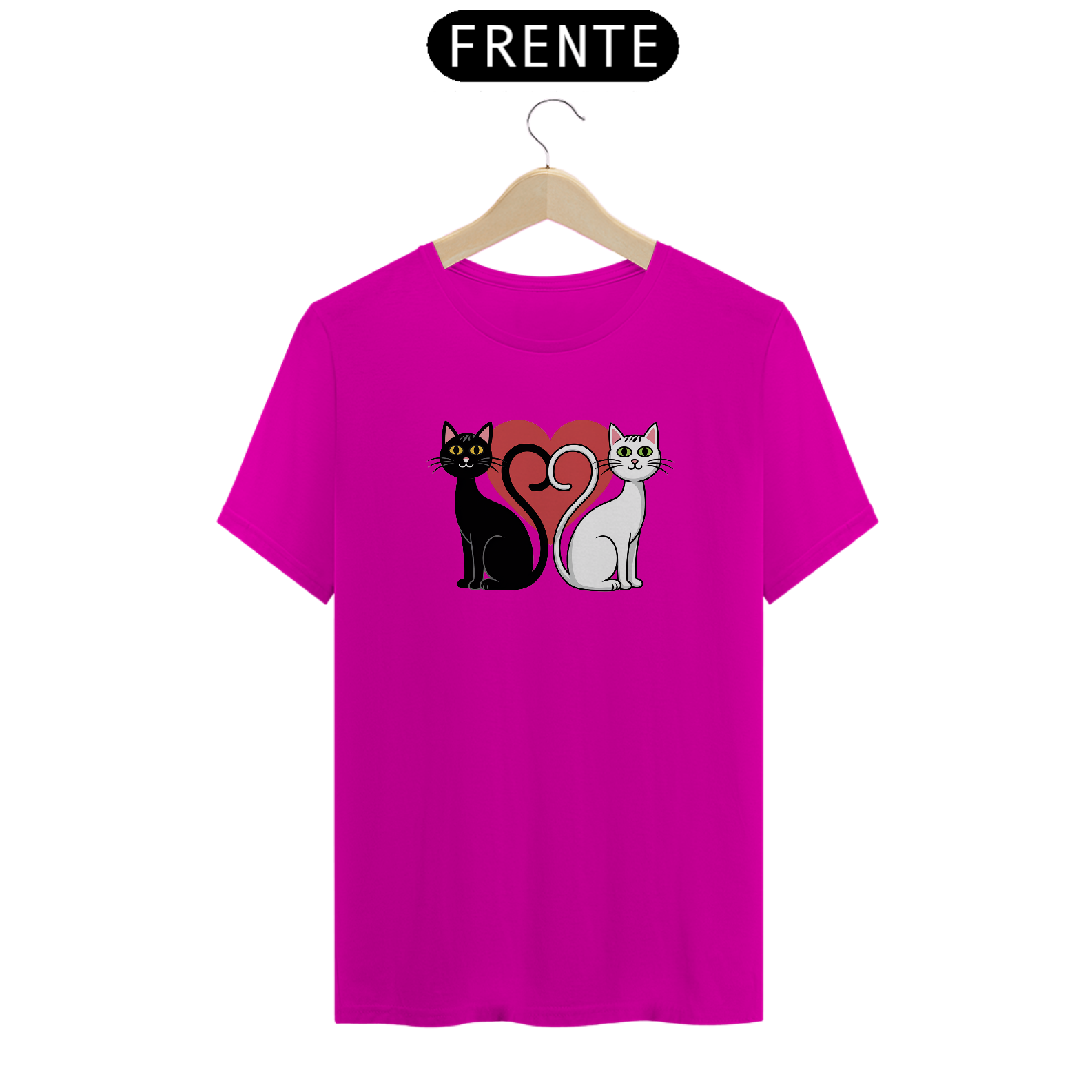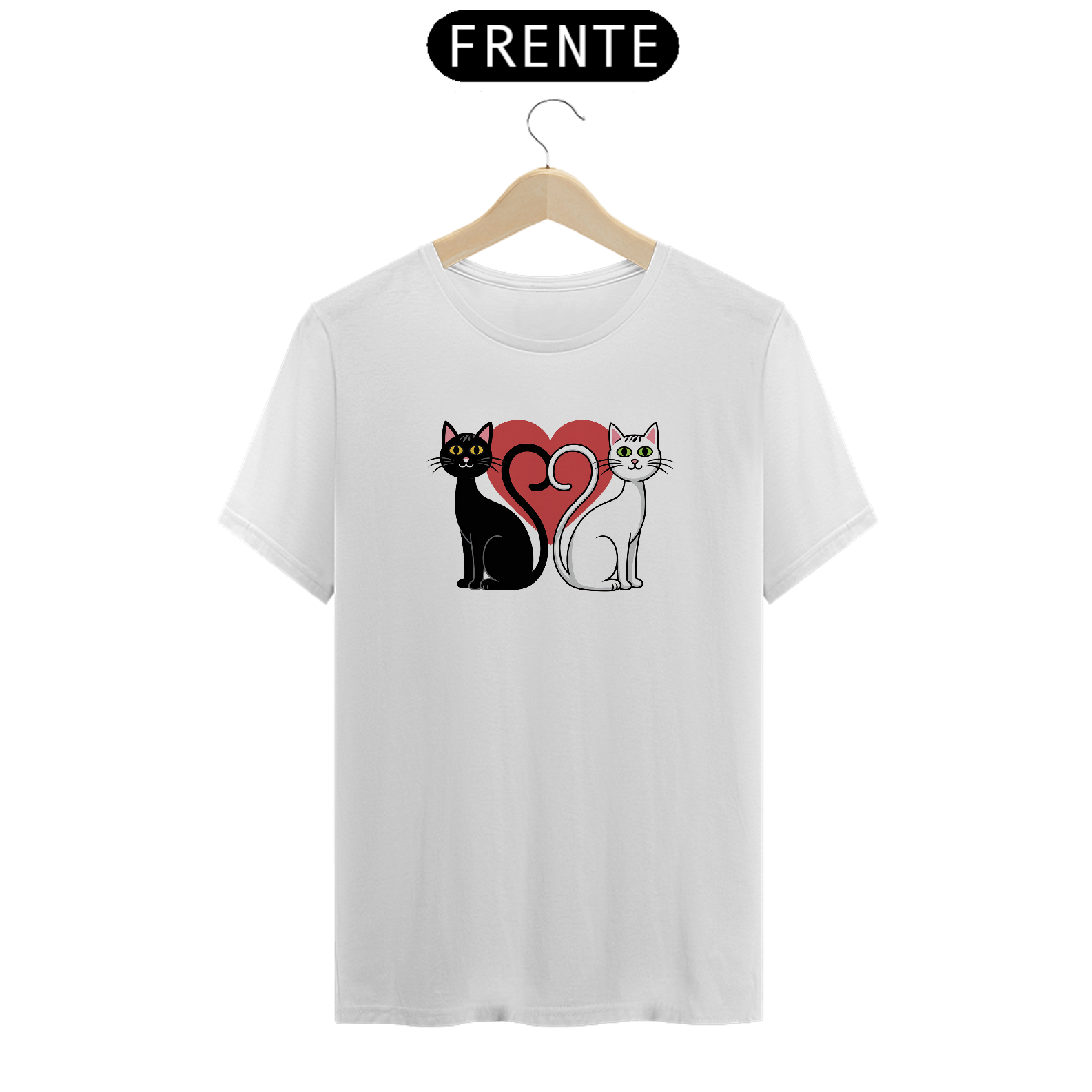 Uma estampa com uma silhueta de gato preto com um gato branco que fazem um coração com o rabo