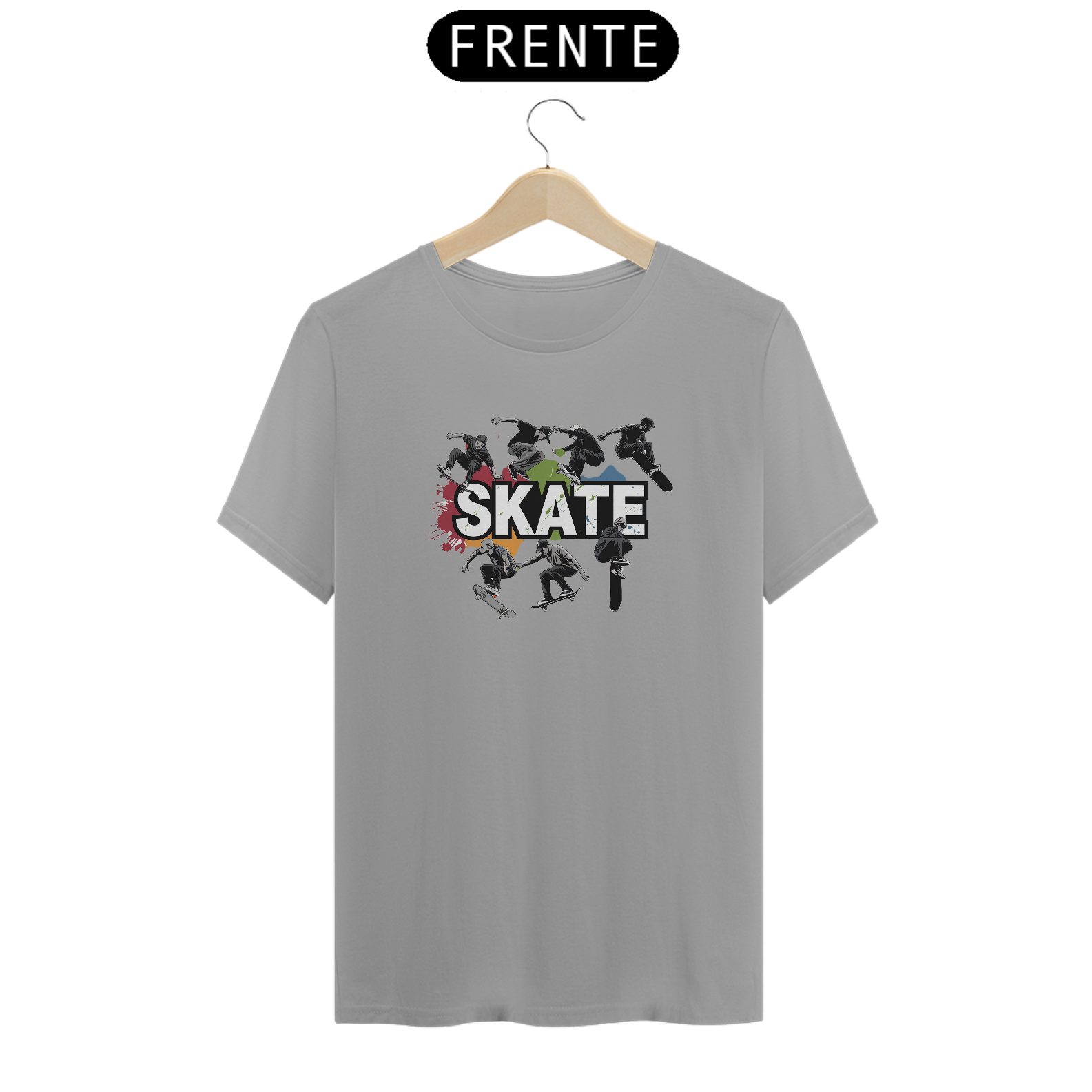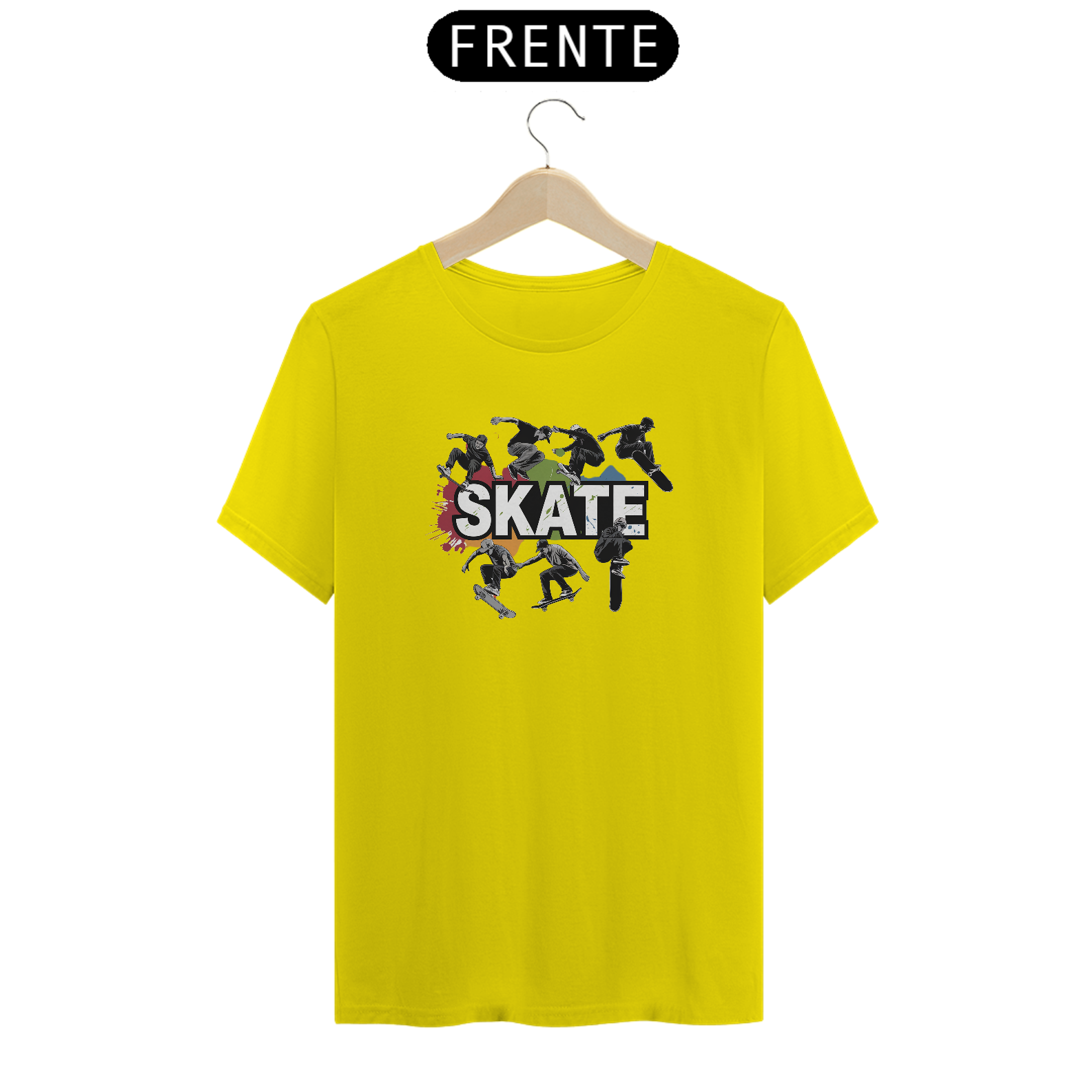 Uma estampa com o texto "Skate". Há vários skatistas em diferentes posições, alguns no ar com suas pranchas de lado. Há também respingos de cor ao redor do design.