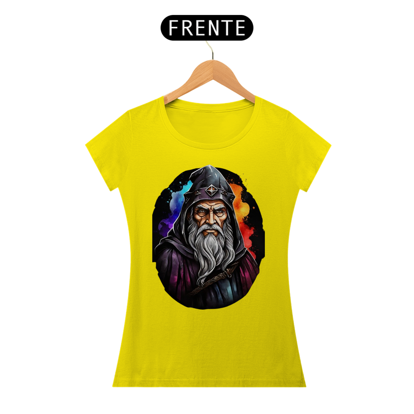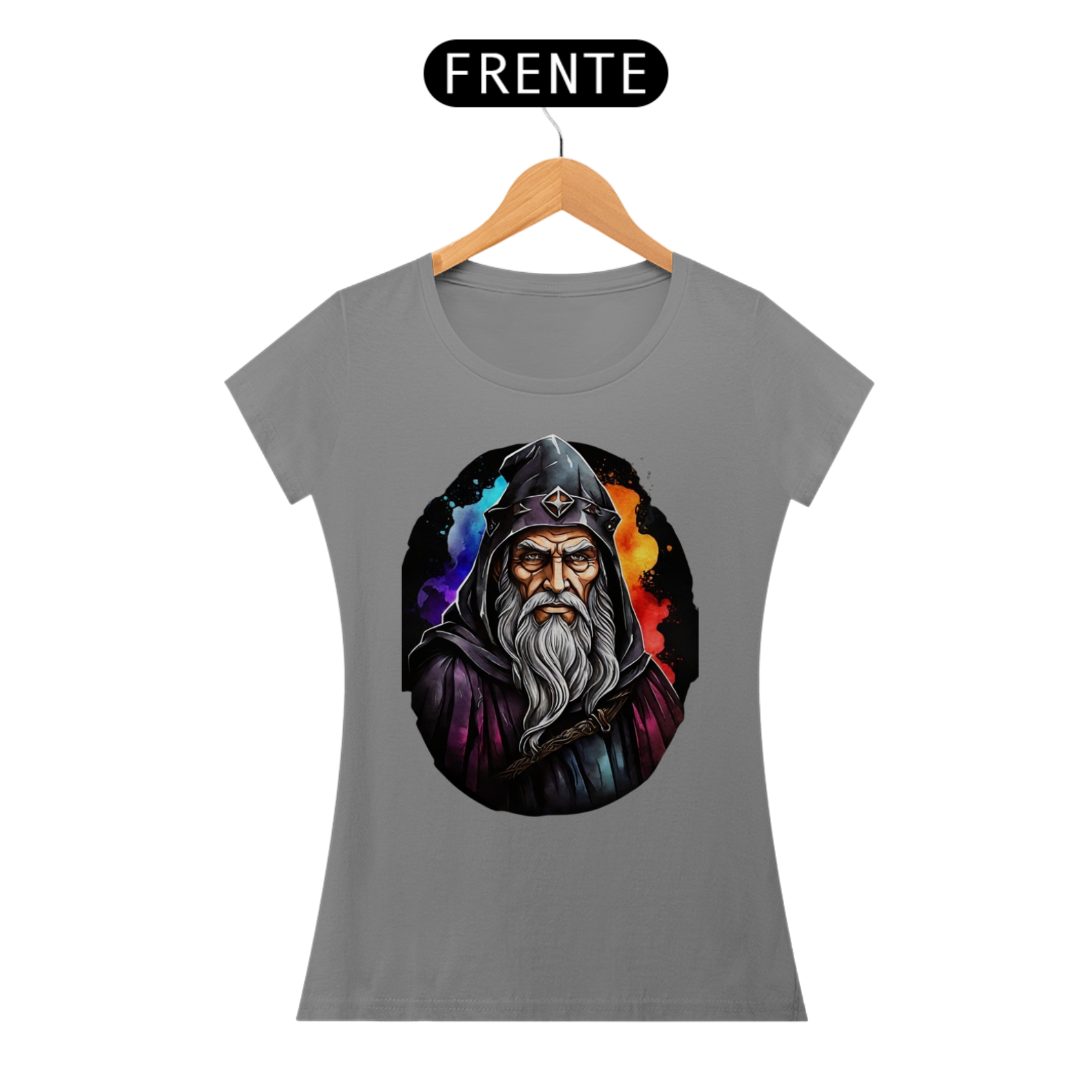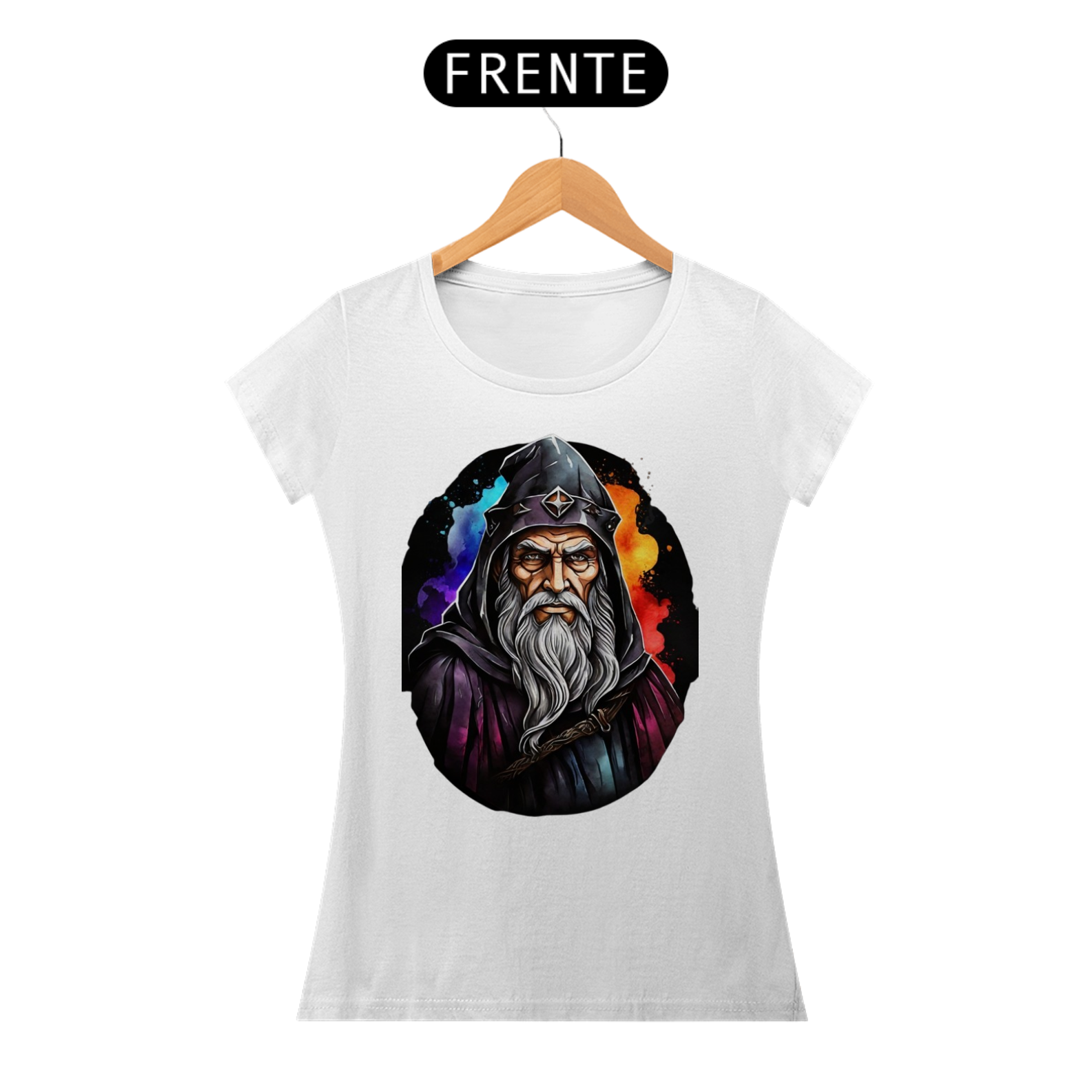 A figura imponente deste mago, com sua barba imortal e capuz místico, torna esta camiseta uma peça de destaque para amantes do universo medieval e fantástico.