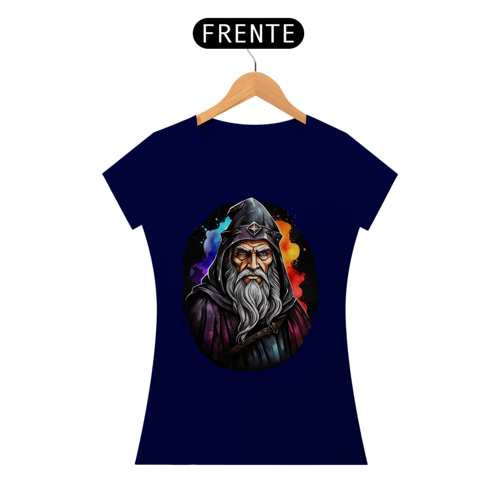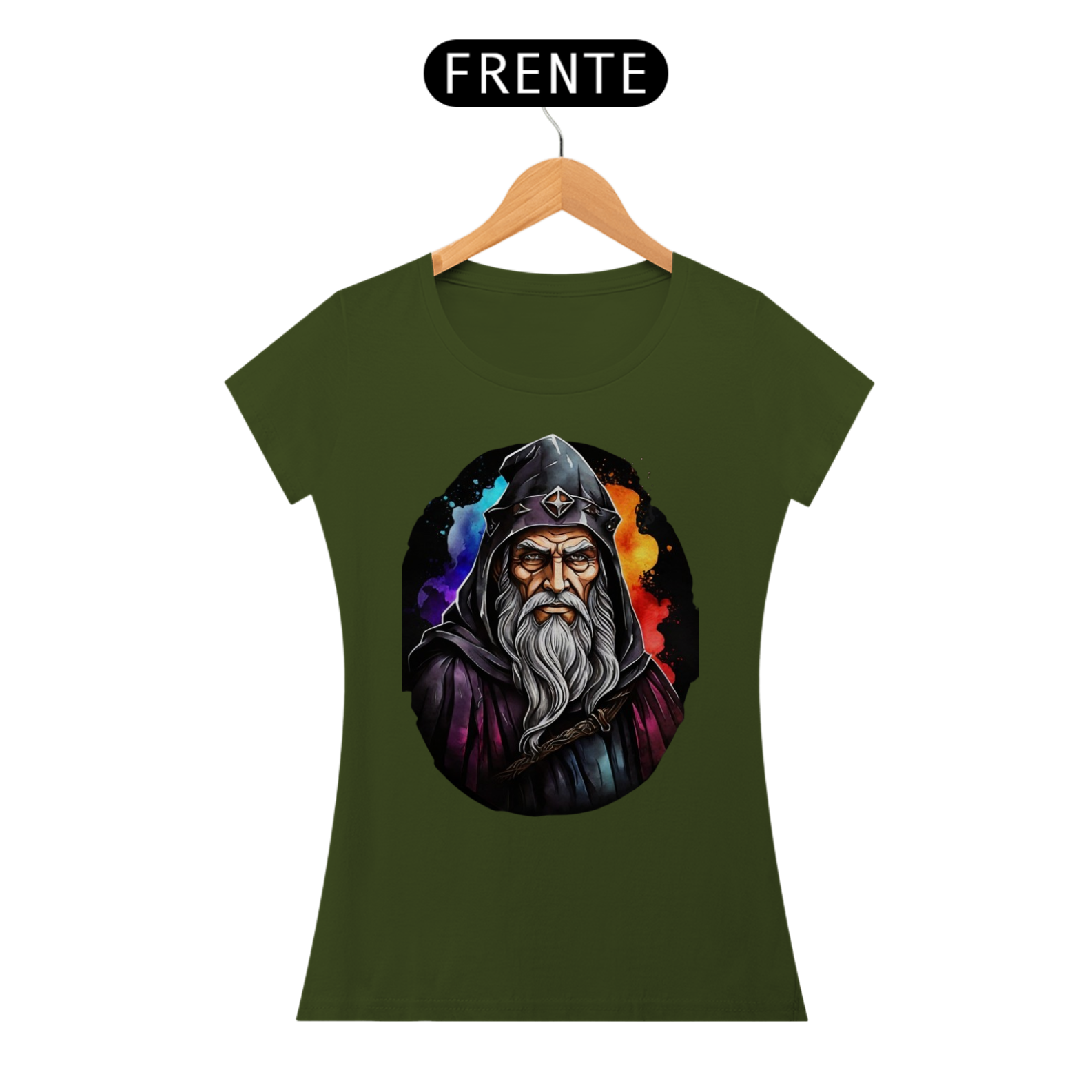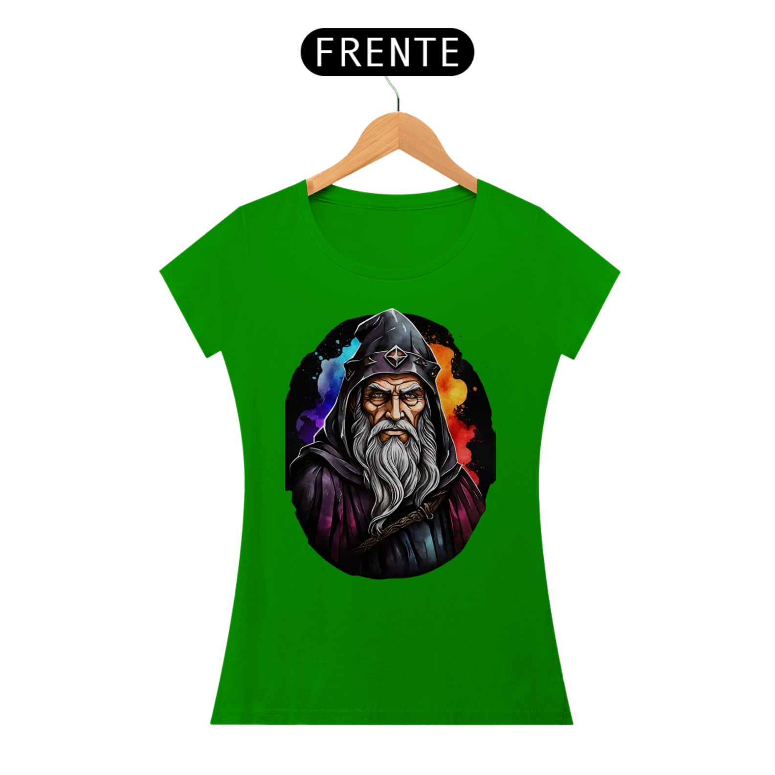 A figura imponente deste mago, com sua barba imortal e capuz místico, torna esta camiseta uma peça de destaque para amantes do universo medieval e fantástico.